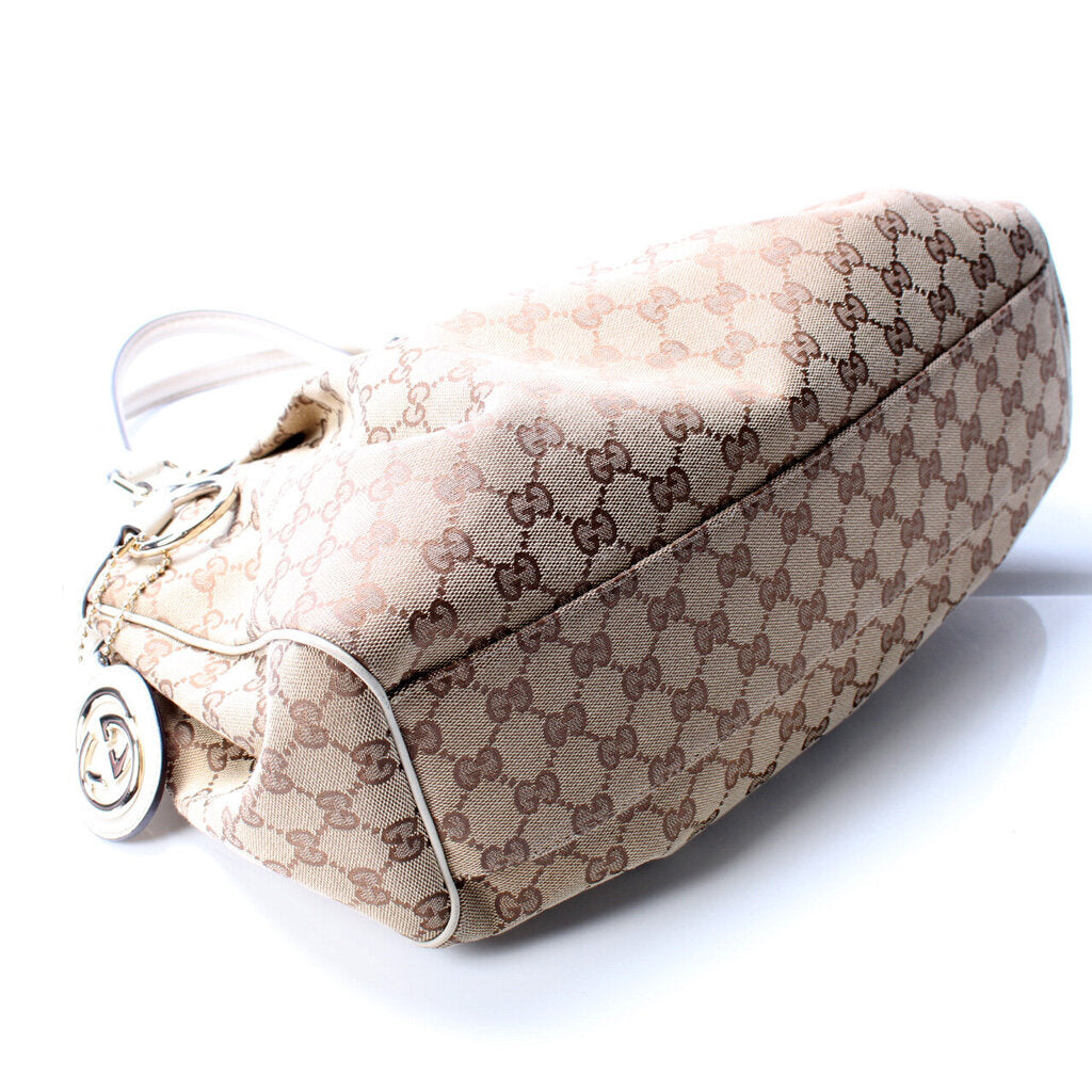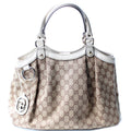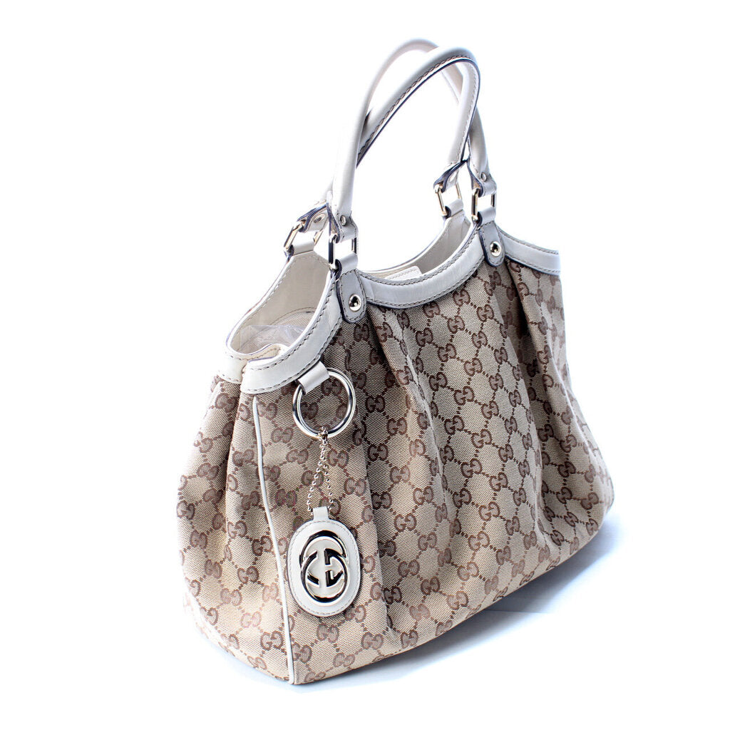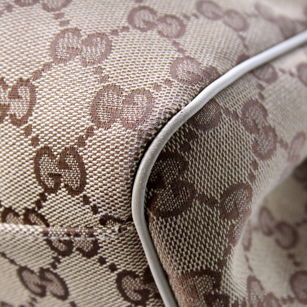 This Gucci Sukey Mediumis eye catching bag. The exterior is in the classic Gucci GG canvas.