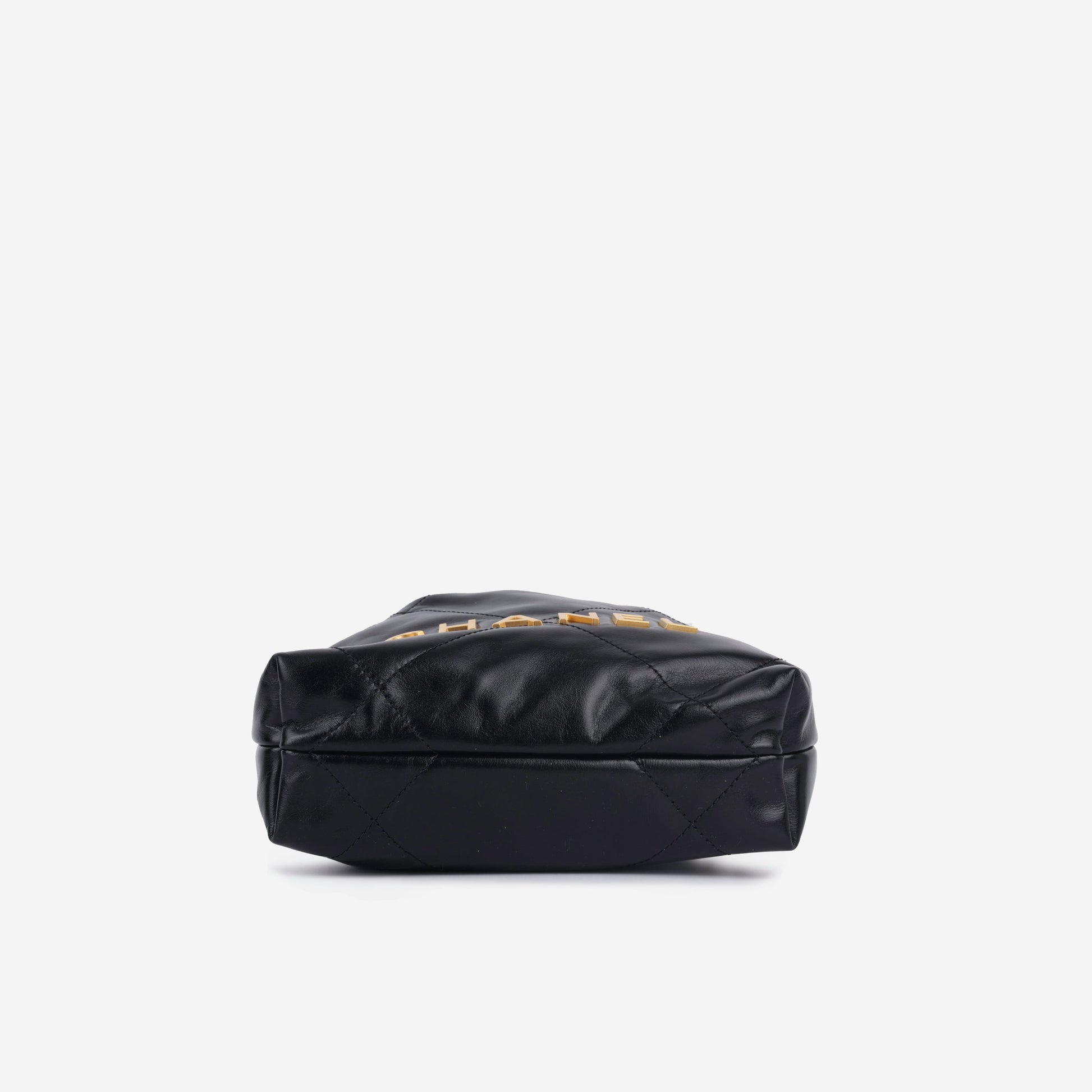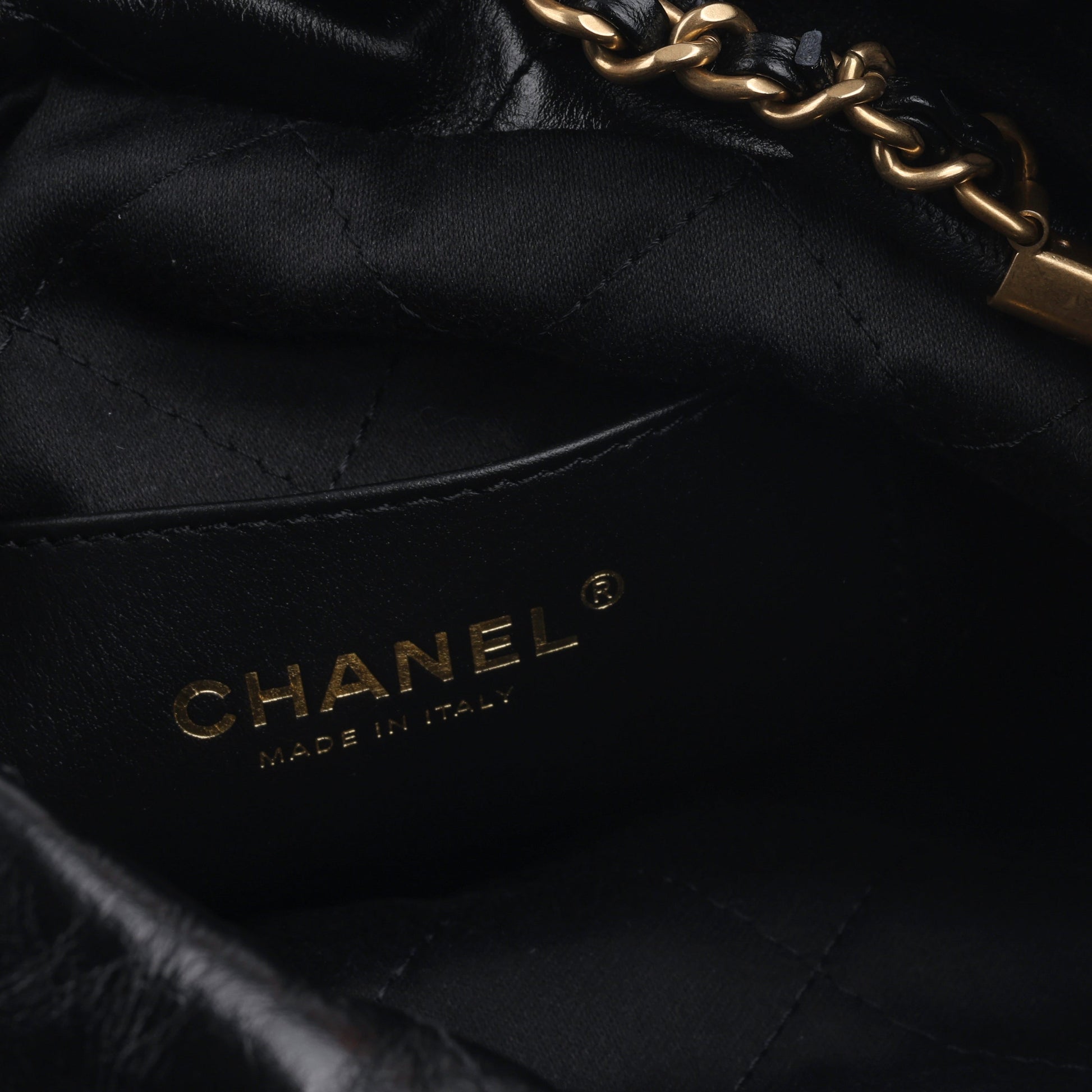 Carefully crafted from shiny crumpled calfskin leather, Chanel presents their 22 Mini. The chicest item for the lady that wants to carry everything around with them, this bag features Chanels classic interwoven back straps along with top handles to carry it handheld. This piece from 2023 is a well worthy addition to any luxury handbag collection.