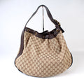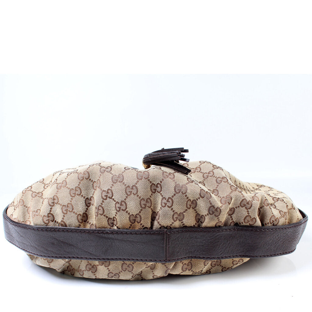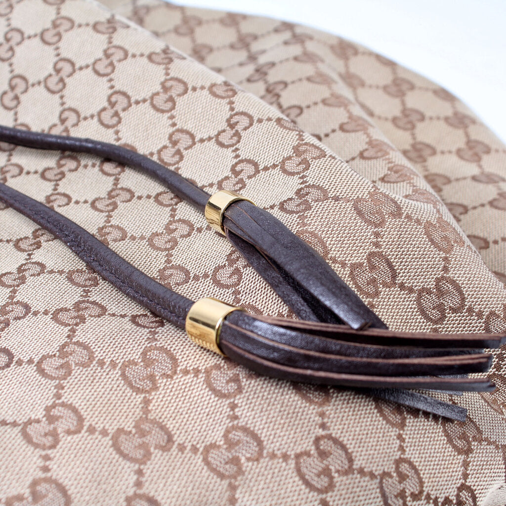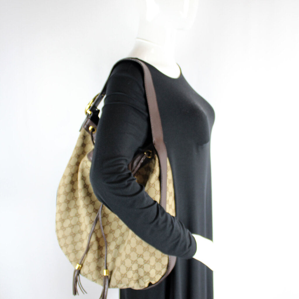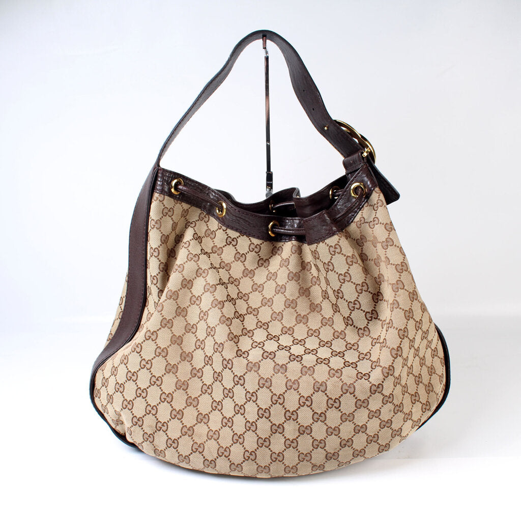This Gucci Drawstring Canvas Hobo is guaranteed 100% authentic. The exterior is in the classic Gucci GG canvas.
