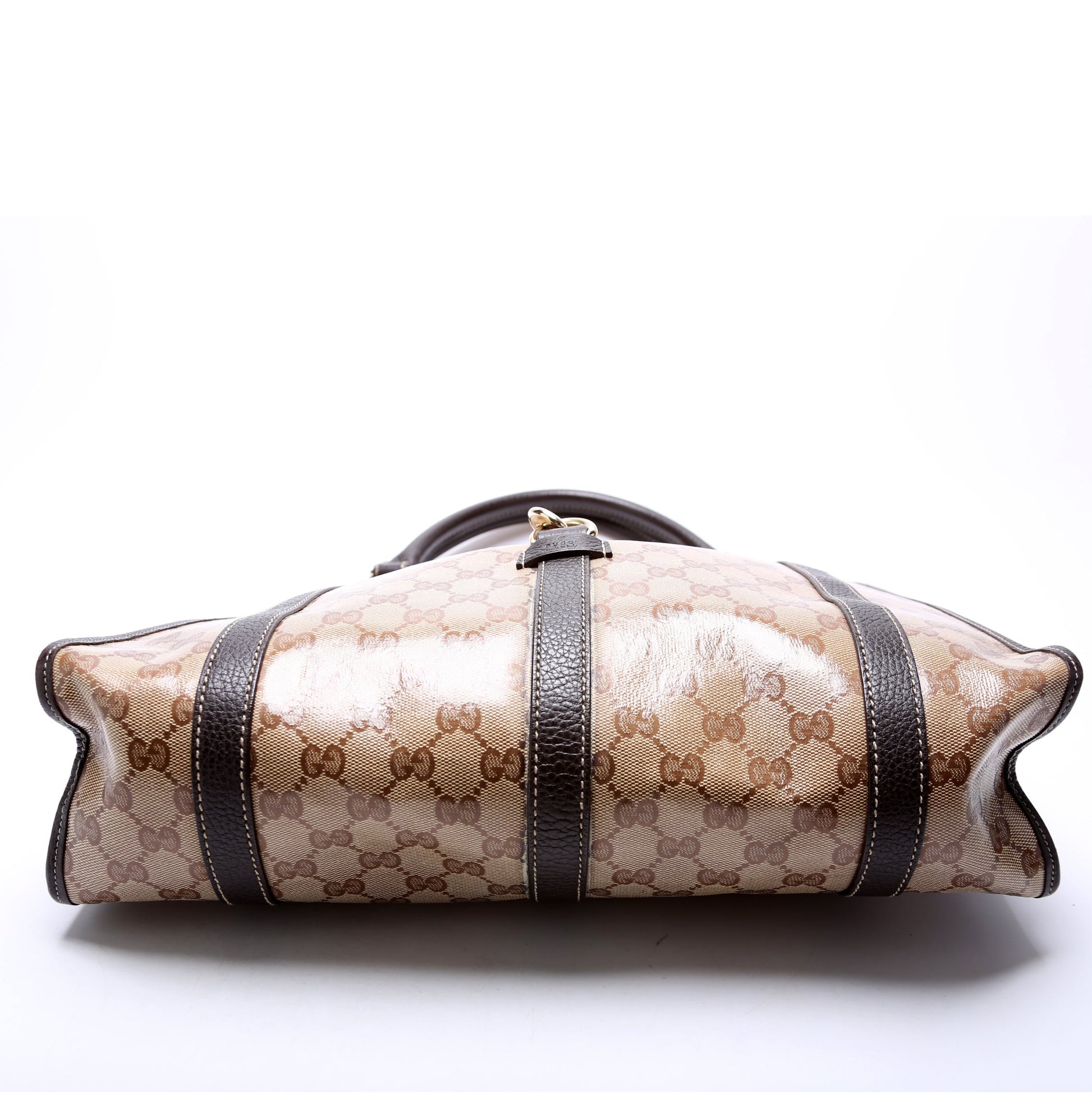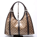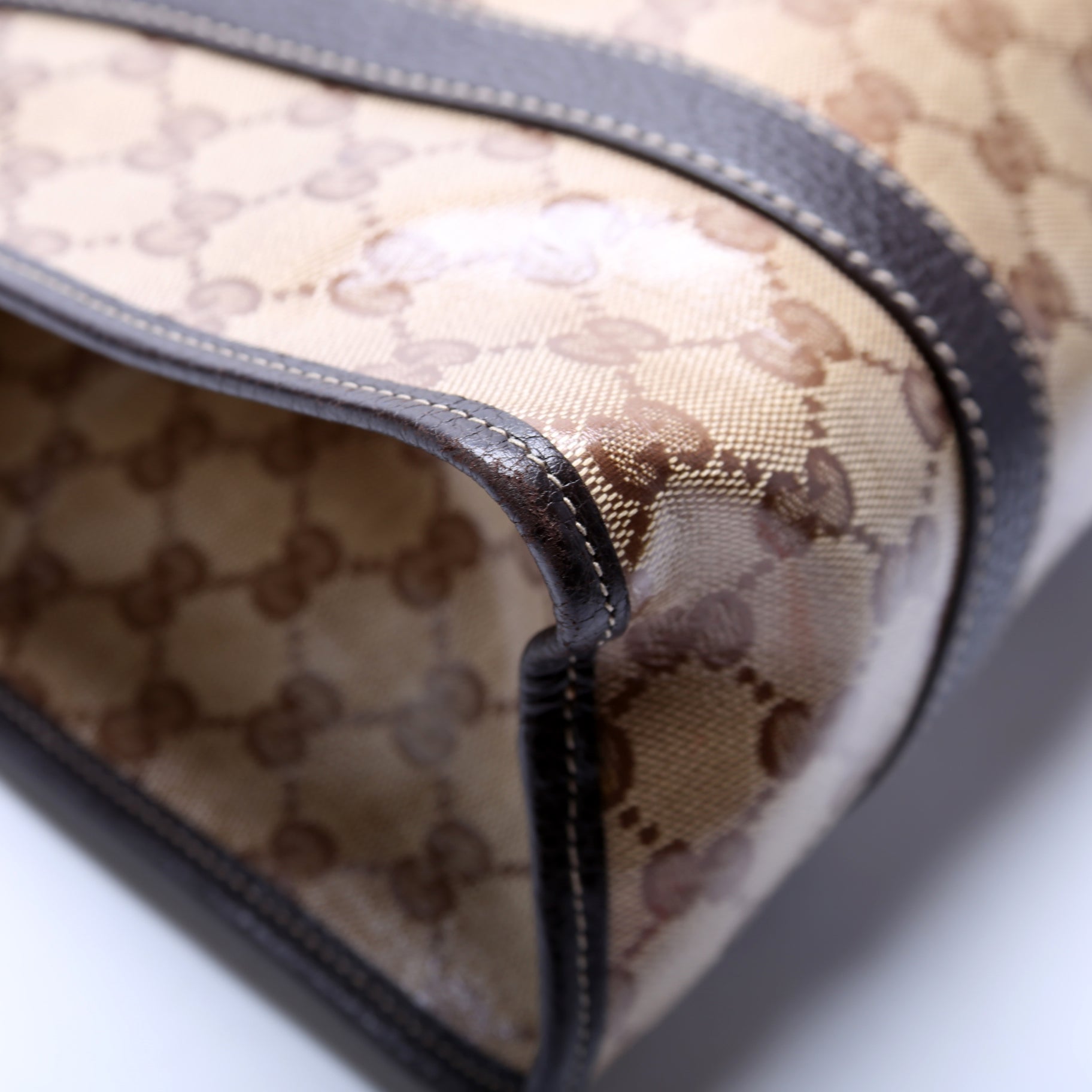 This Gucci GG Crystal Medium Joy Shoulder Bagis eye catching bag. The exterior is in the classic Gucci GG Crystal coated canvas.