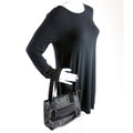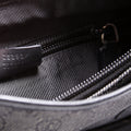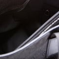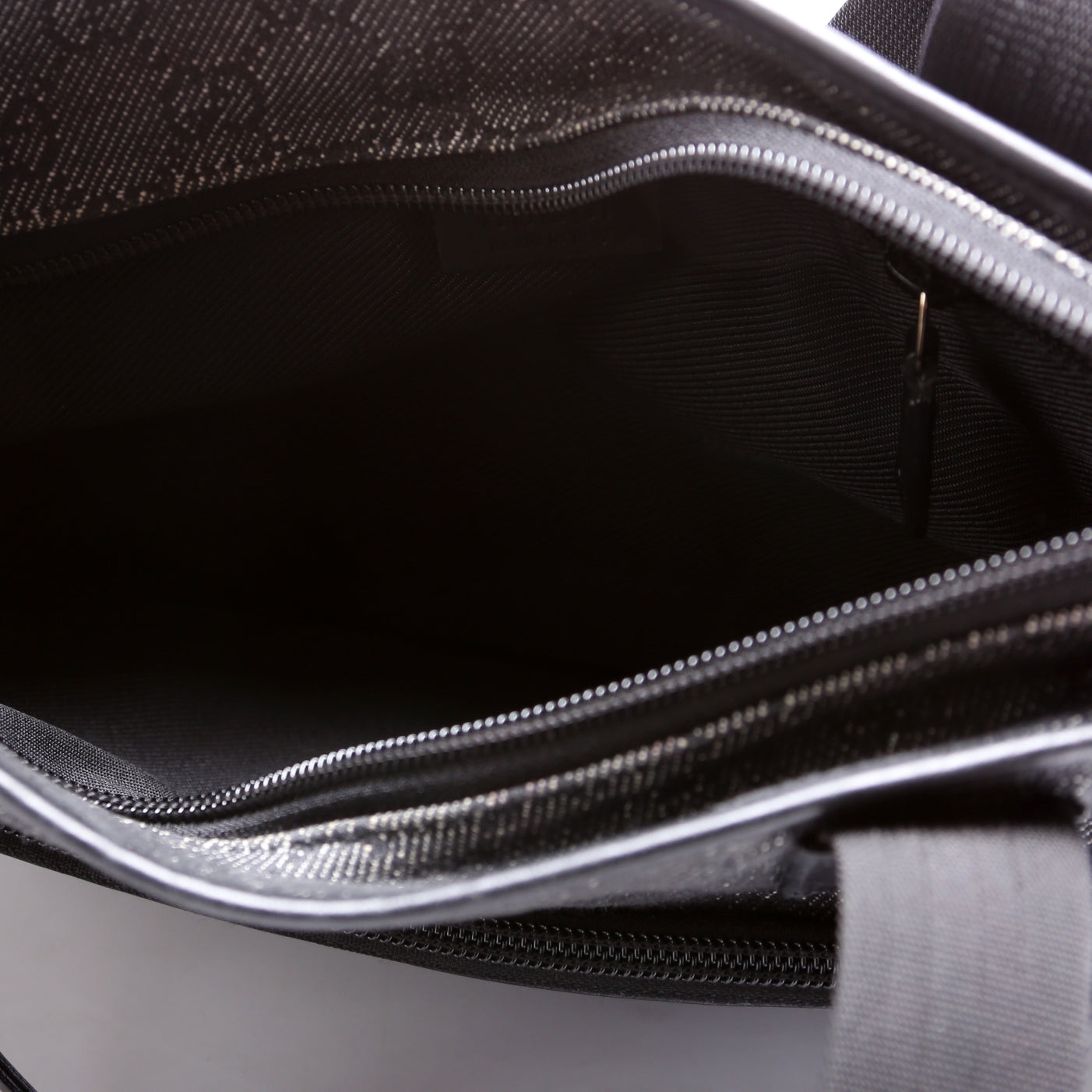 Exterior: The exterior denim canvas is free from wear. The leather corners show minor rubbing and wear. The exterior features one zip closure pocket. The leather shows scuffs throughout.