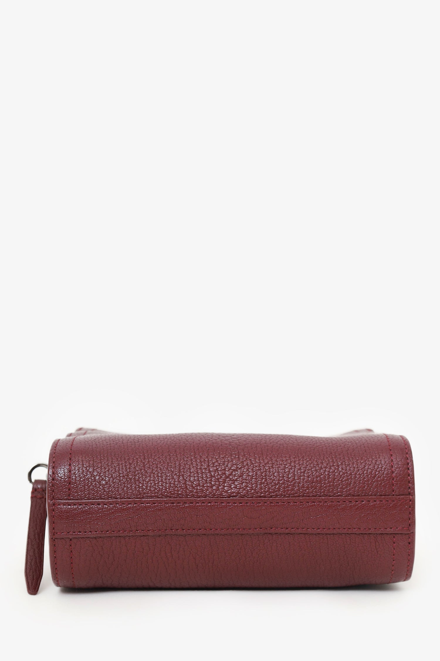 3.1 Phillip Lim Burgundy Leather Crossbody Bag. Top zip closure. Open interior with cotton lining and 4 rear wall card slip pockets. Dark-metal tone hardware. Tonal stitching.