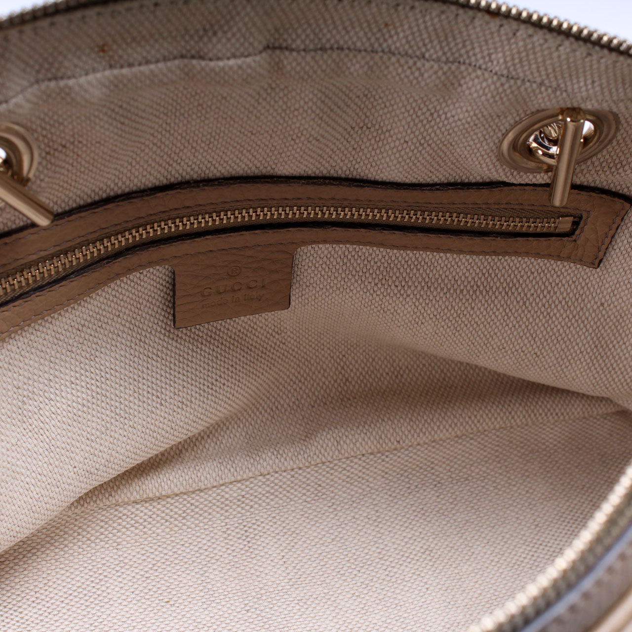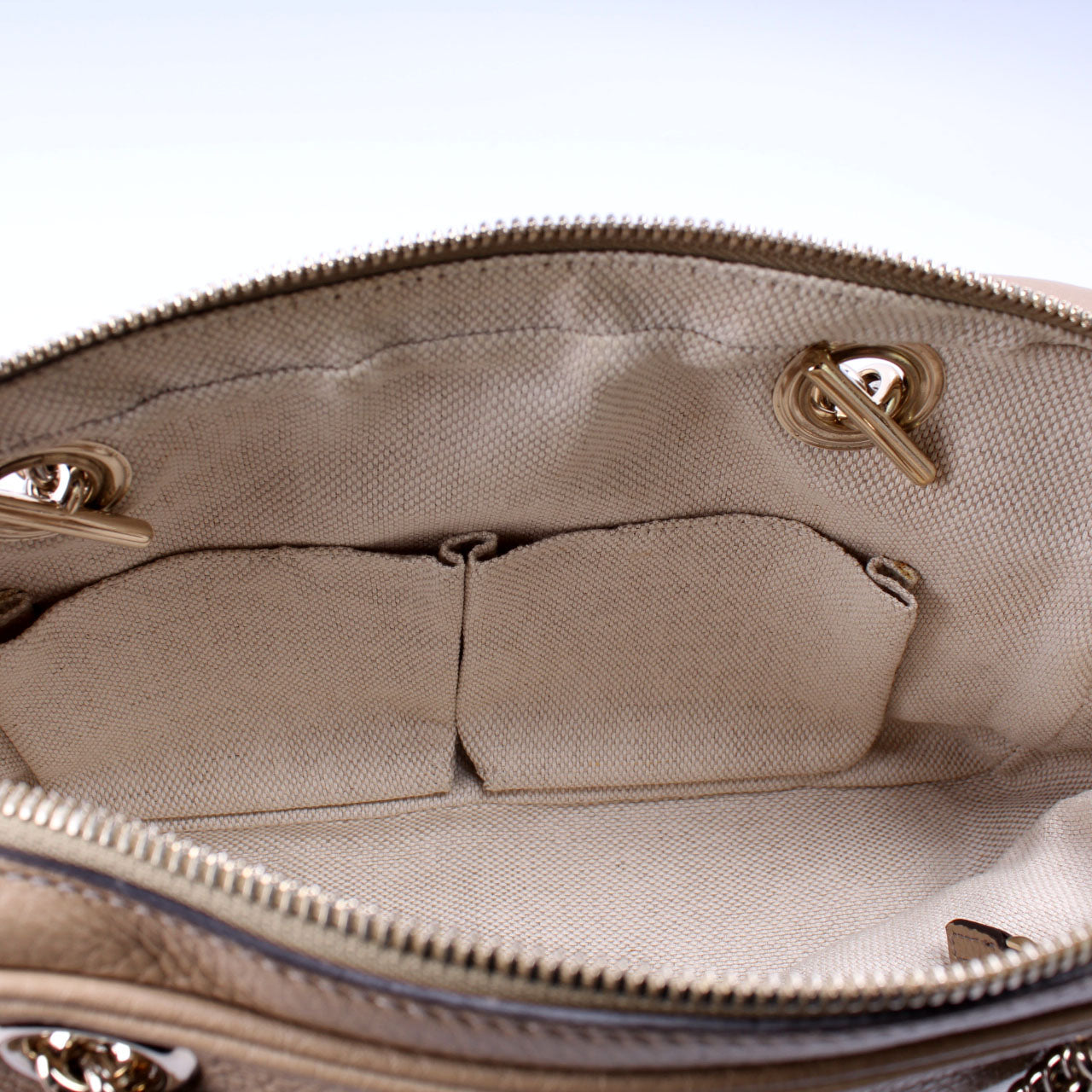 Interior: The interior is free of rips or tears. The interior features two open pockets and one zip closure pocket.