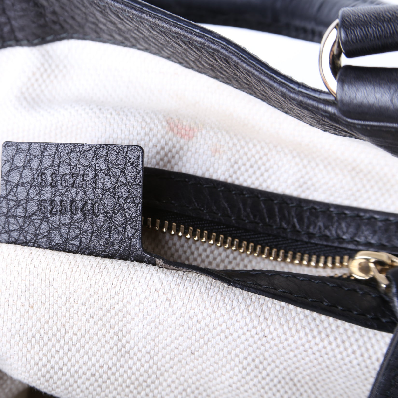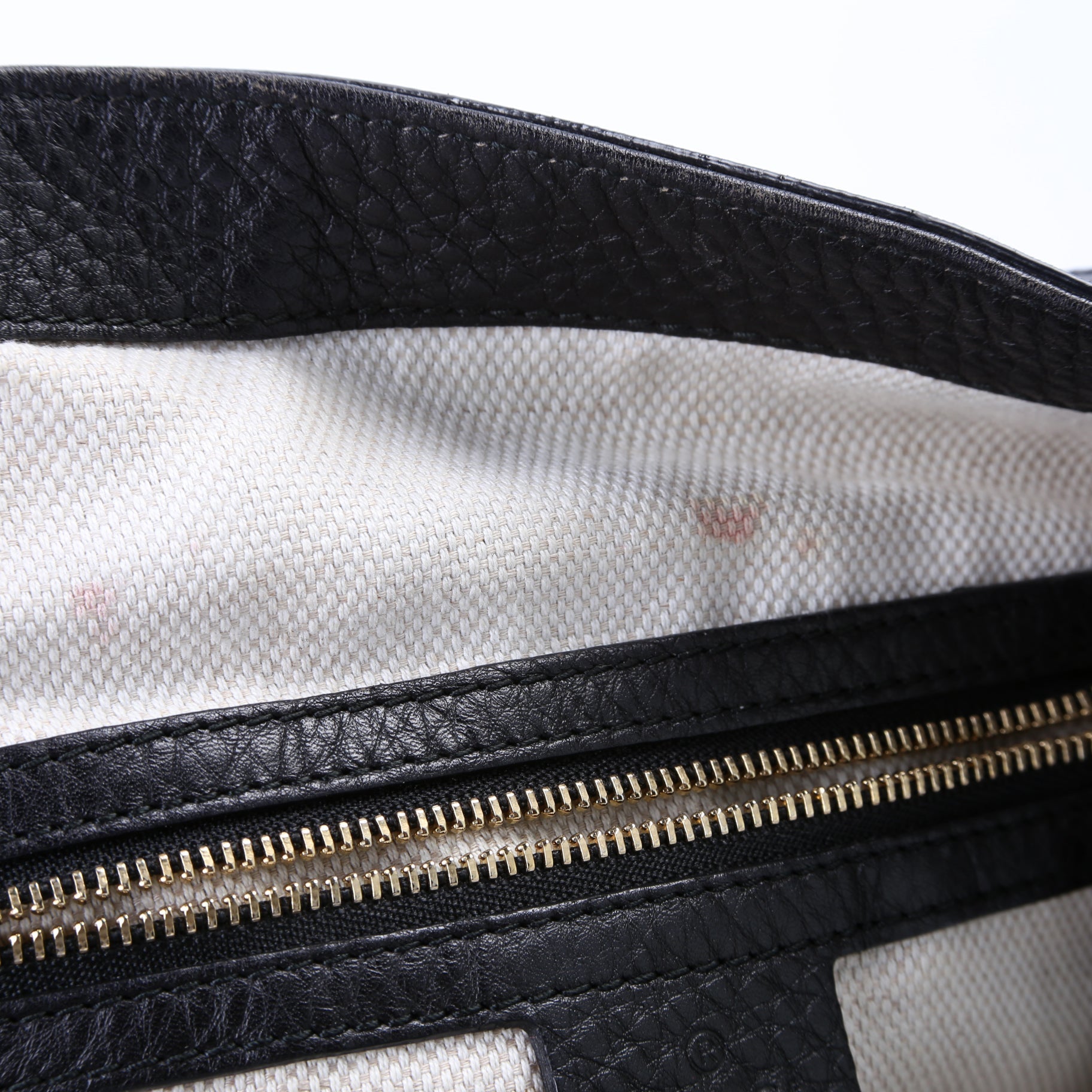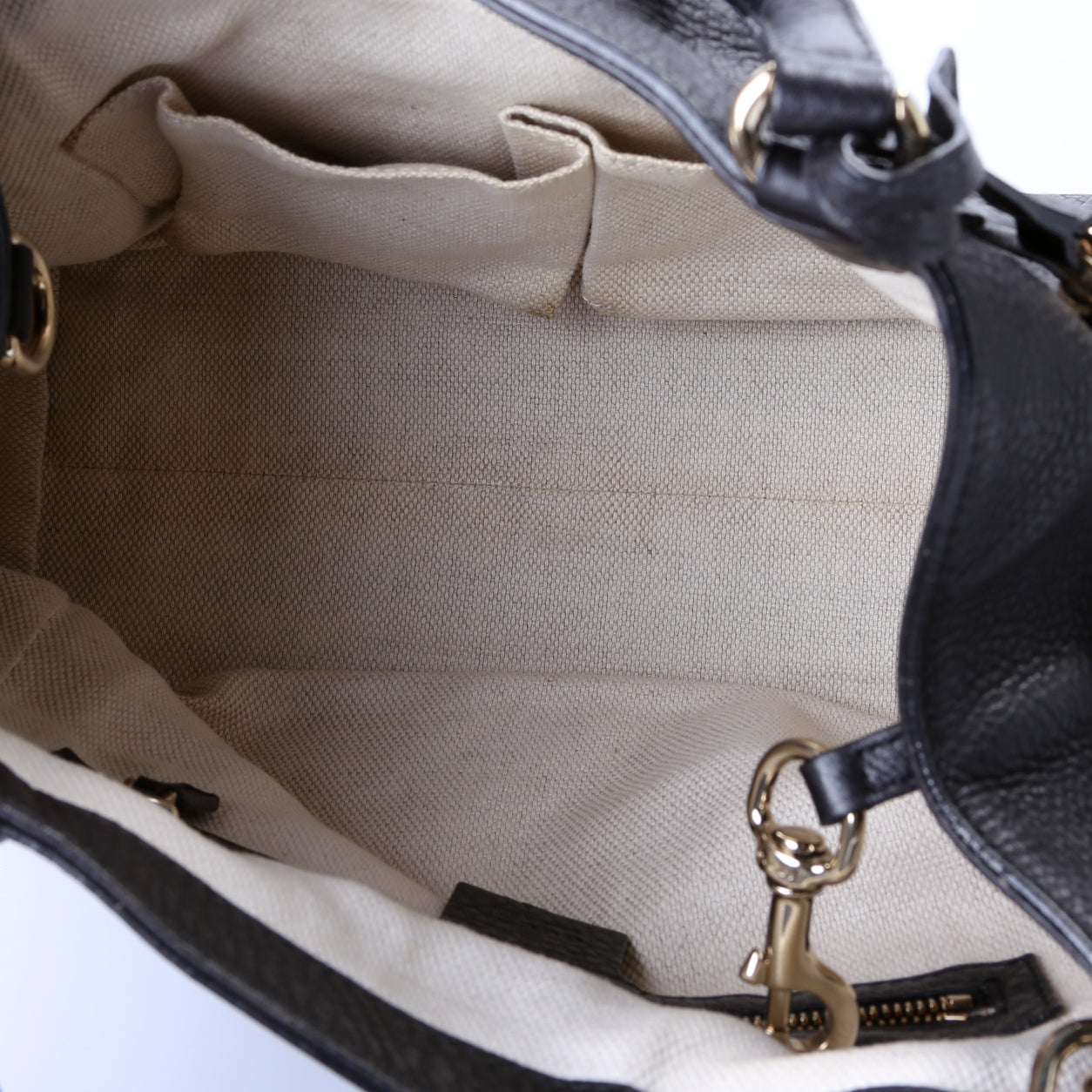 Interior: The interior shows minor staining. The interior features one zip closure pocket and two open pockets.