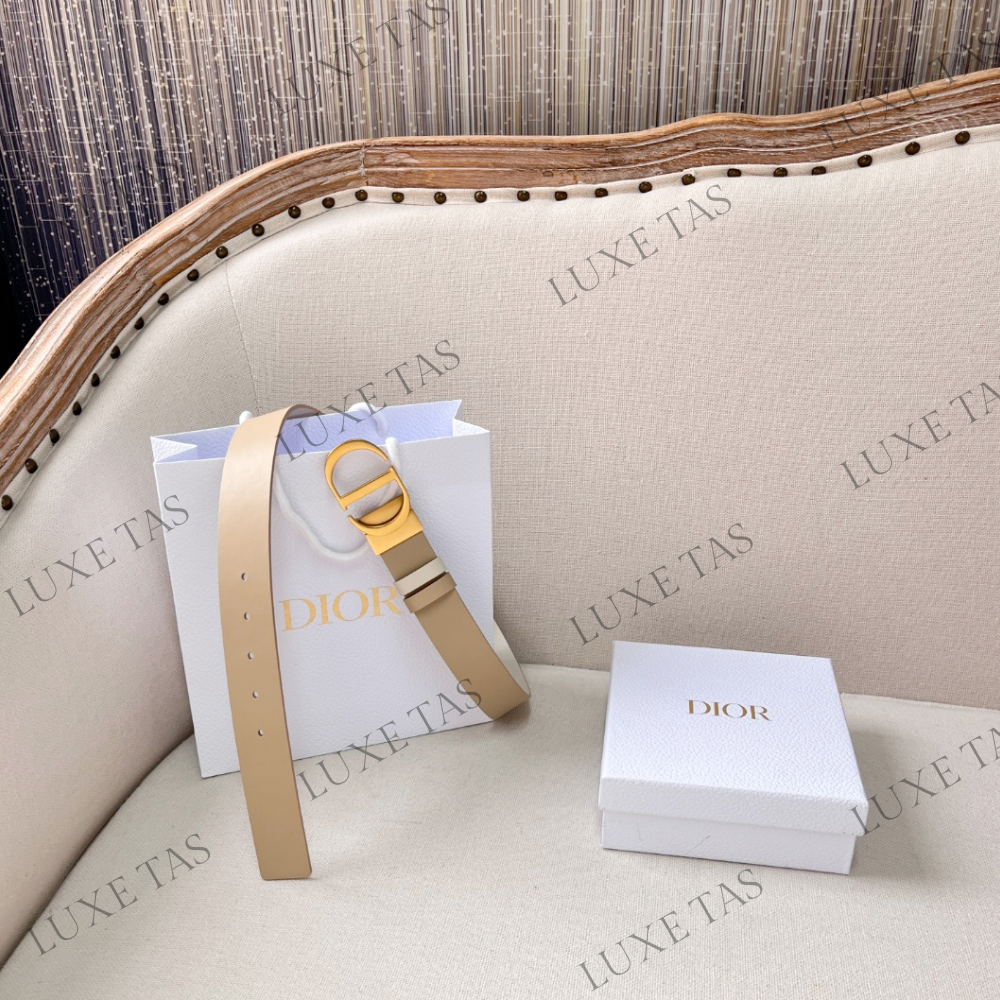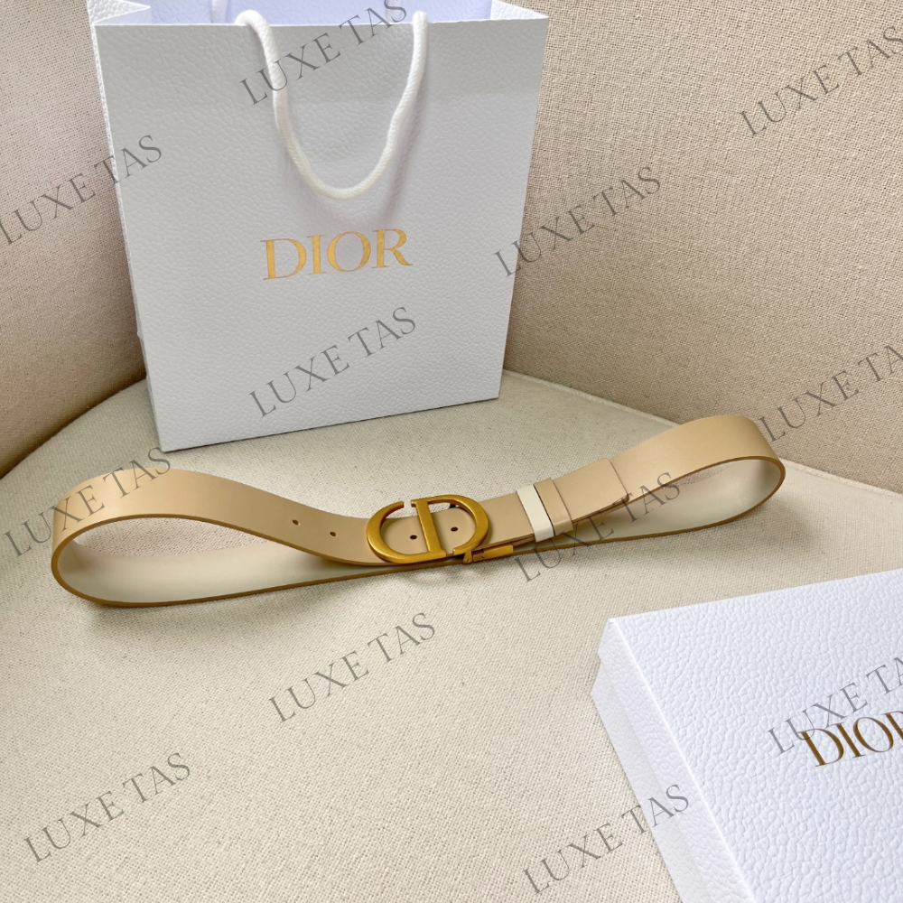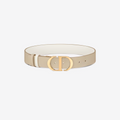 Indulge in the exquisite charm of the 30 Montaigne belt, inspired by the iconic bag of the same name. This reversible masterpiece showcases a versatile design with a swivel feature, allowing you to effortlessly switch between latte and beige smooth calfskin. Adorned with the signature shiny gold-finish metal C*D buckle, it exudes an aura of timeless elegance. The two removable loops offer endless styling possibilities, whether you prefer a tonal or contrasting look. From jeans to skirts to dresses, this timeless accessory beautifully accentuates the waist, becoming a versatile and sophisticated addition to your wardrobe.