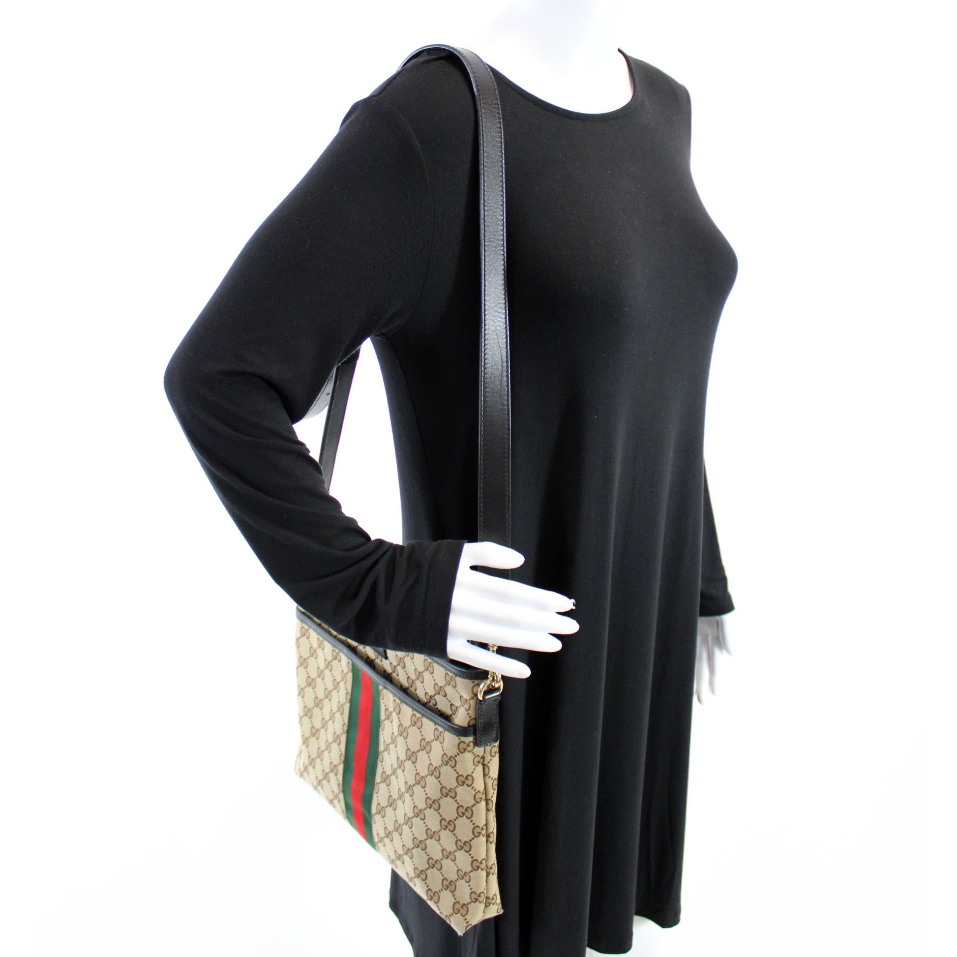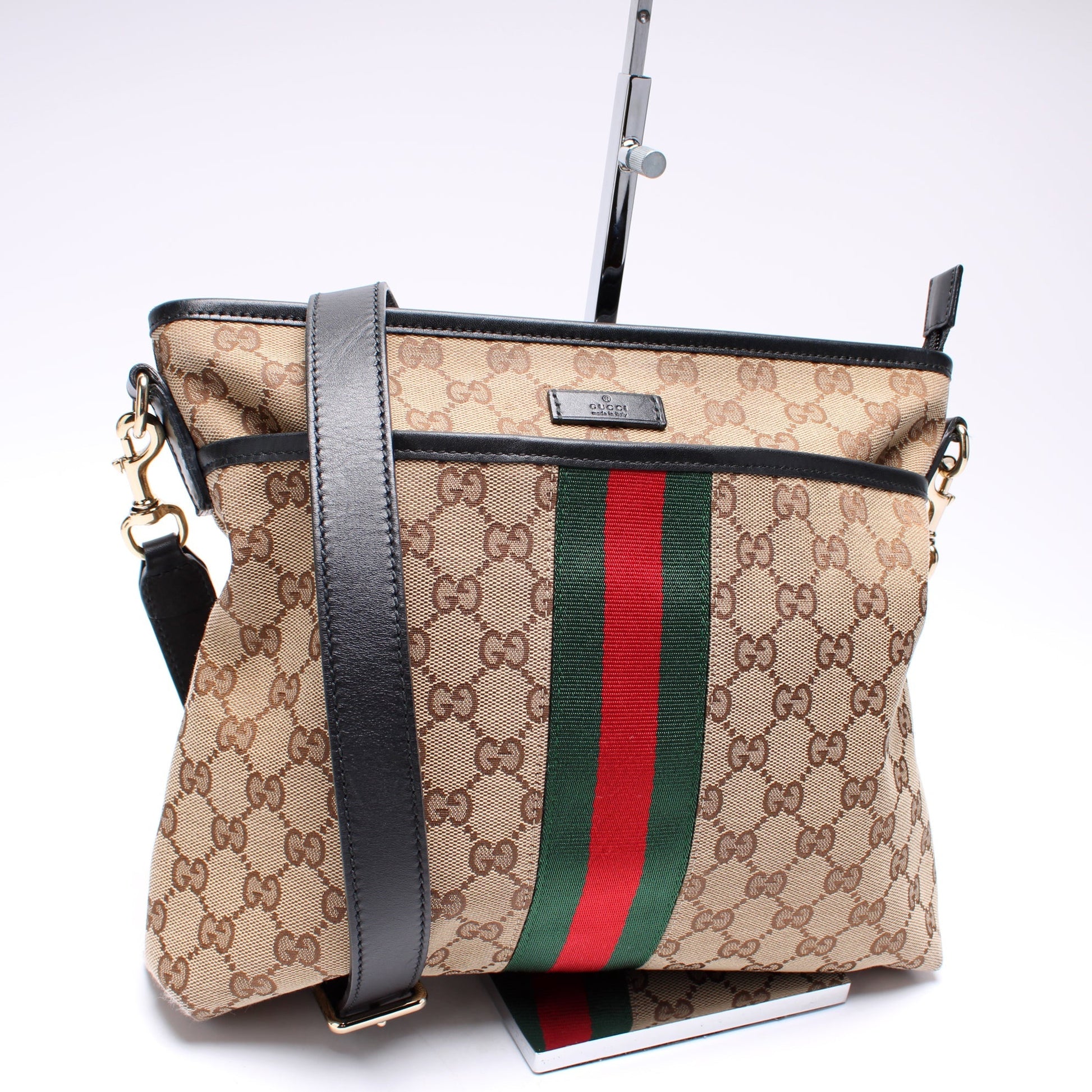 This Gucci GG Canvas Web Flat Messenger is d 100% . The exterior is in the classic Gucci GG canvas.