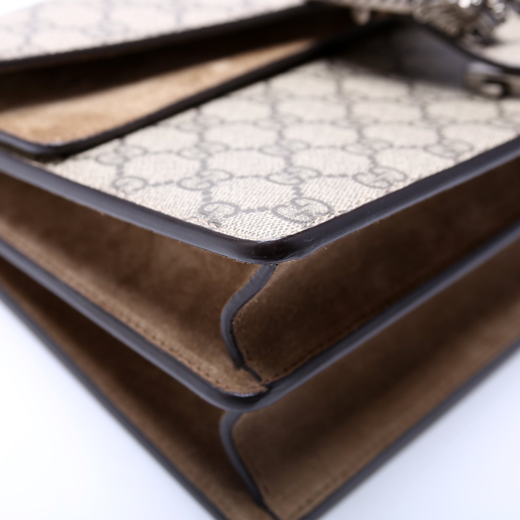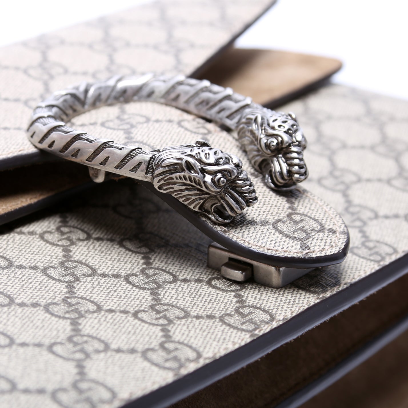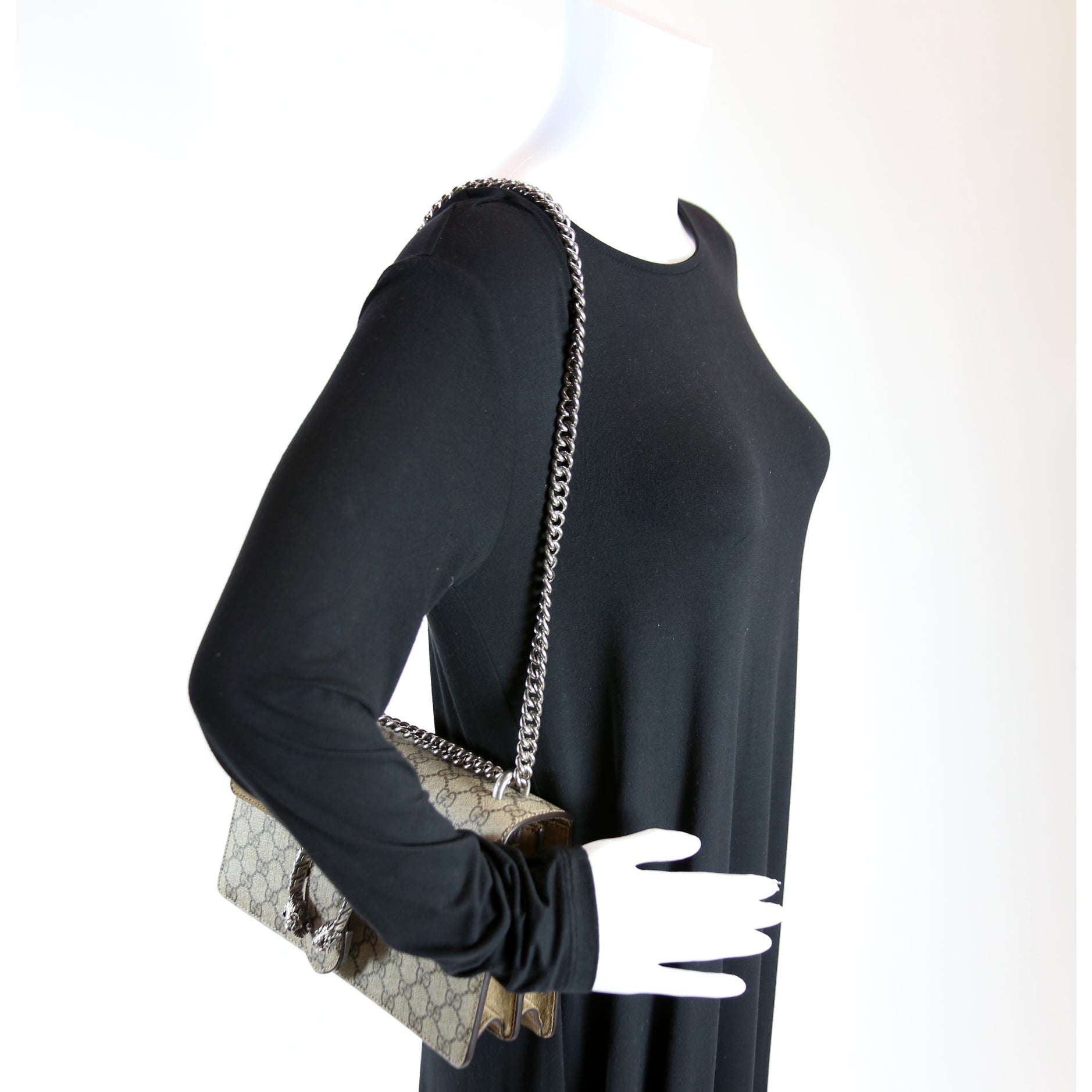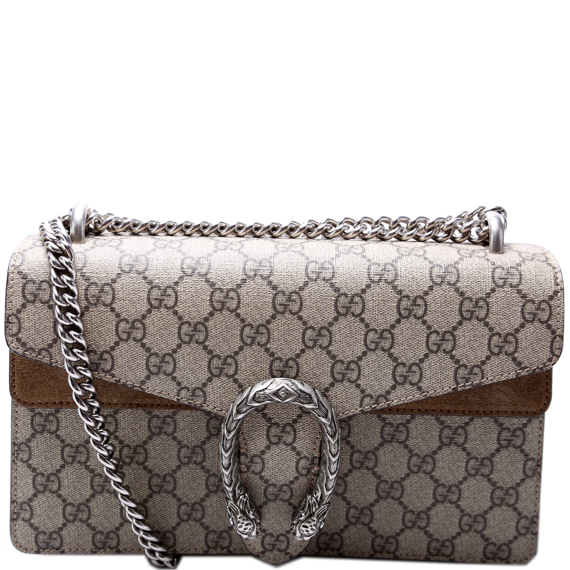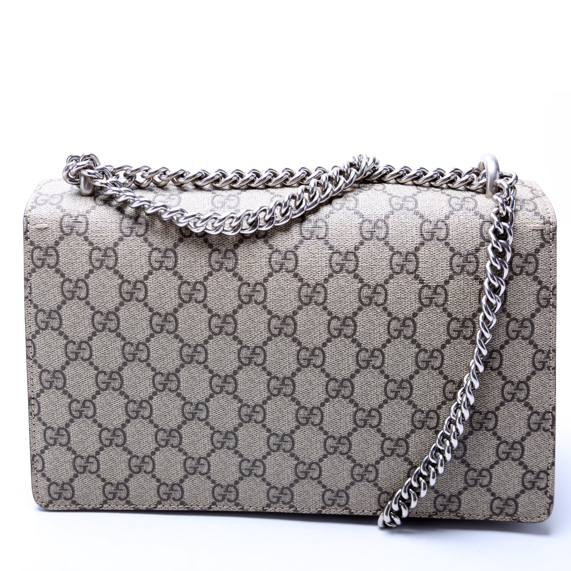 This Gucci Dionysus GG Shoulder Smallis eye catching bag. The exterior is in the classic Gucci GG Supreme coated canvas.