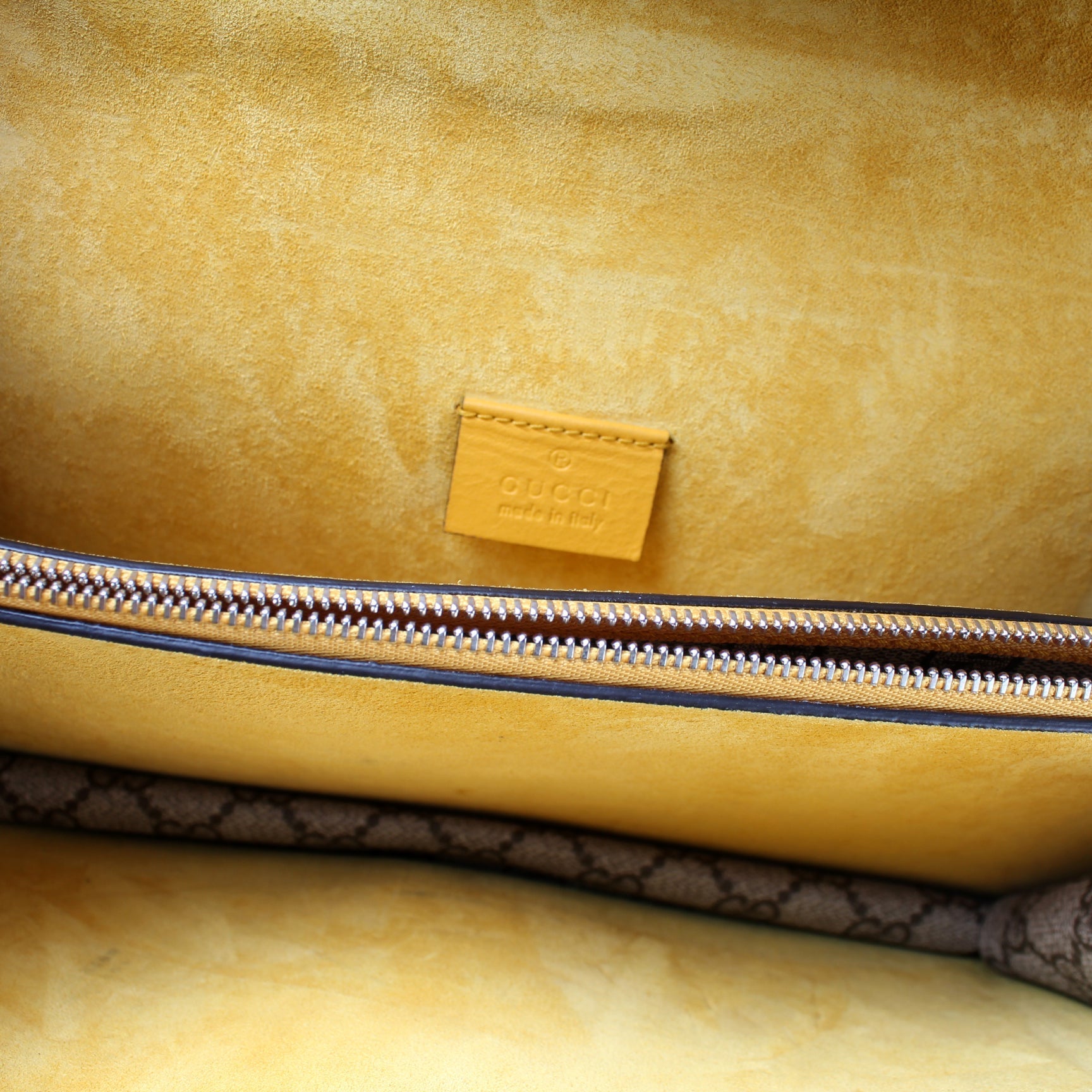 Interior: The interior is clean and free of rips or tears. The interior features two open sections and one zip closure pocket.
