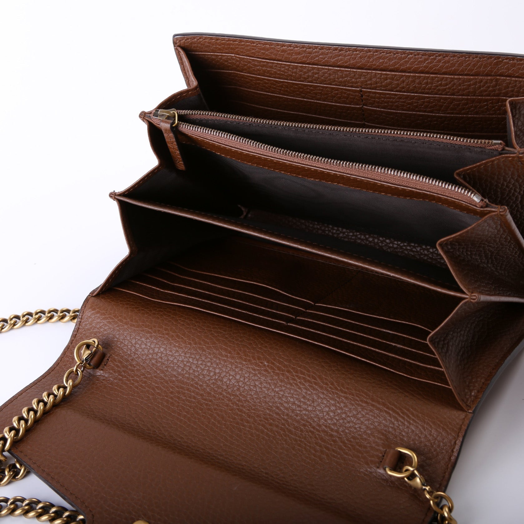 Interior: The interior is clean and free of rips or tears. The interior features one zipper pocket, five open pockets, and sixteen card slots. The leather has minor impressios from the hardware underneath the flap.
