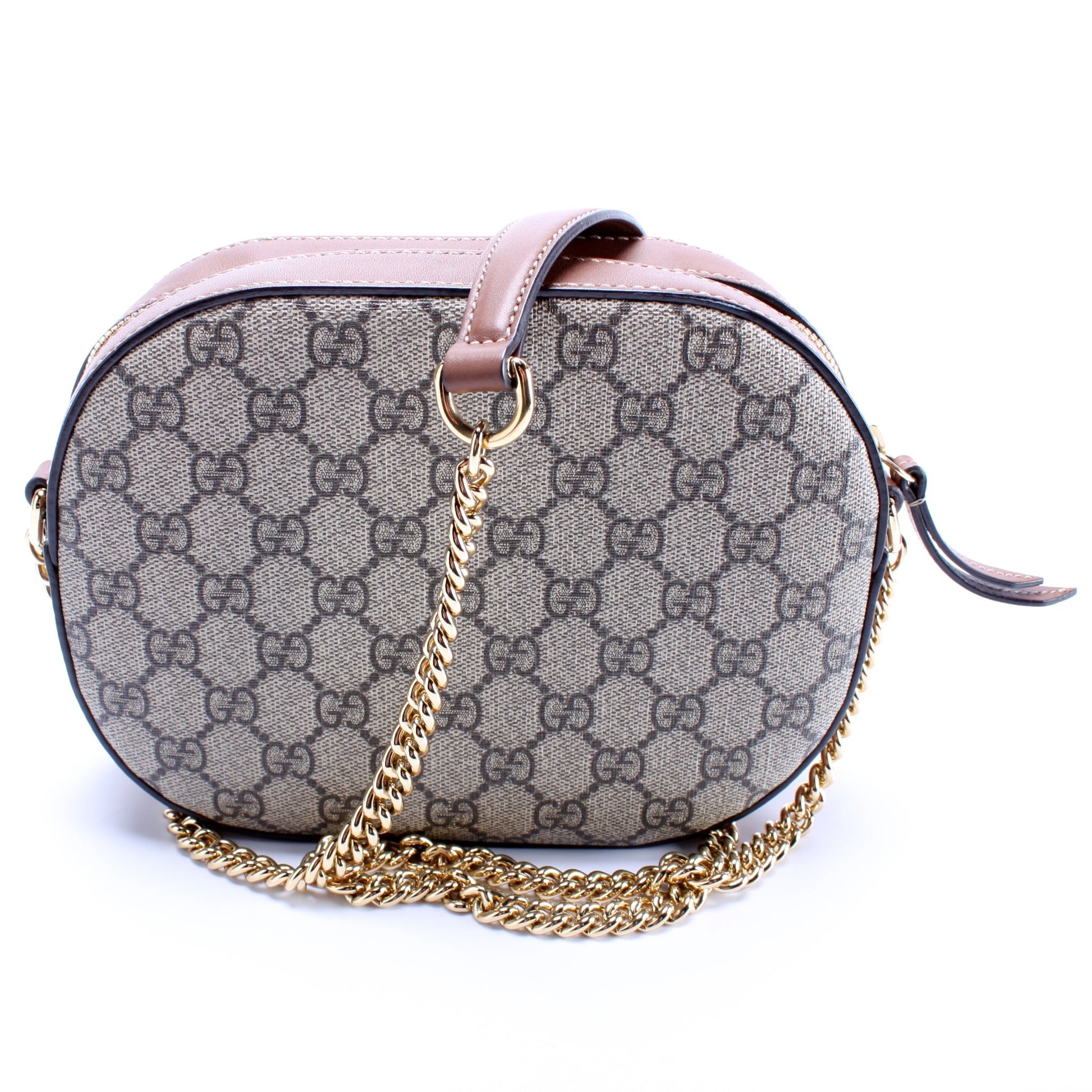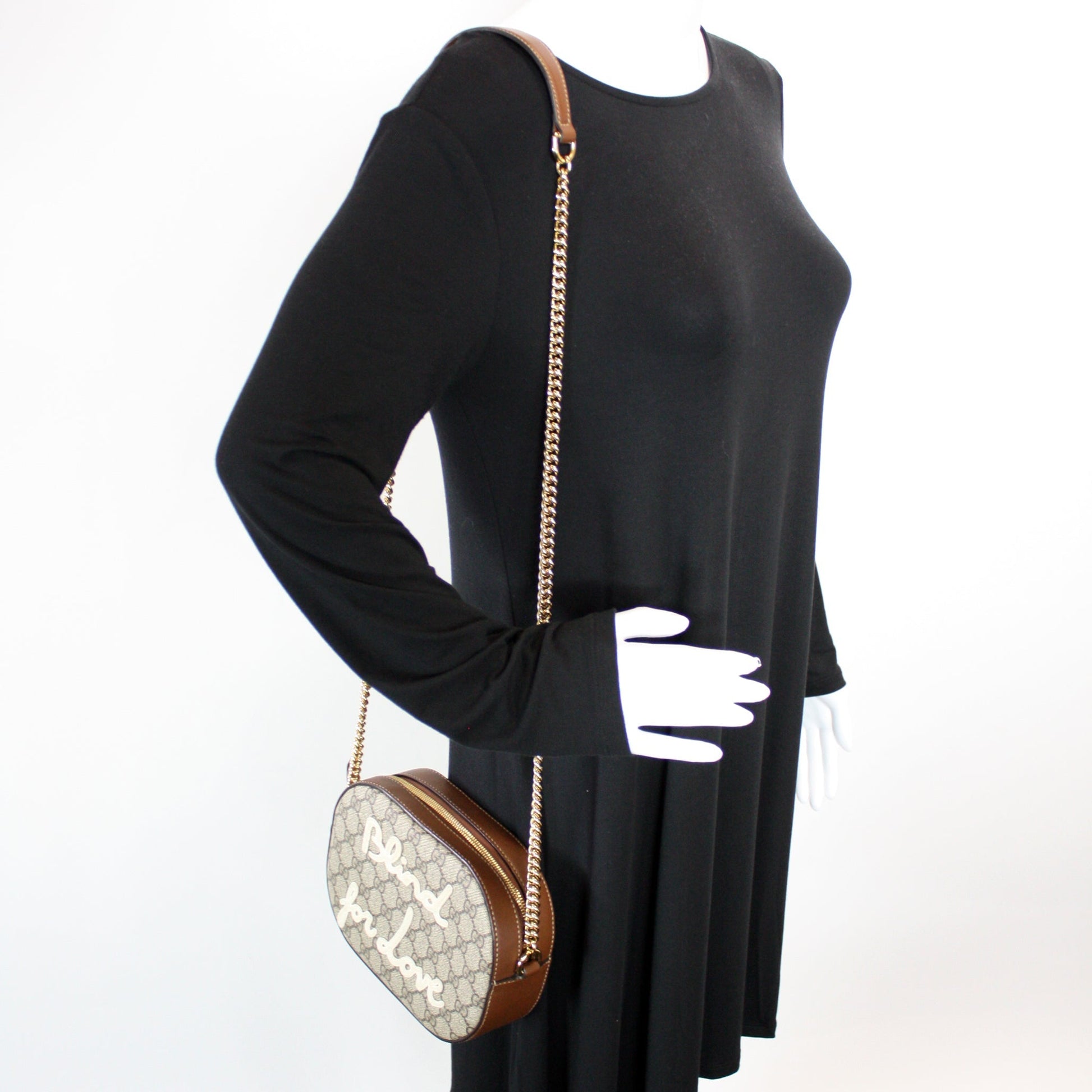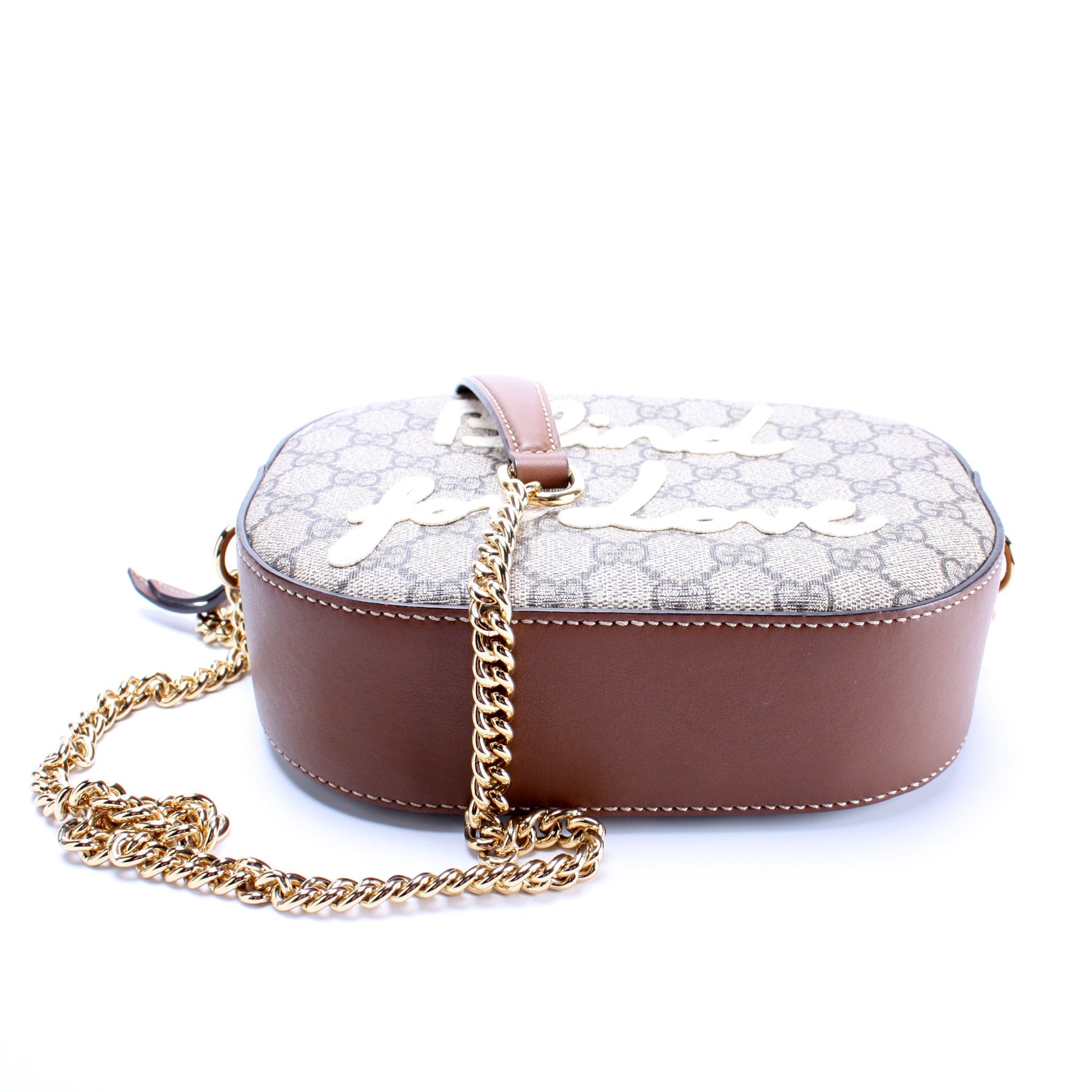 This Gucci GG Supreme 'Blind For Love' Mini Chain is guaranteed 100% authentic. The exterior is in the Gucci GG Supreme coated canvas.