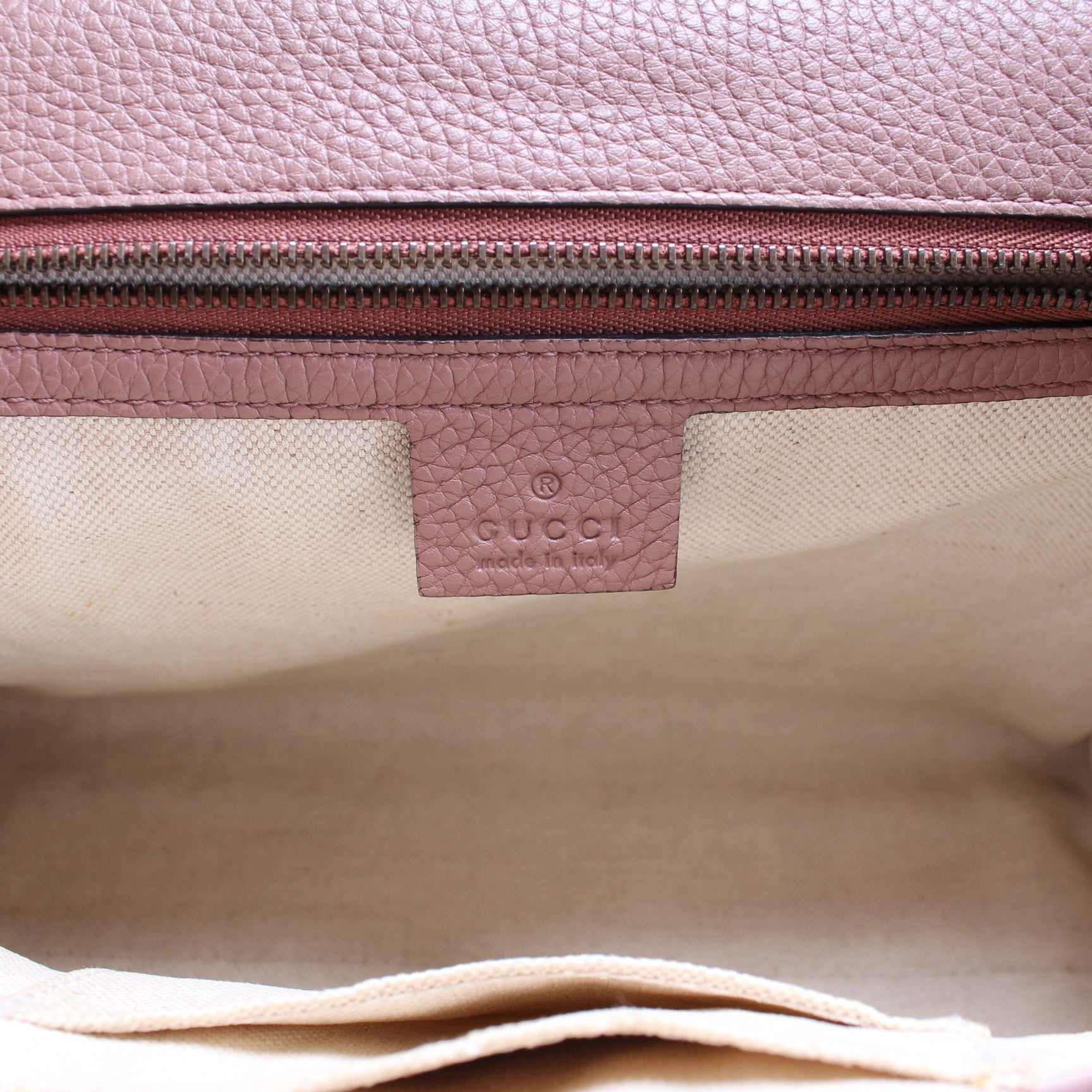 Interior: The interior is free of rips or tears. The interior features one open pockets and one zip closure pocket. There are minor stains to the interior.