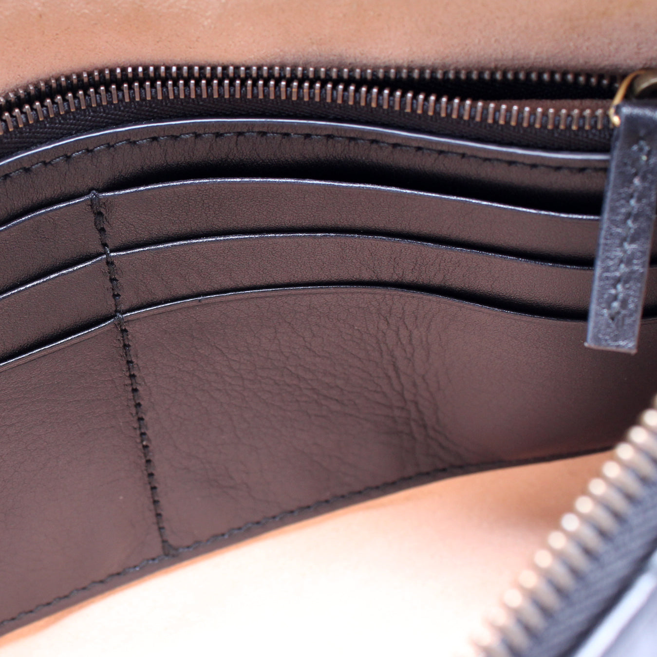Interior: The interior is clean and free of any rips or tears. The interior features one zip closure pocket and six card slots.