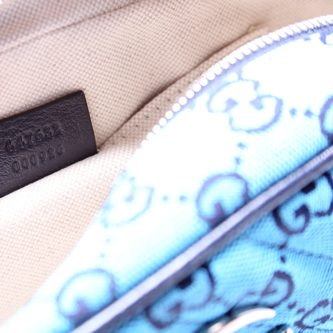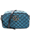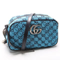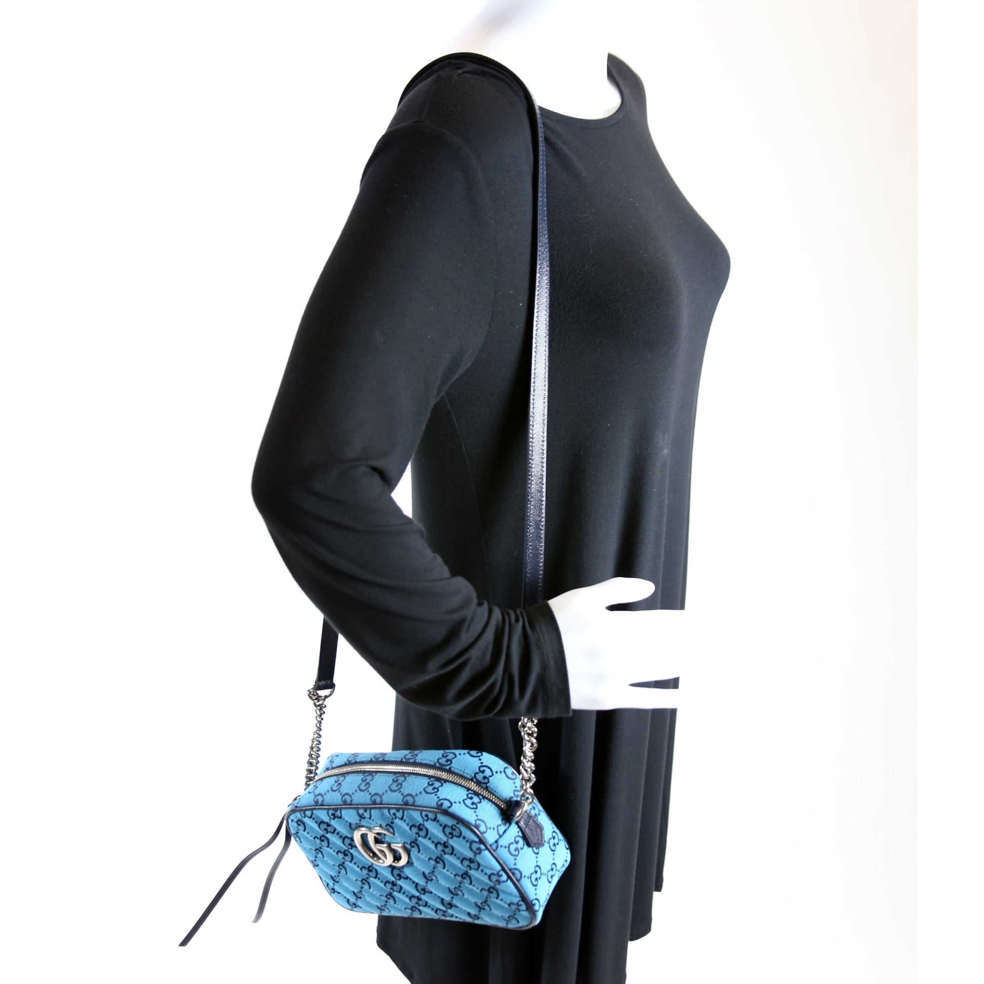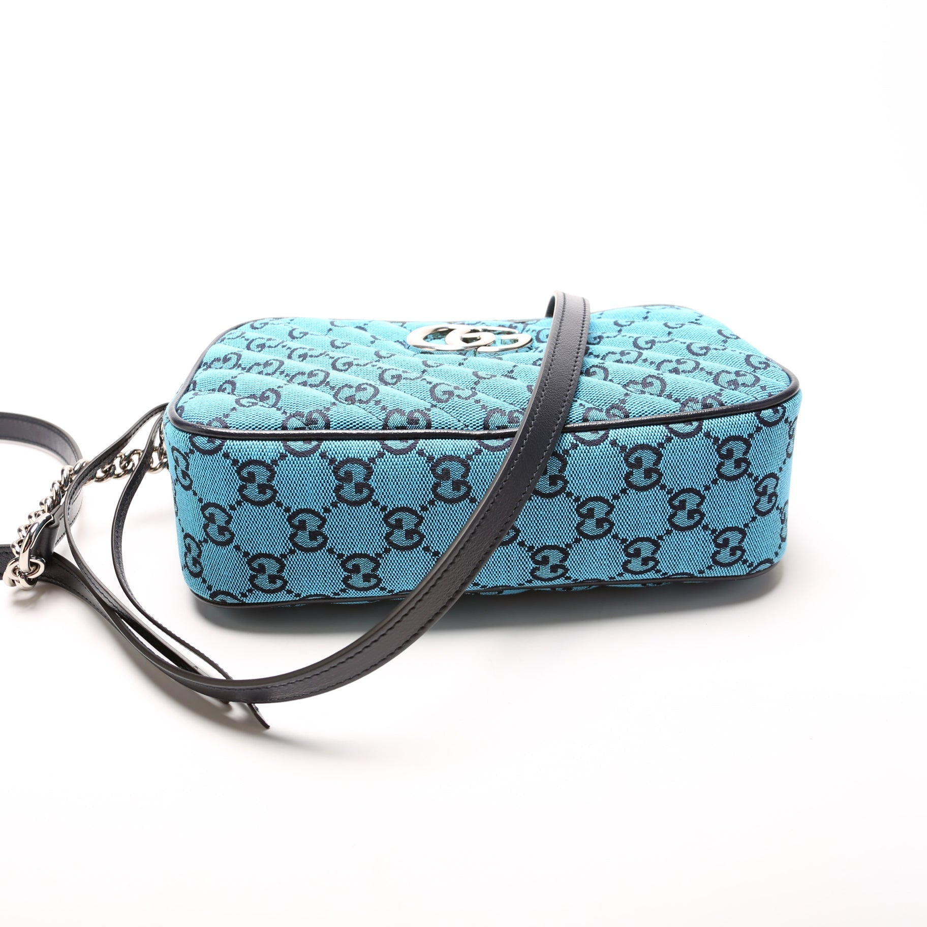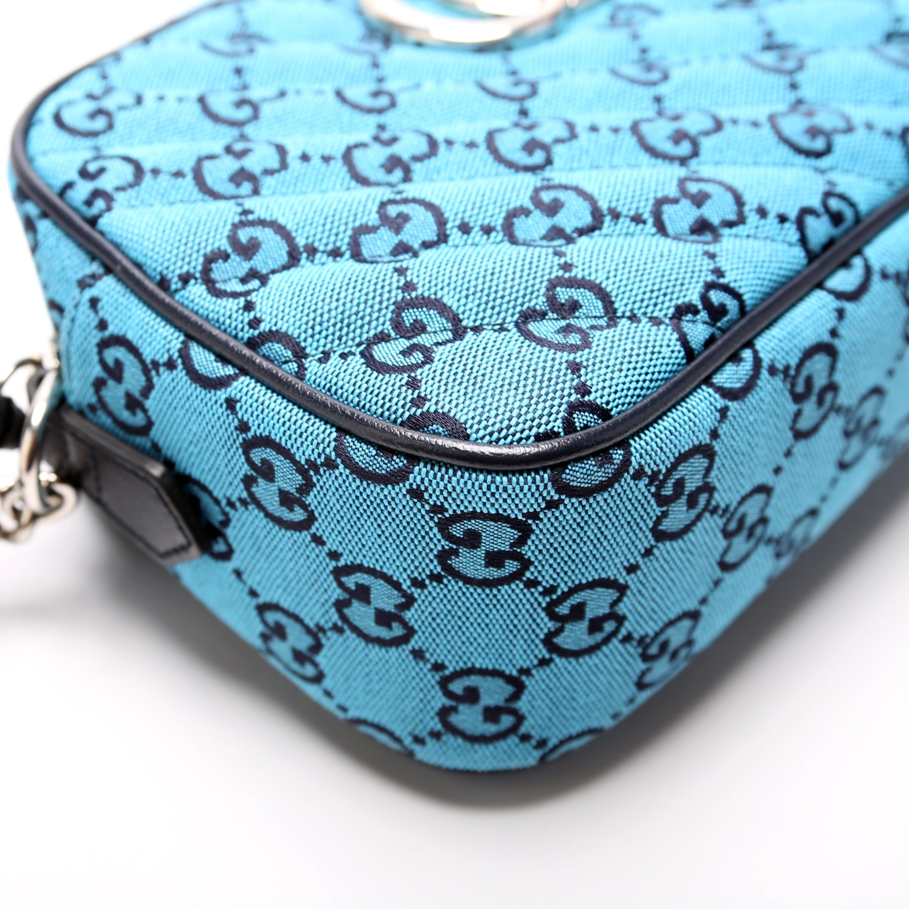 This Gucci GG Marmont Small Multicolor Canvas Camera Bagis eye catching bag. The exterior is in the classic Gucci GG Canvas.