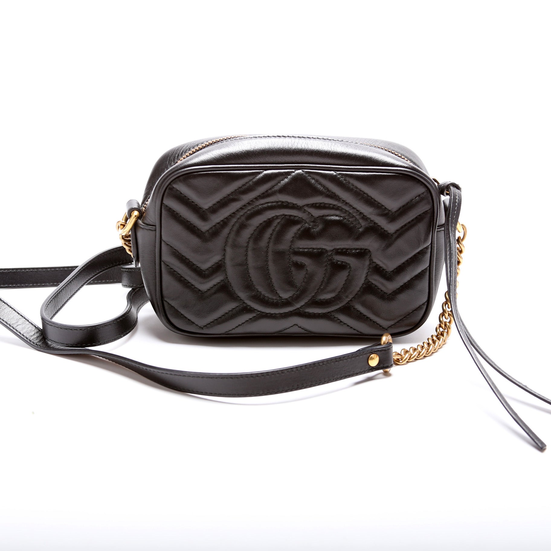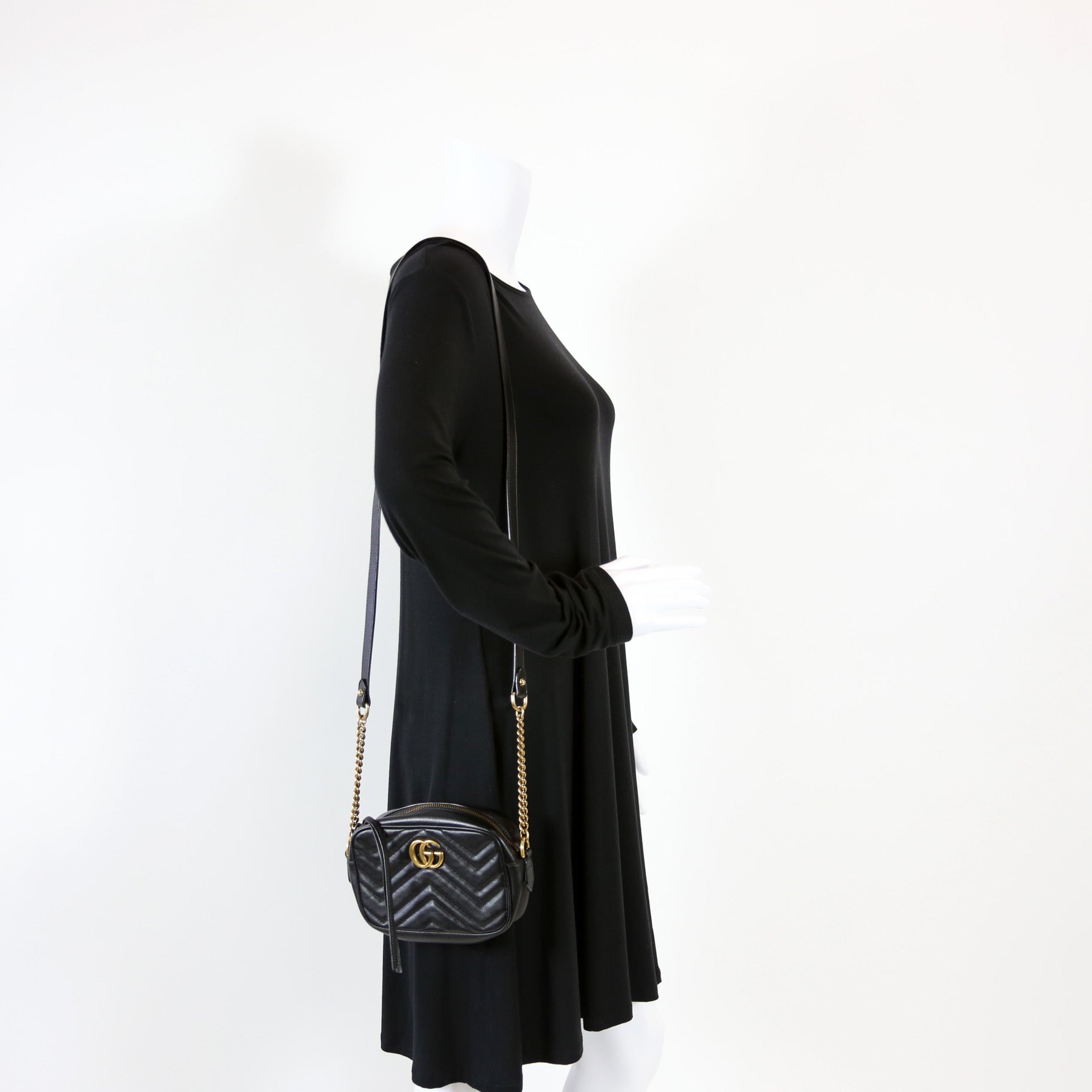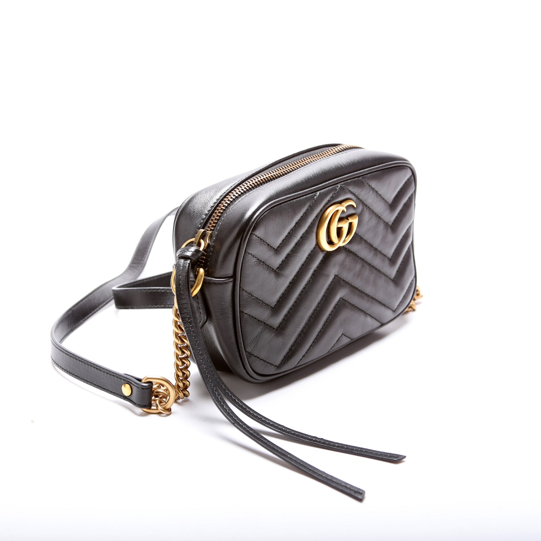 This GG Marmont Mini Camera Bagis eye catching bag. The exterior is in the classic Gucci Marmont leather.