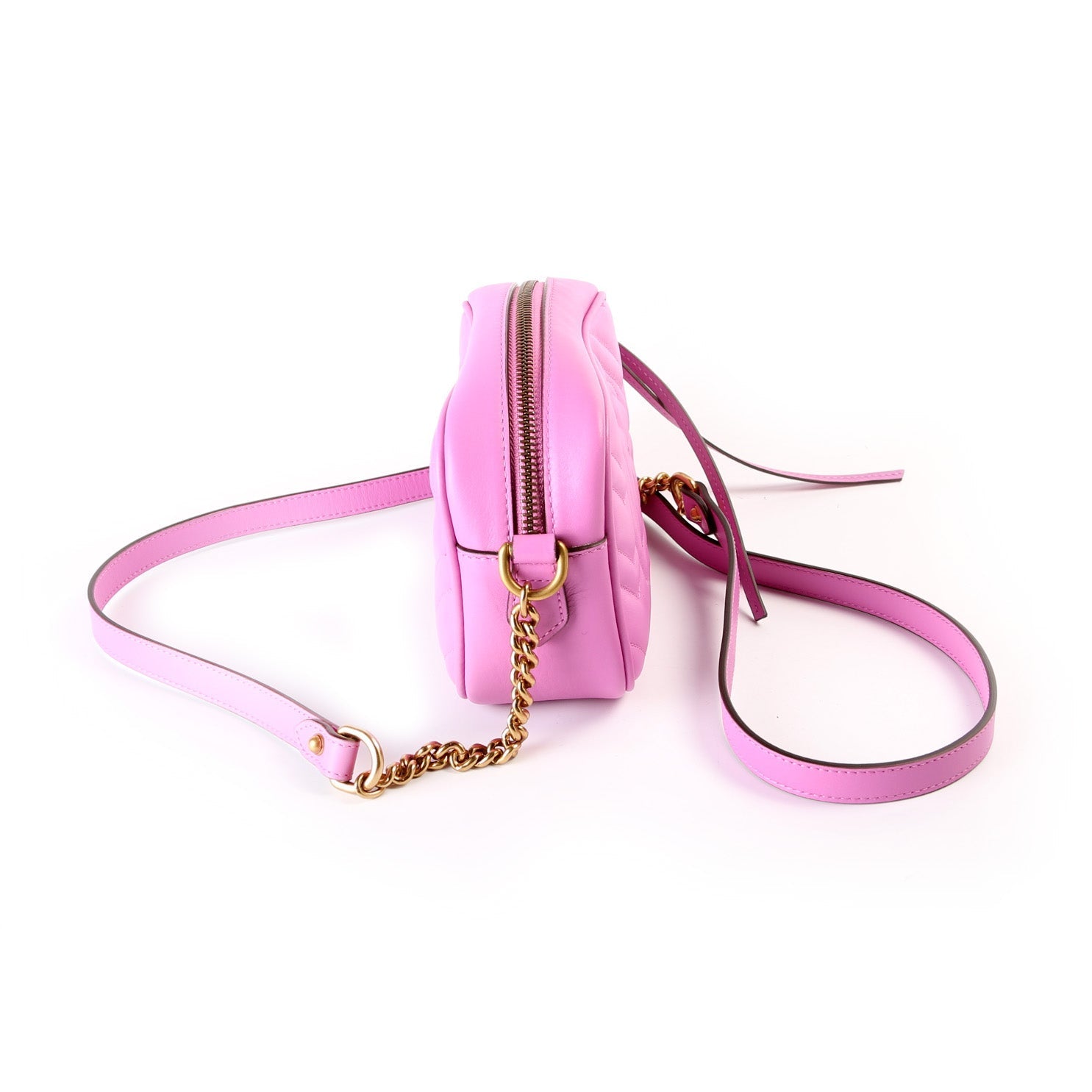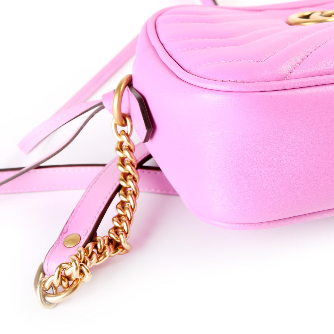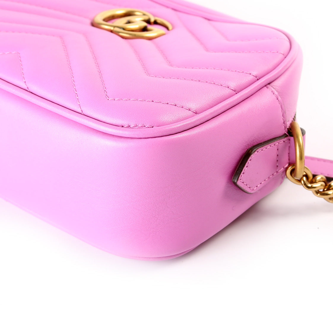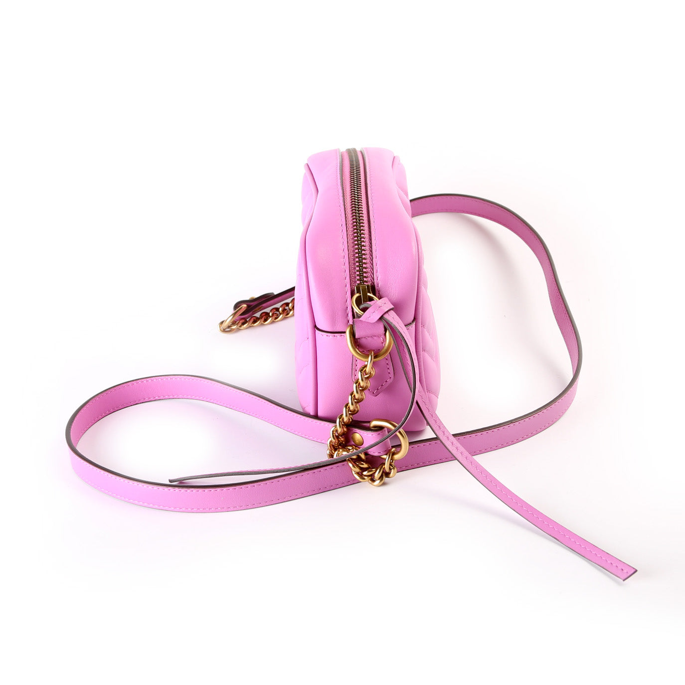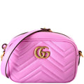 This Marmont Mini Camera Bagis eye catching bag. The exterior is in the classic Gucci Marmont leather.