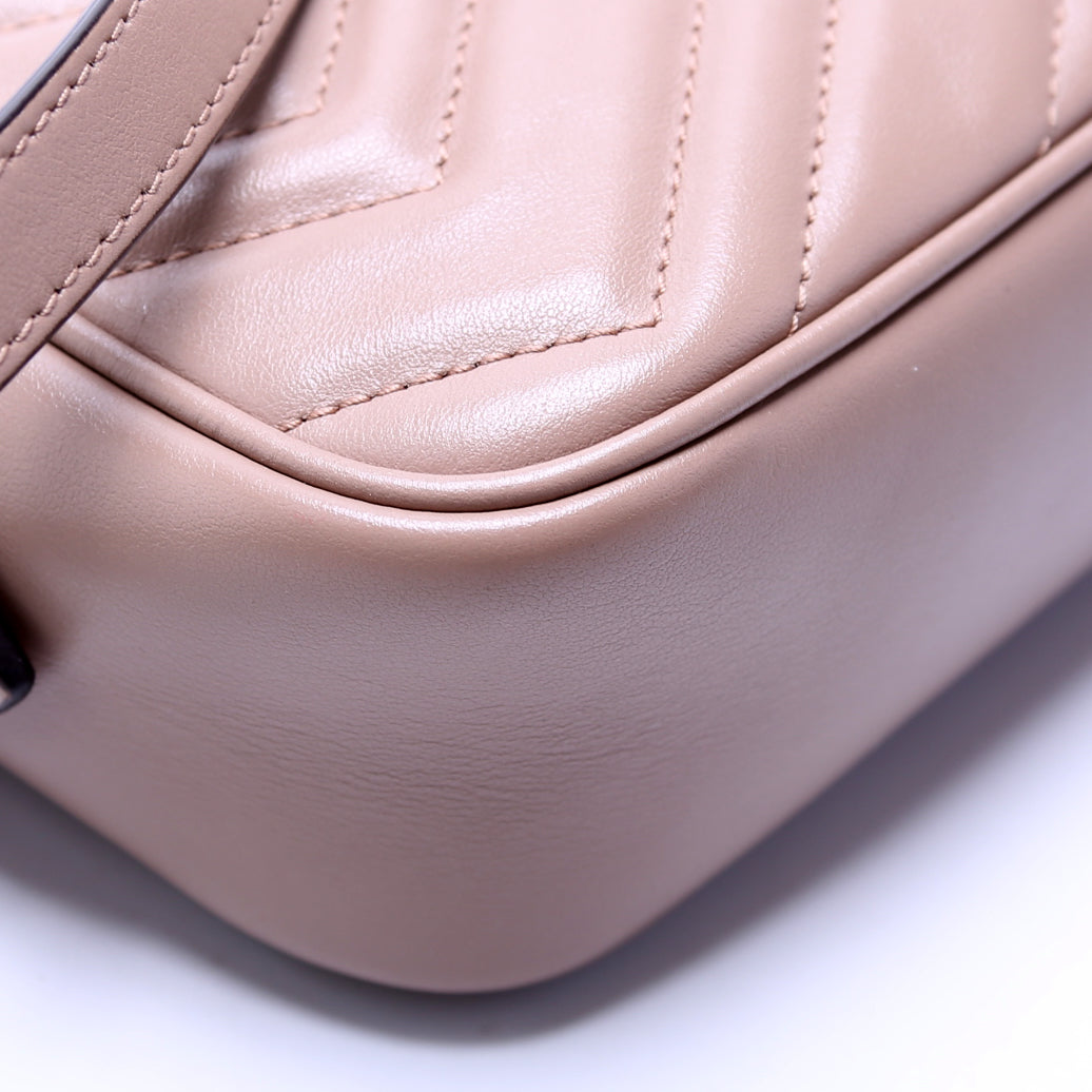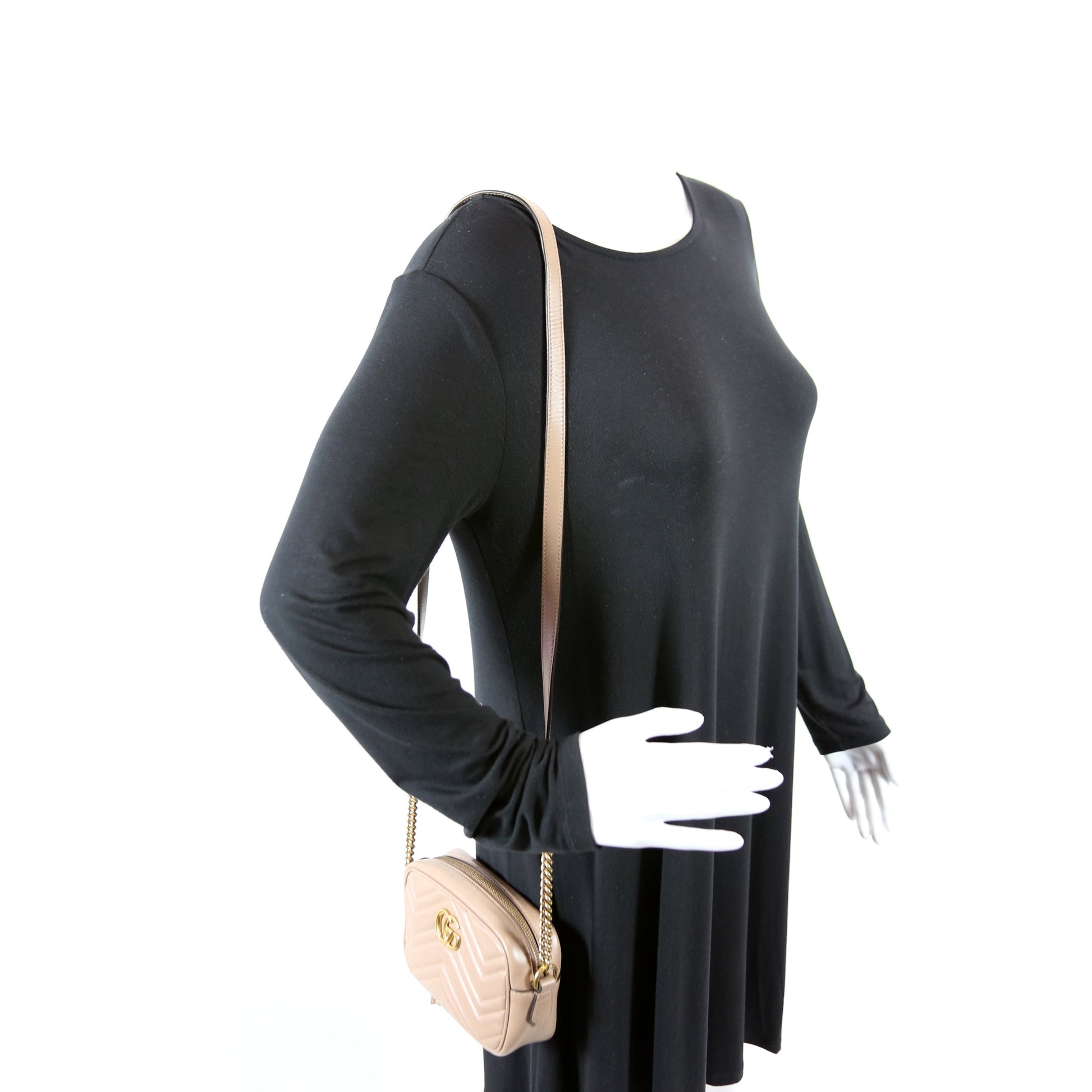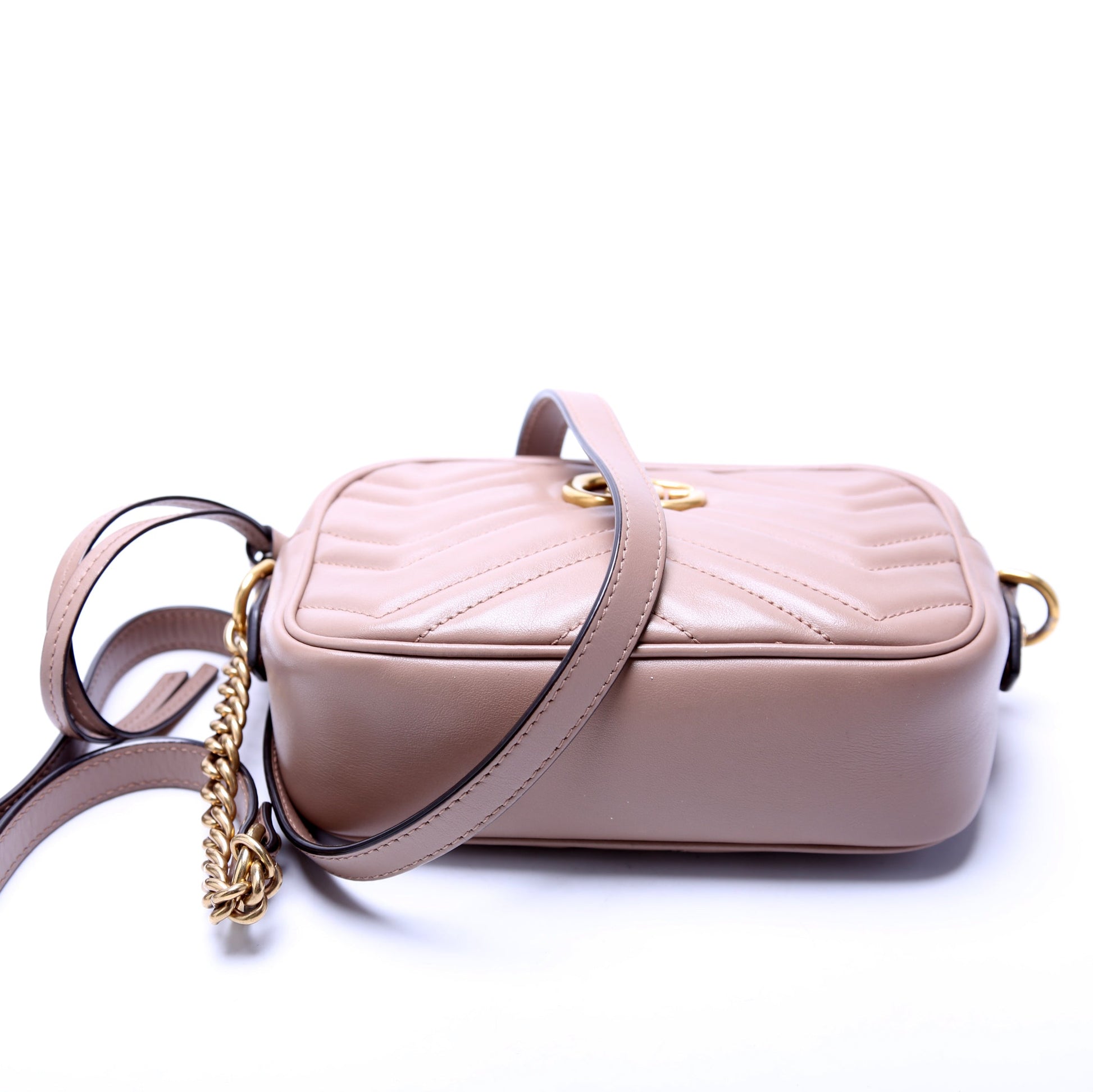 This Marmont Mini Camera Bagis eye catching bag. The exterior is in the classic Gucci Marmont leather.