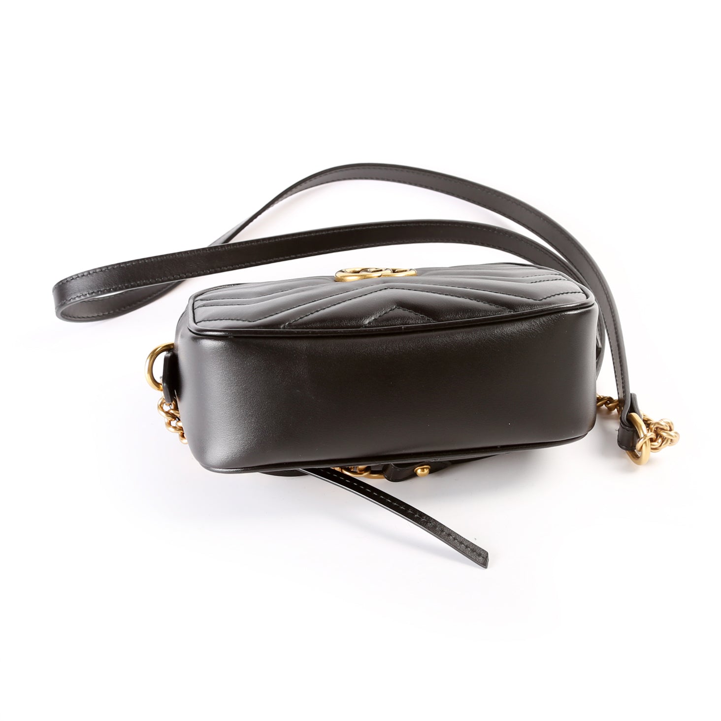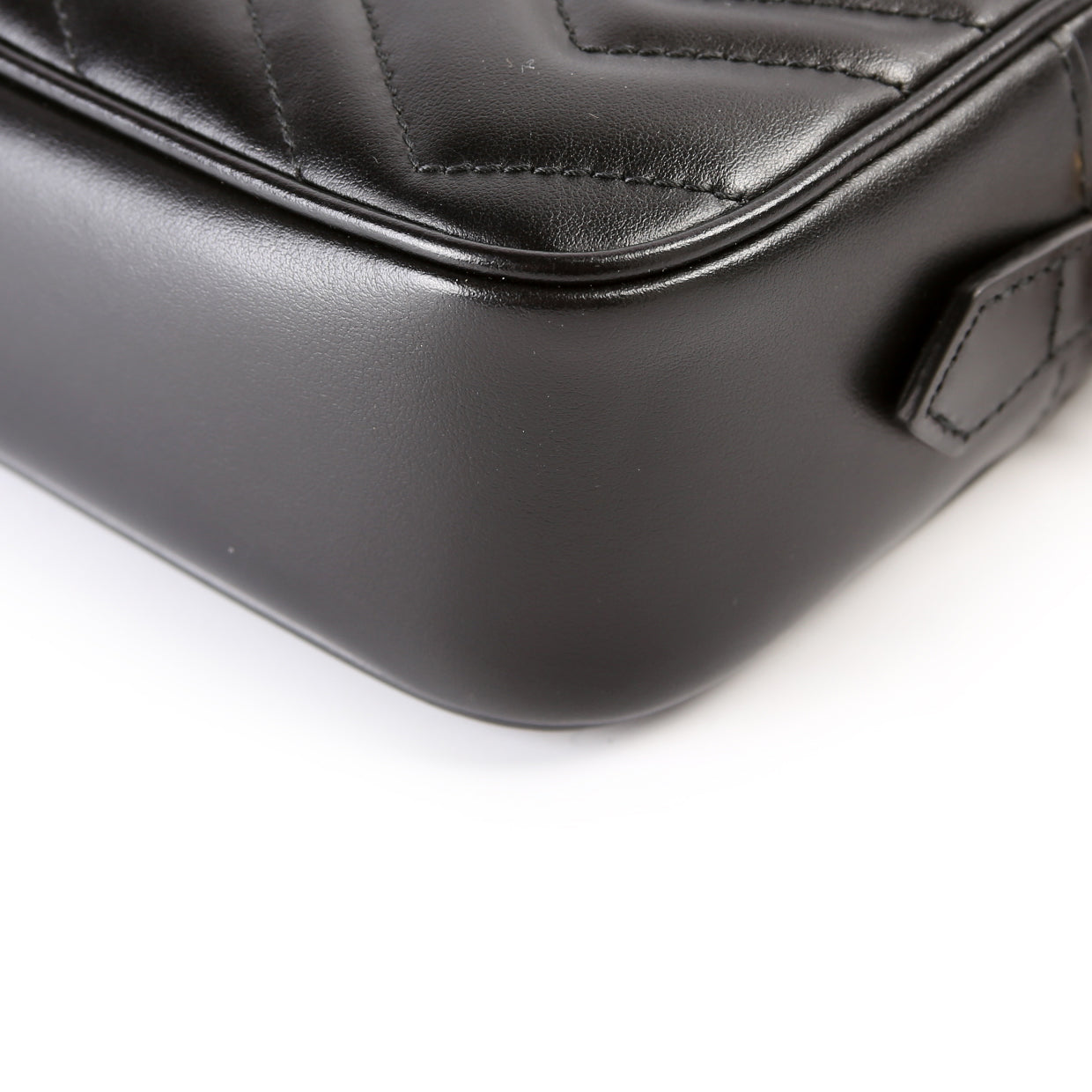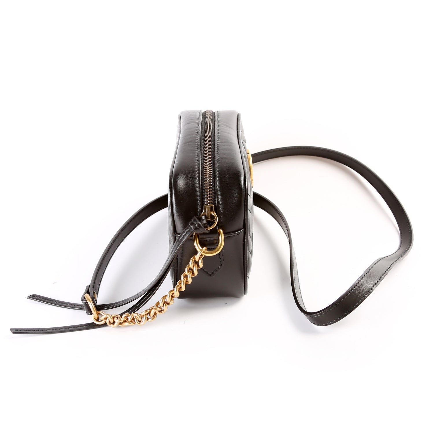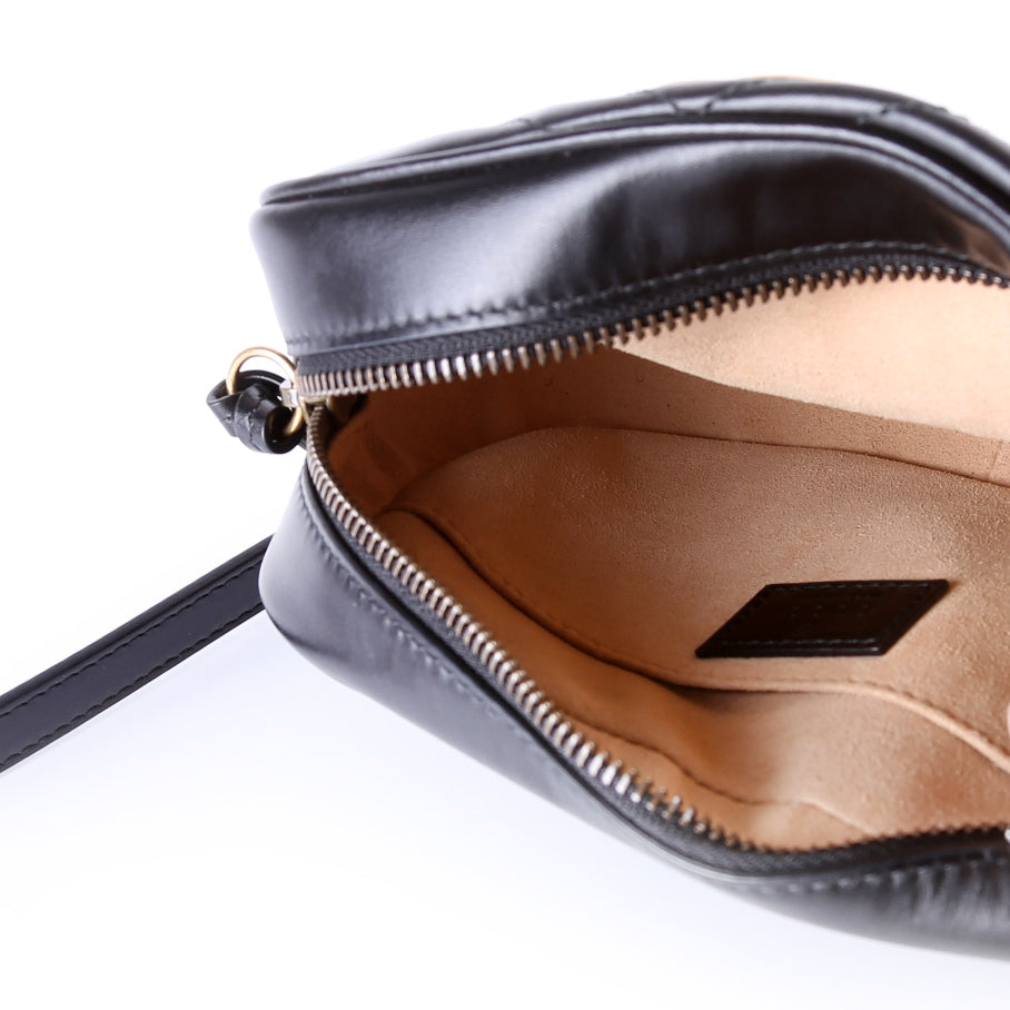 This Gucci Marmont Mini Camera Bagis eye catching bag. The exterior is in the classic Gucci Marmont leather.