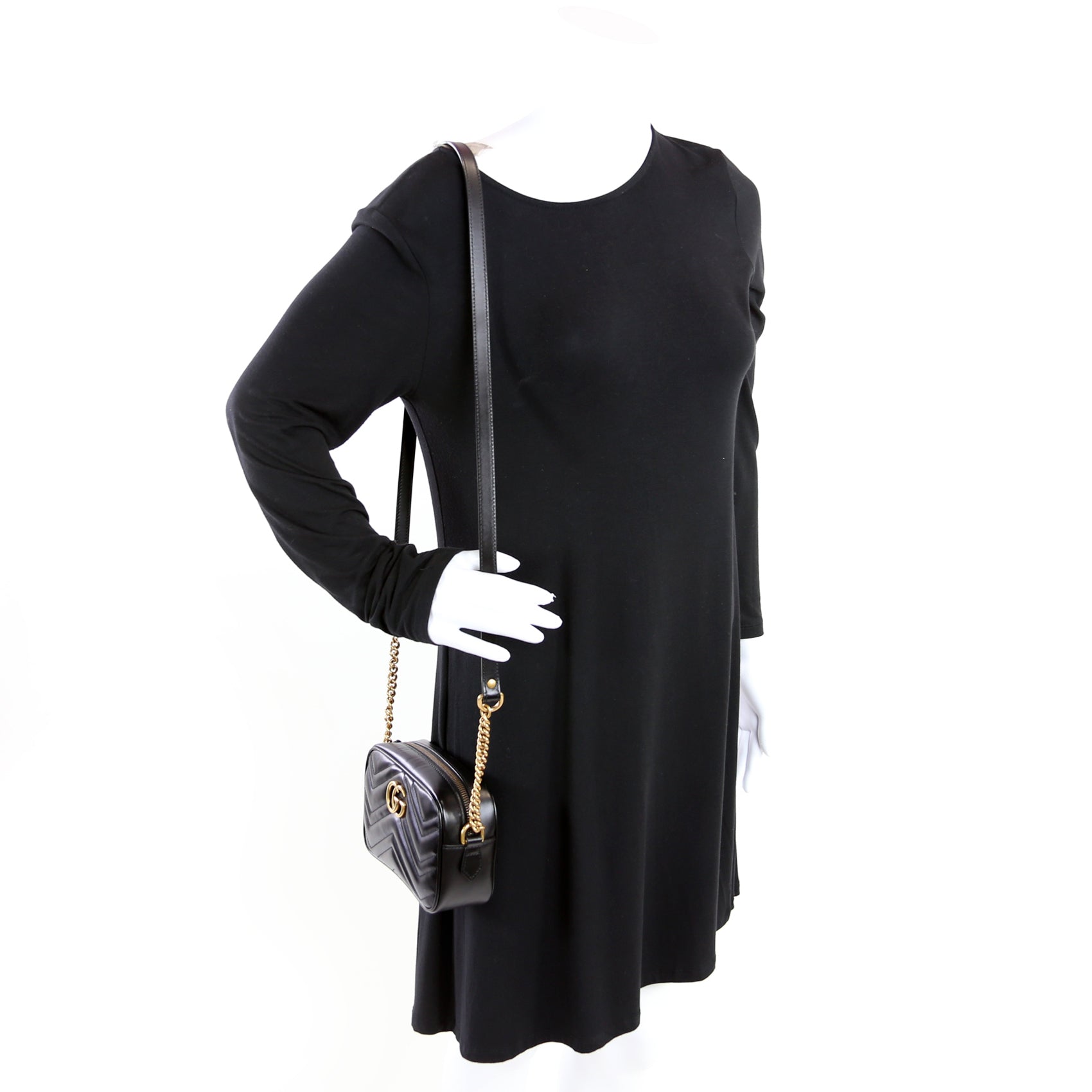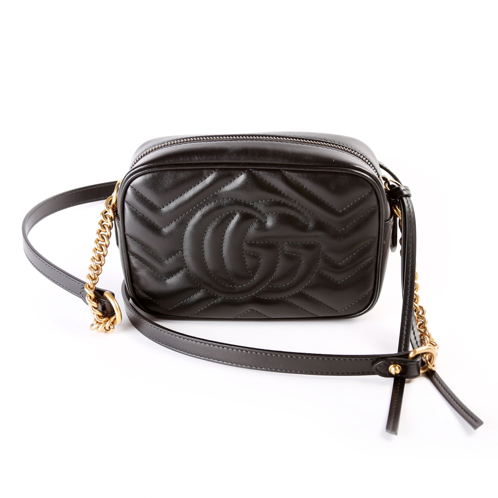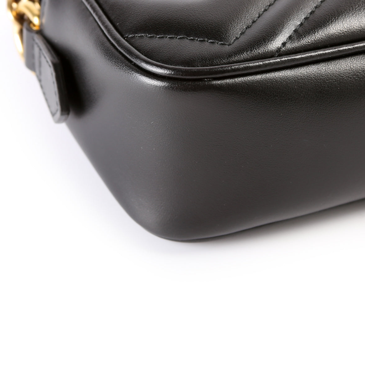 This Gucci Marmont Mini Camera Bagis eye catching bag. The exterior is in the classic Gucci Marmont leather.