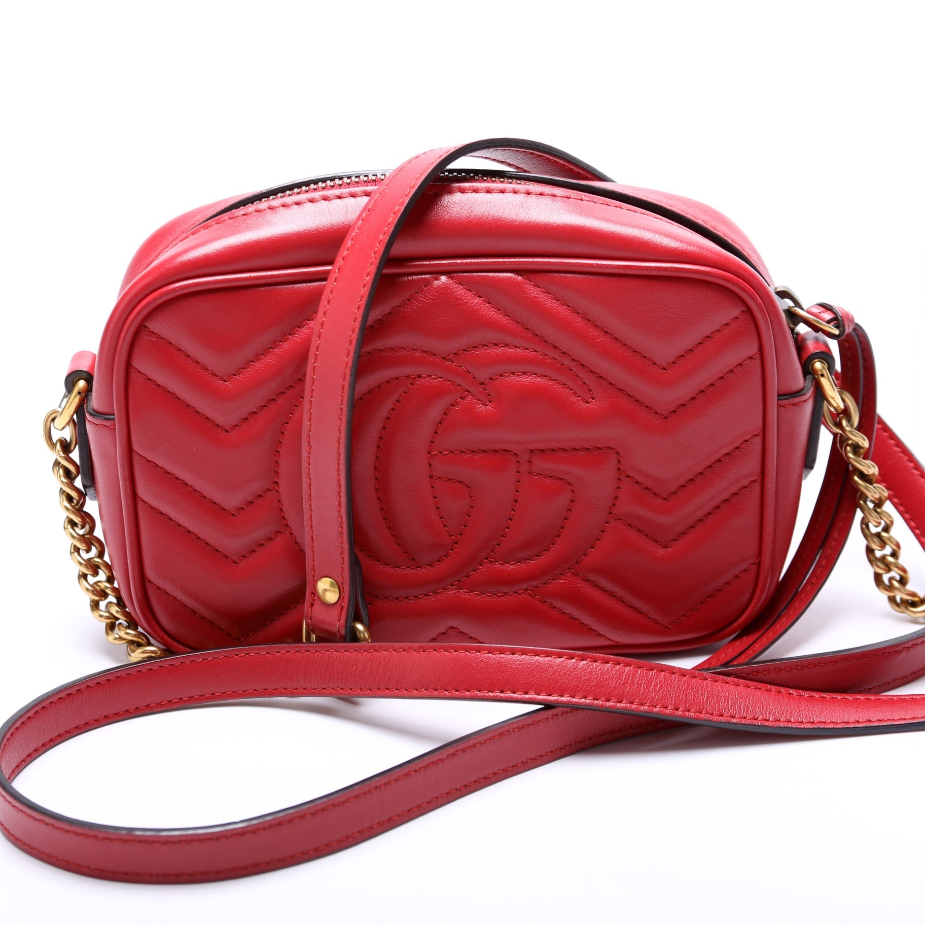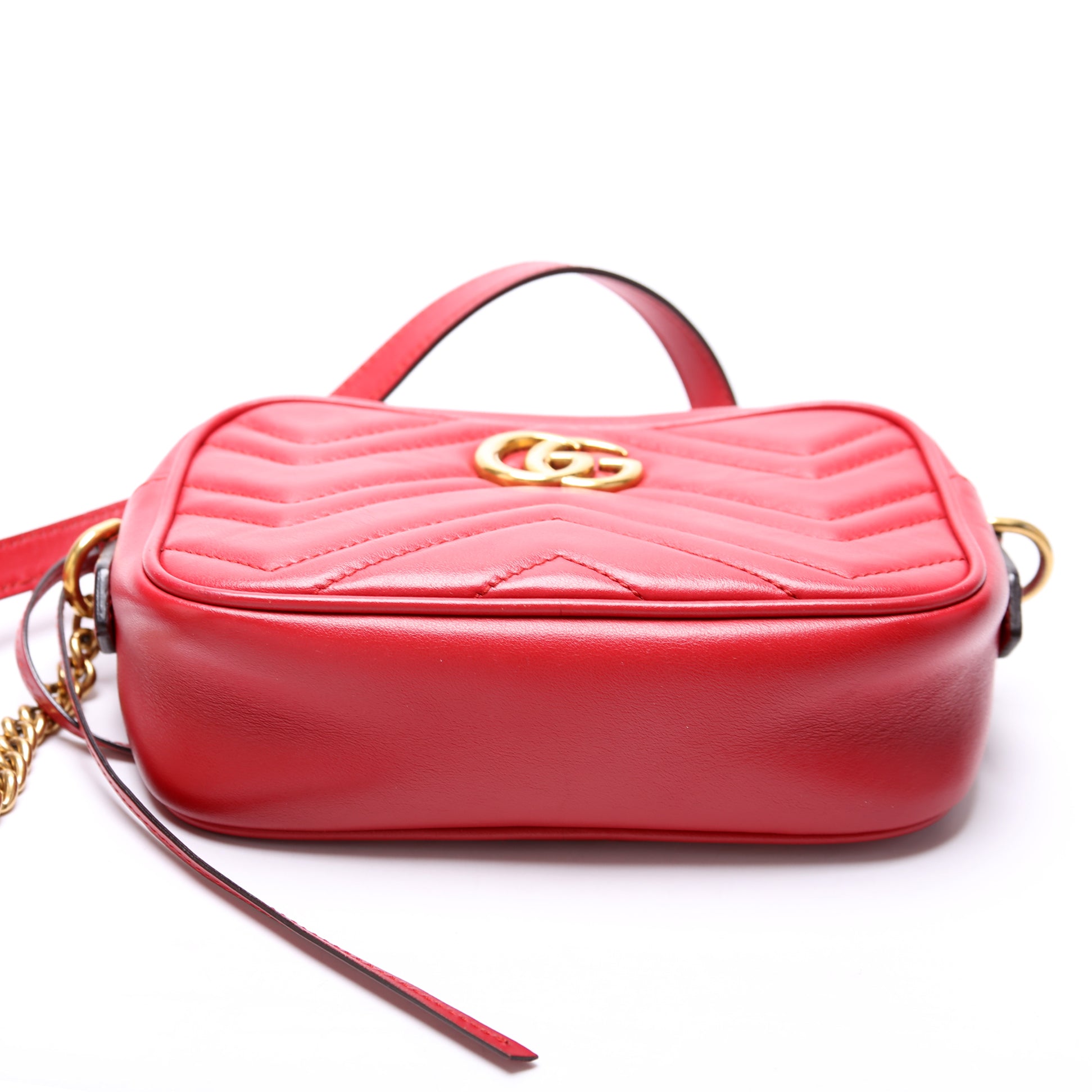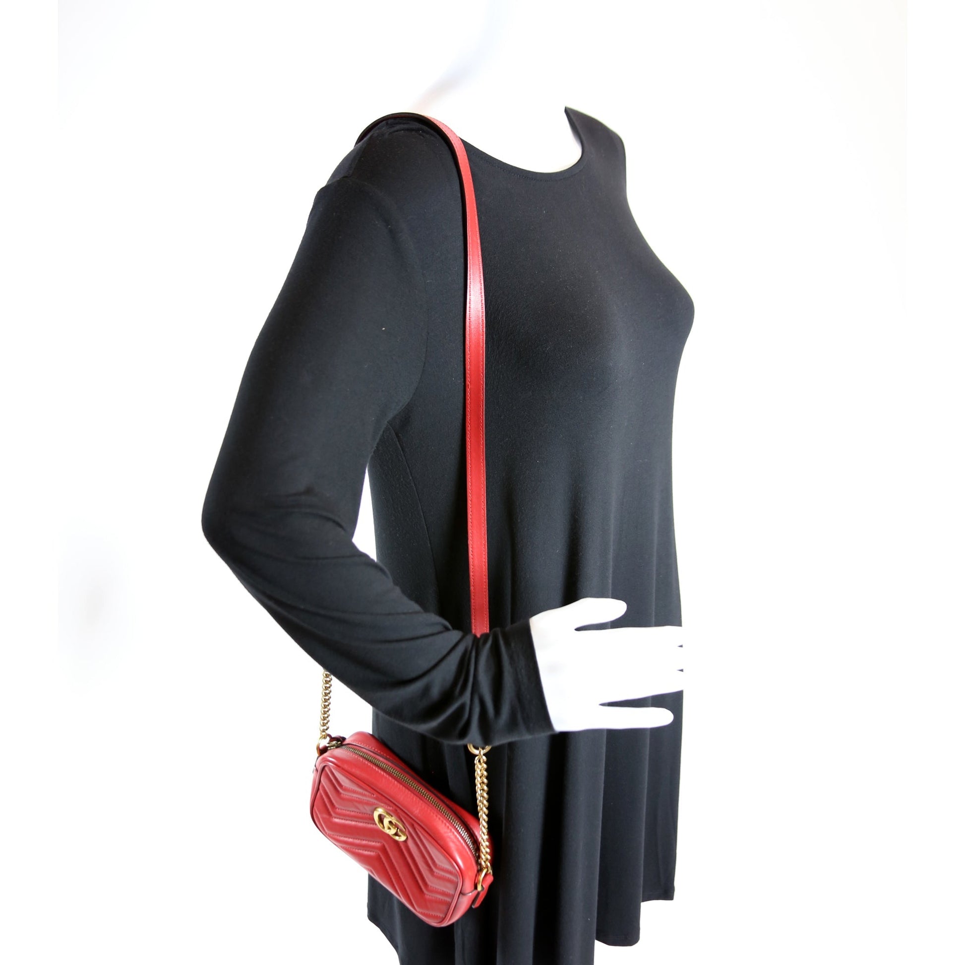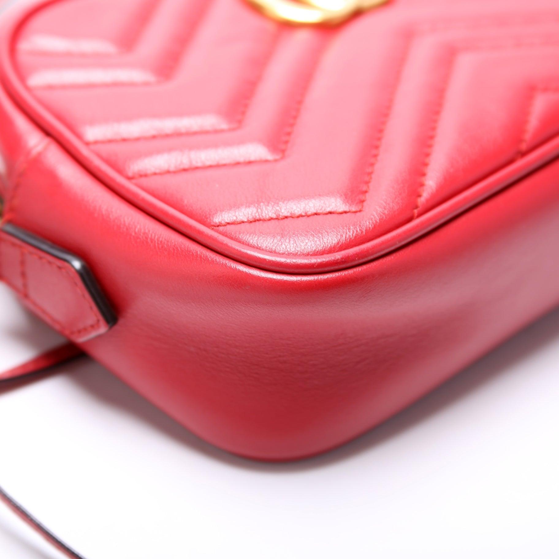 This GG Marmont Mini Camera Bagis eye catching bag. The exterior is in the classic Gucci Marmont leather.