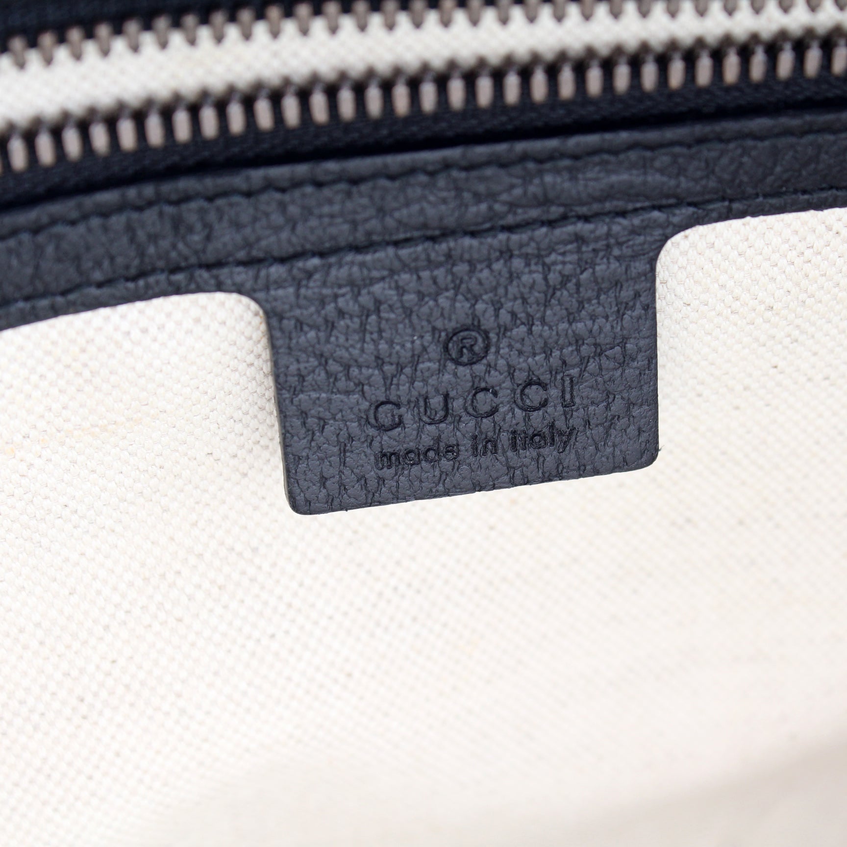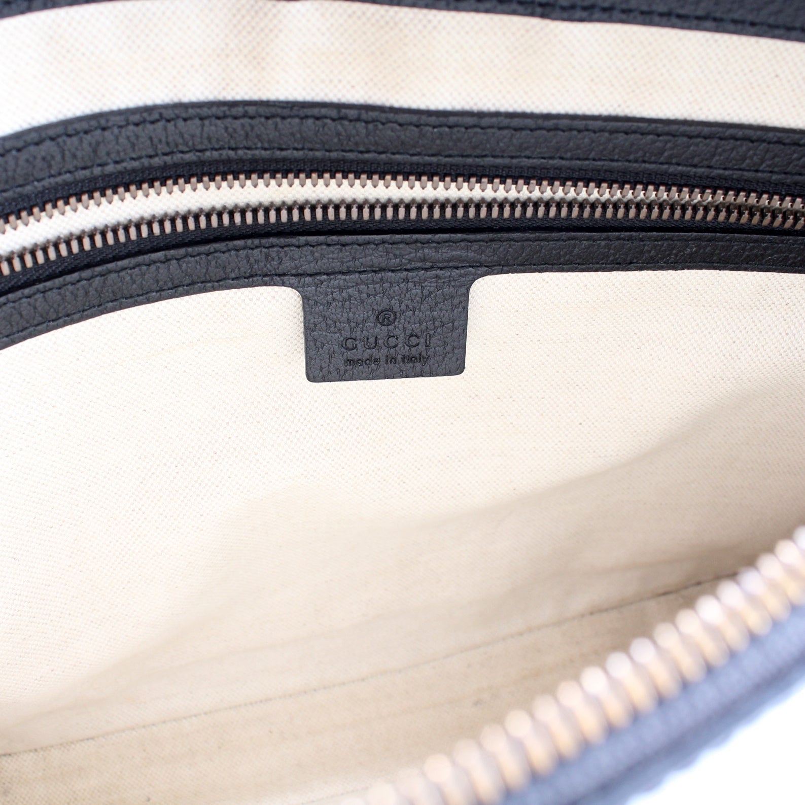 Interior: The interior shows light stains. The interior features one zip closure pocket.