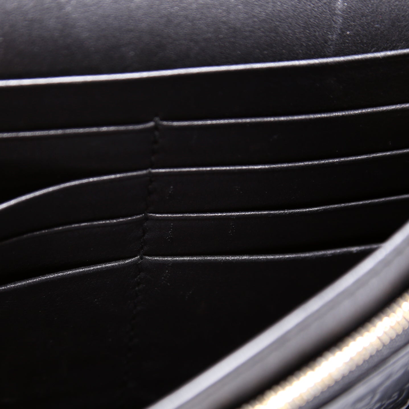 Interior: The interior is free of rips or tears. The interior features one zipper pocket, one open pocket, and eight card slots.
