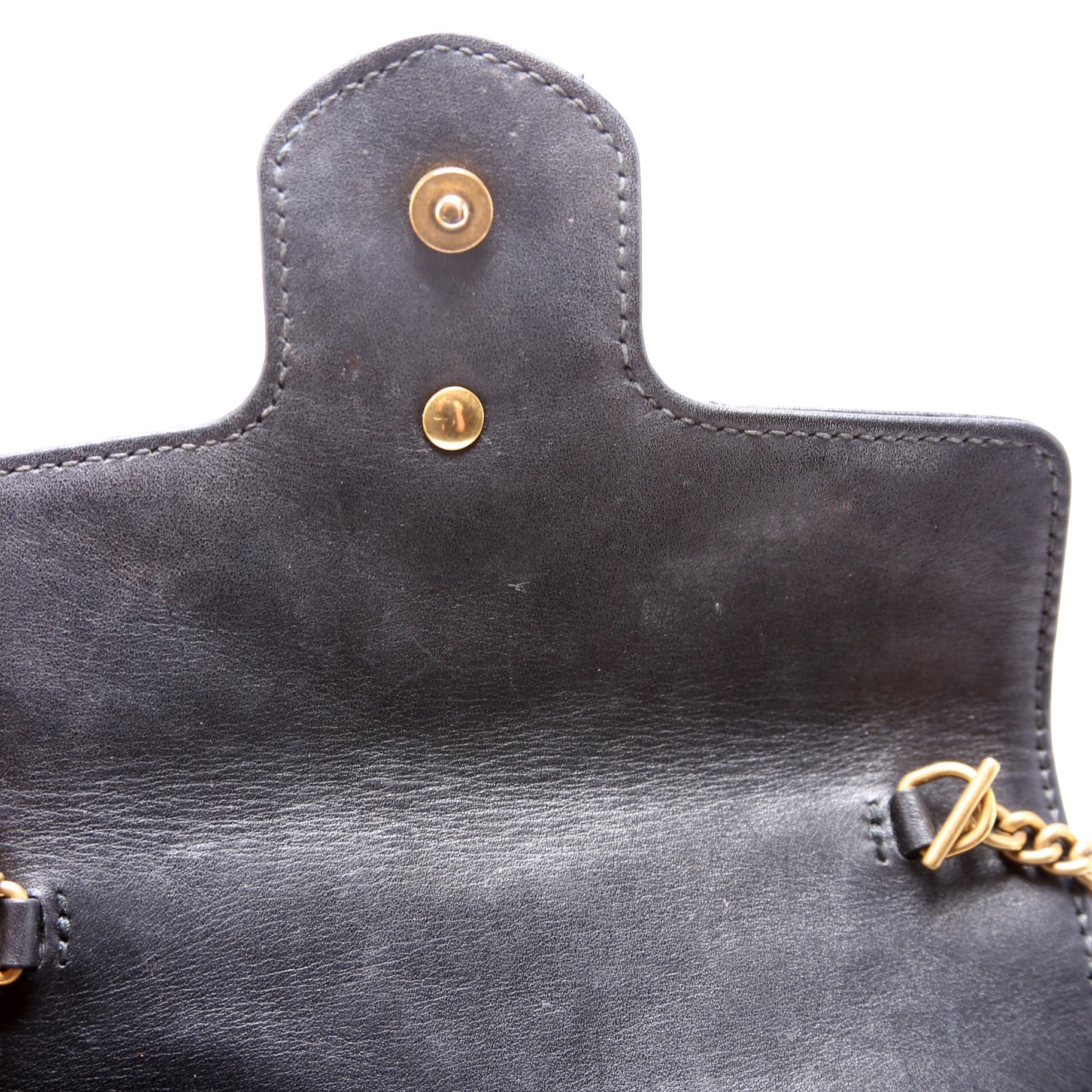Interior: The interior is free of rips or tears. The interior features one chain clip. The interior fabric has discoloration.