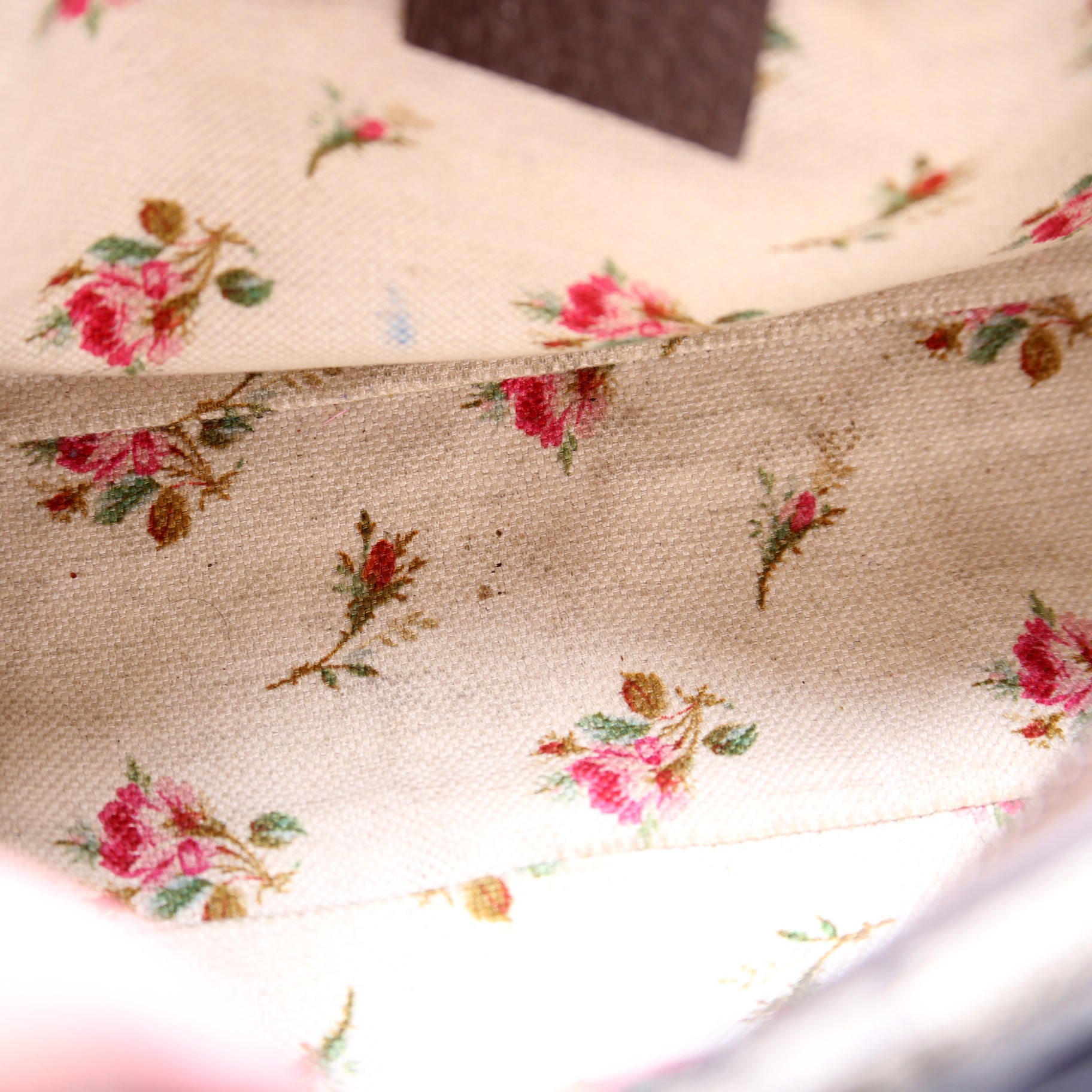 Interior: The interior has discoloration throughout and features one open pocket.