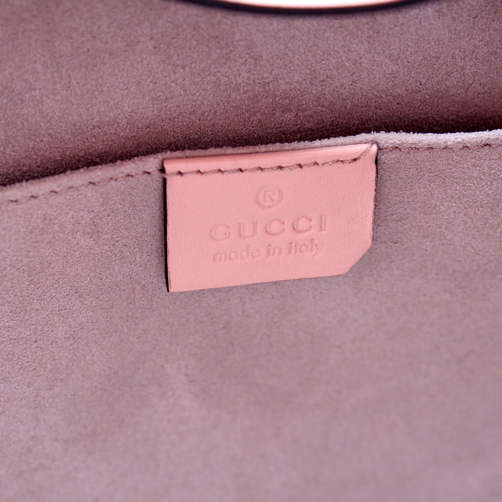 Interior: The interior shows light wear throughout. The leather tag has a minor cut on the corner. The interior features two open pockets.