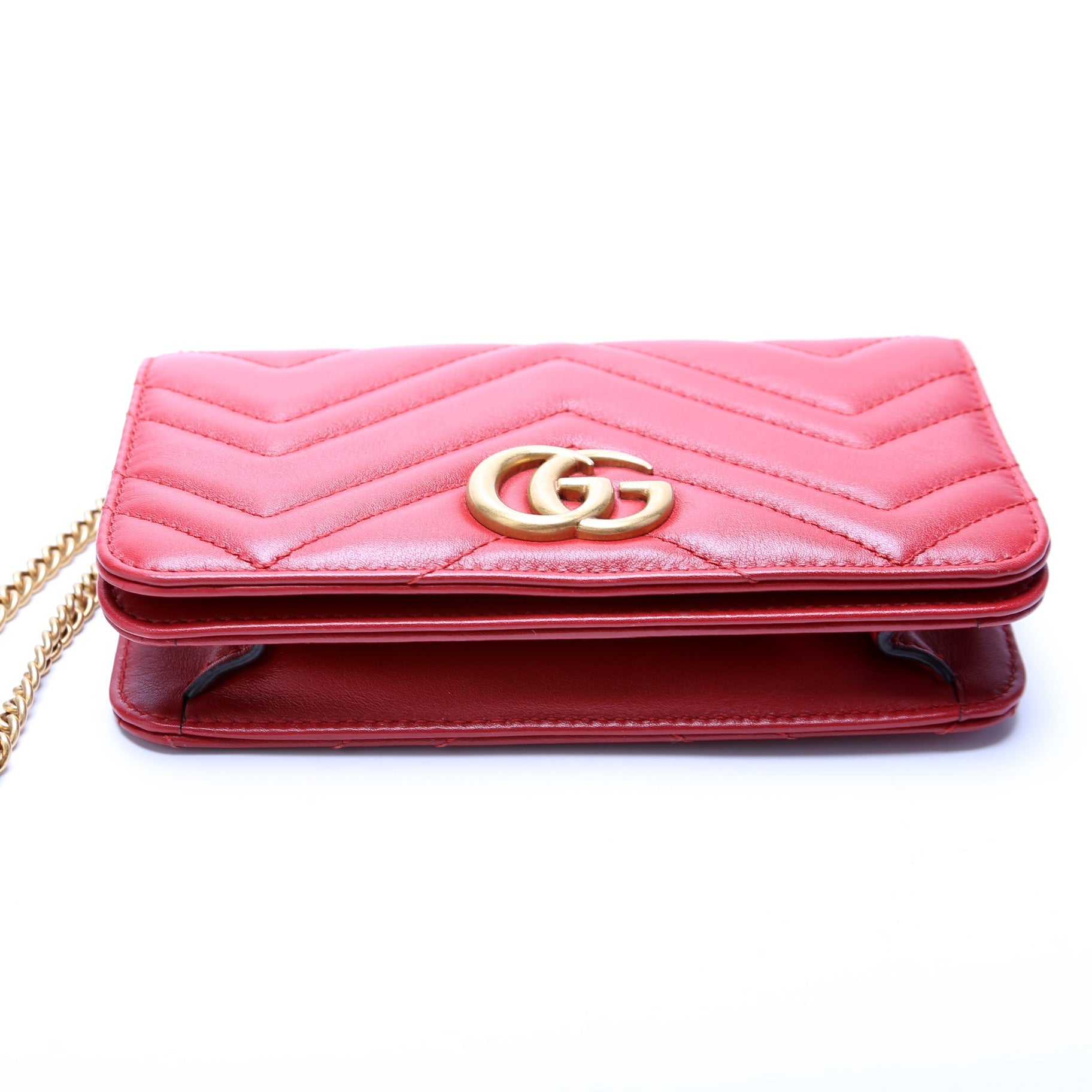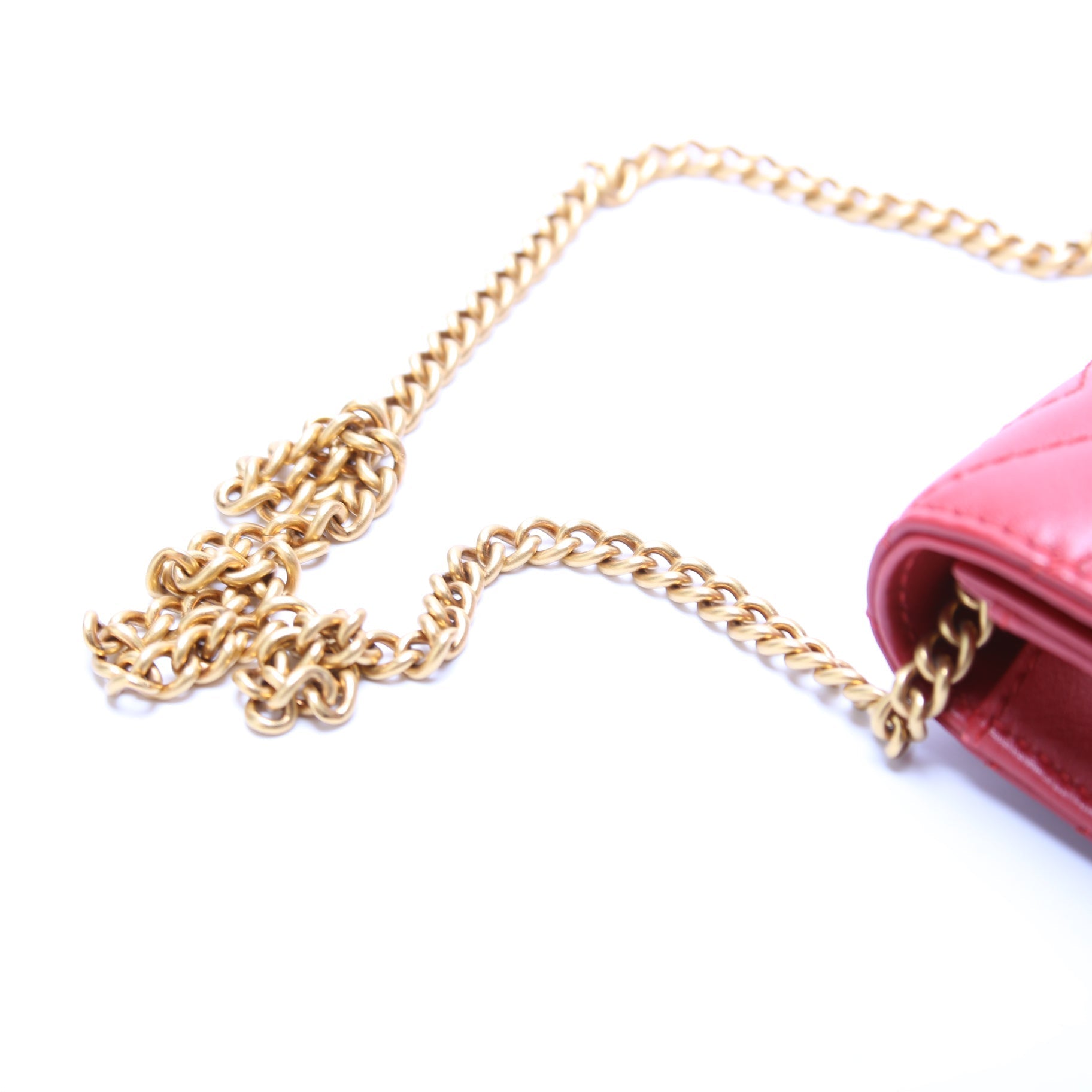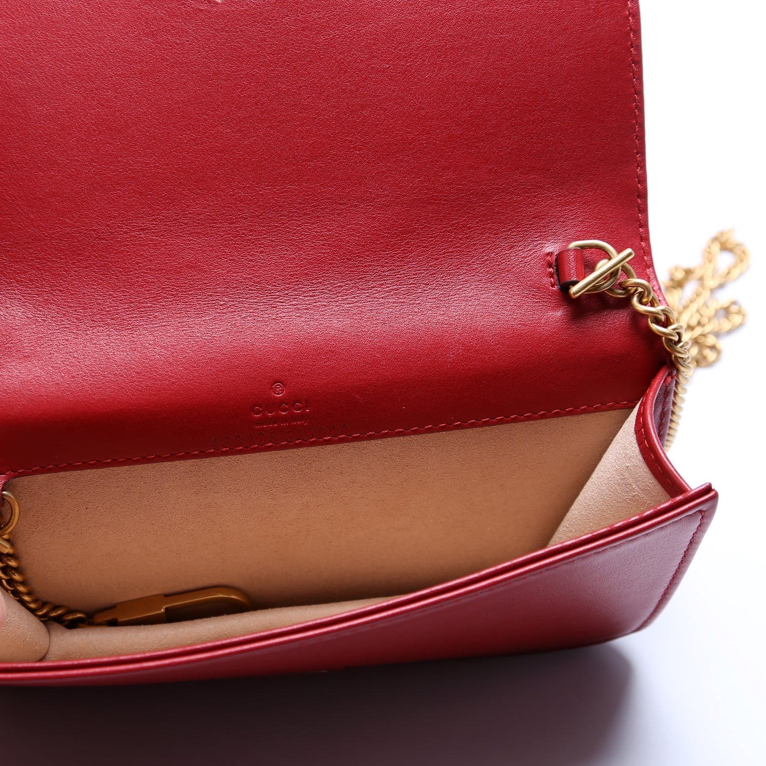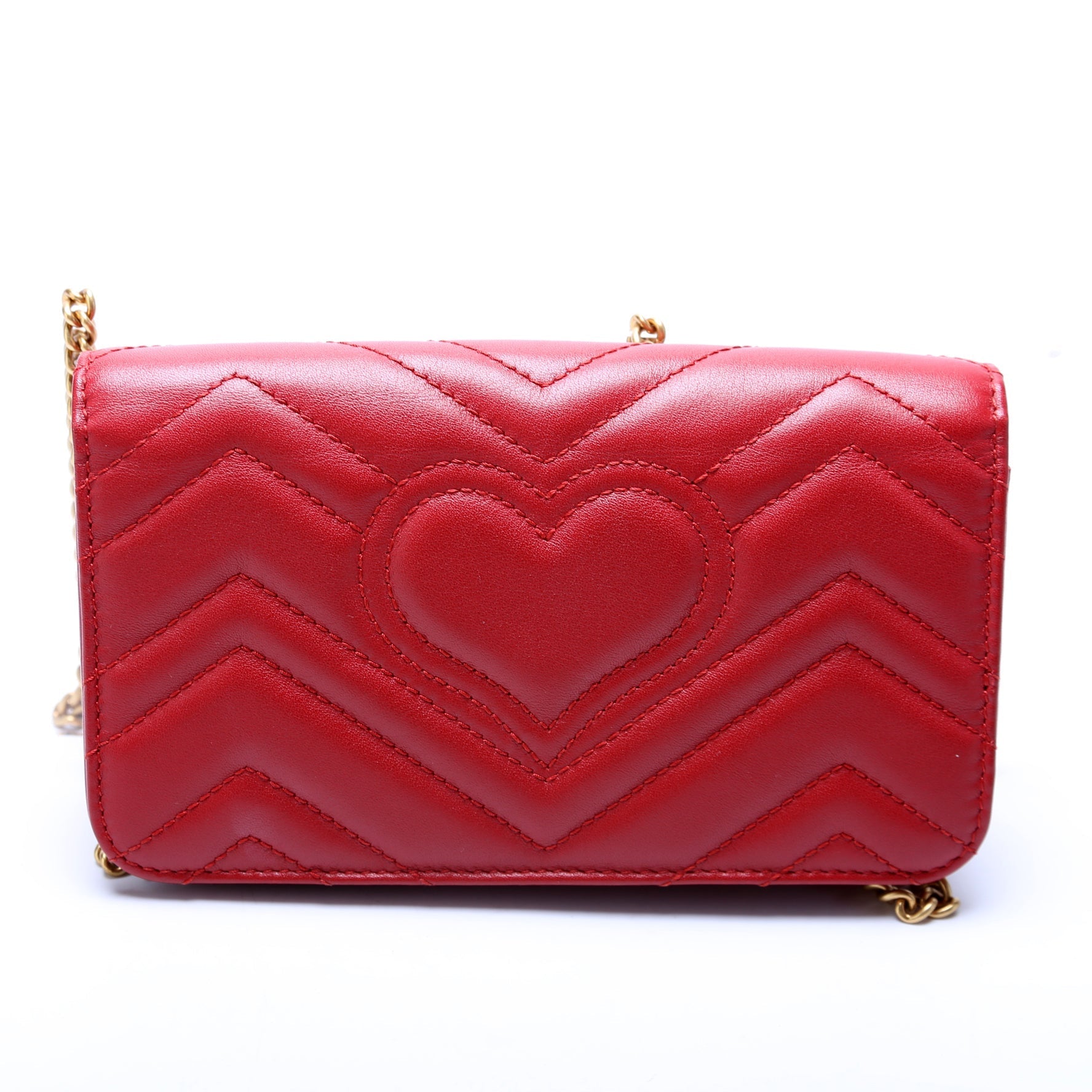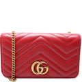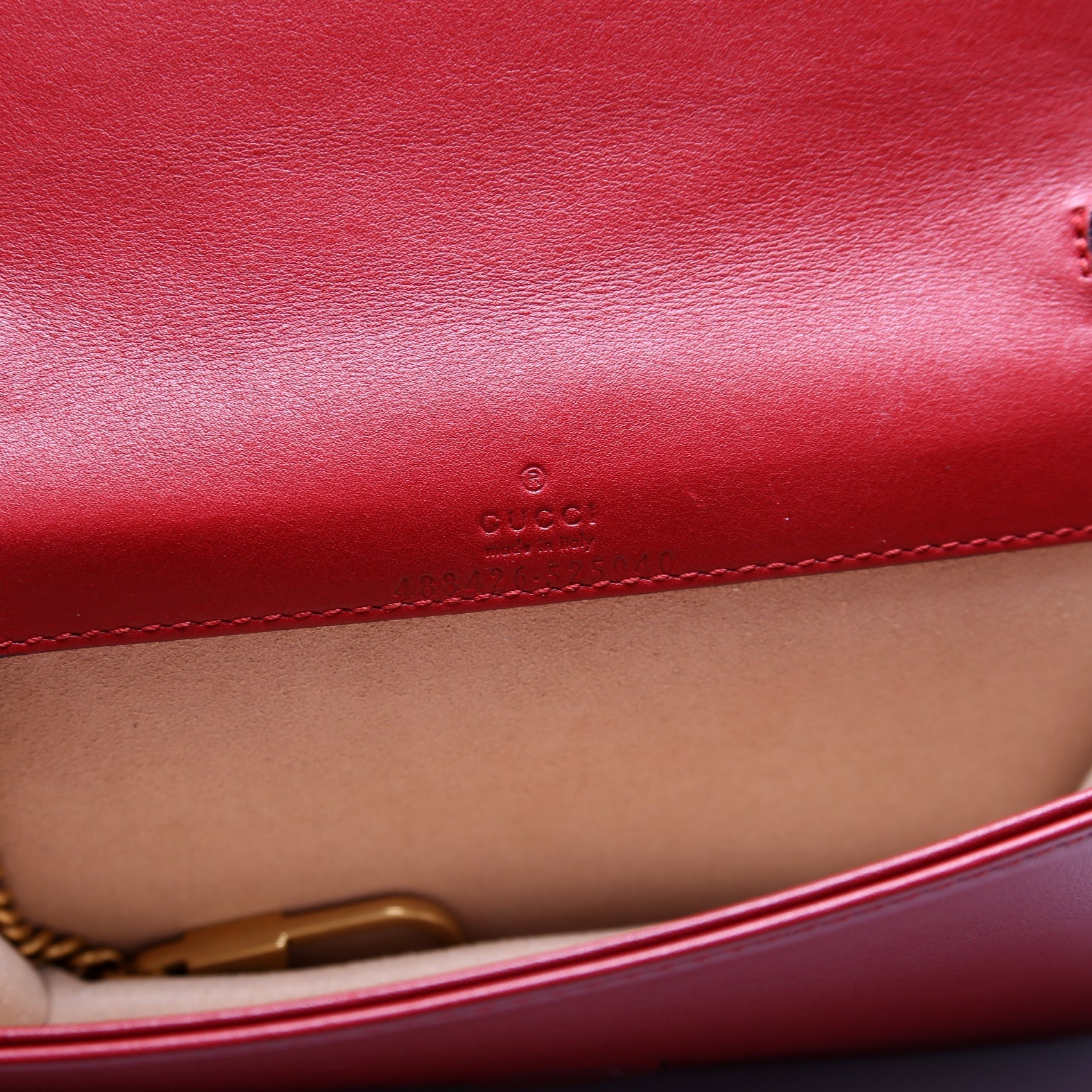 This Gucci GG Marmont Mini Bagis eye catching bag. The exterior is in the classic Gucci Marmont leather.