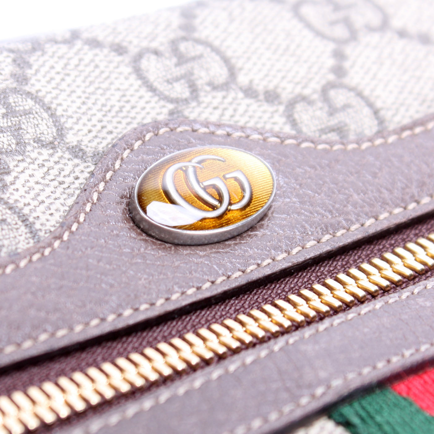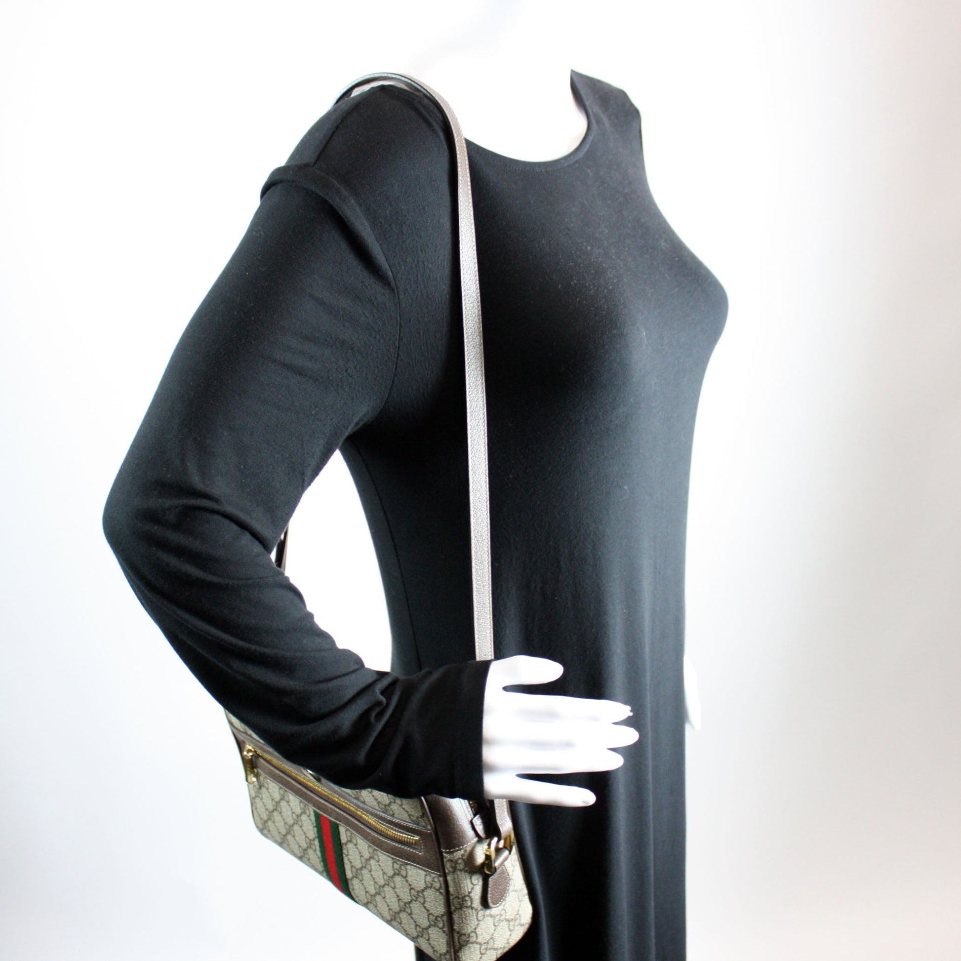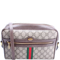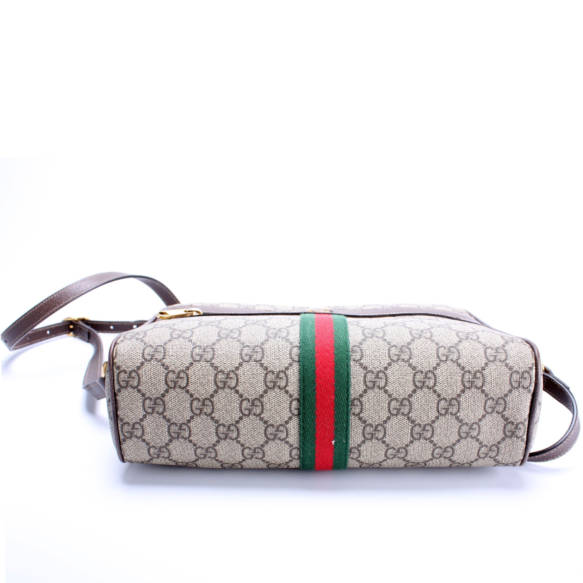 This Gucci Ophidia Crossbodyis eye catching bag. The exterior is in the classic Gucci GG Supreme coated canvas.
