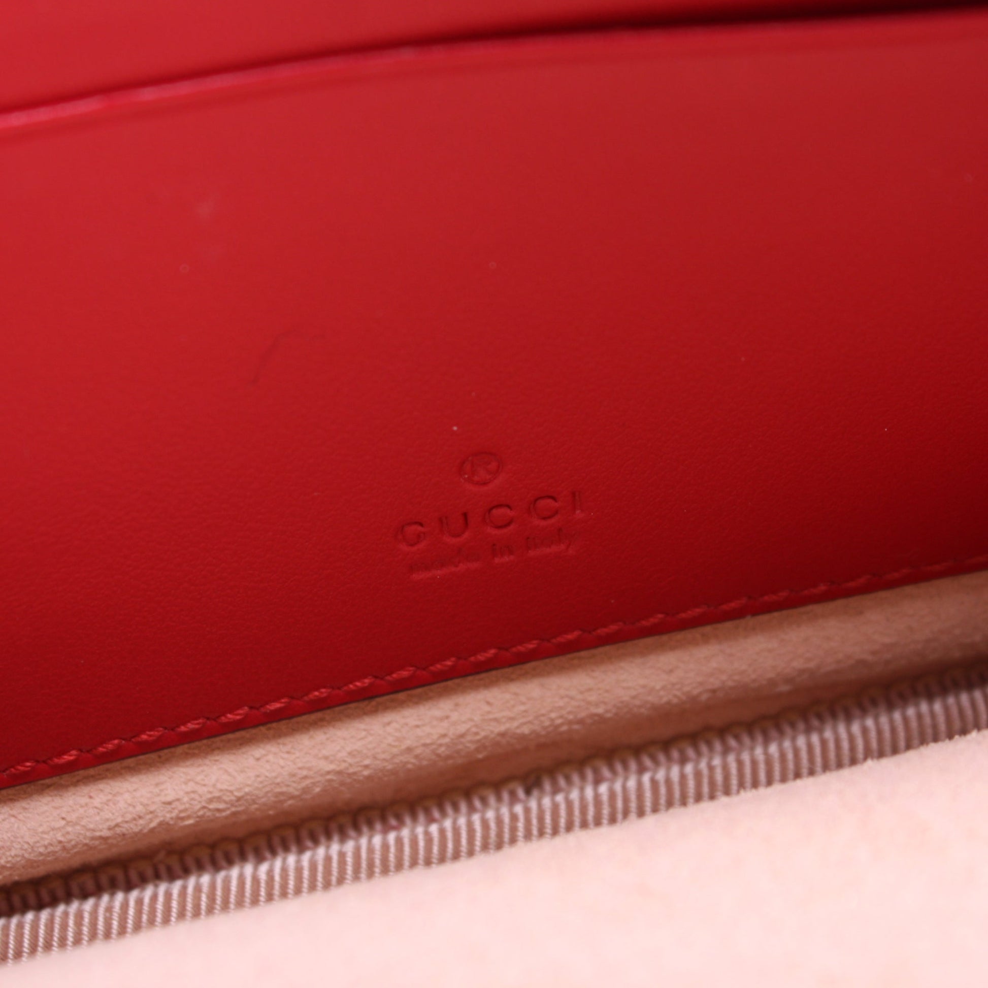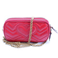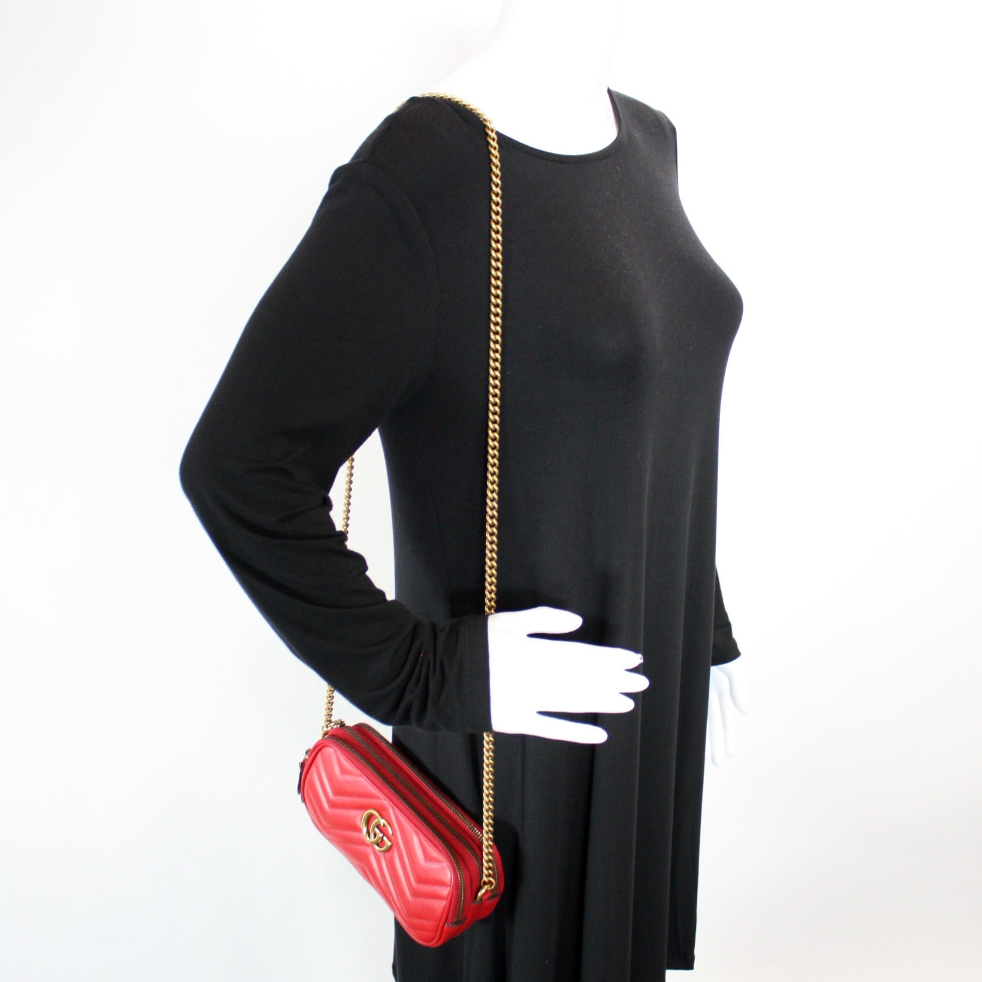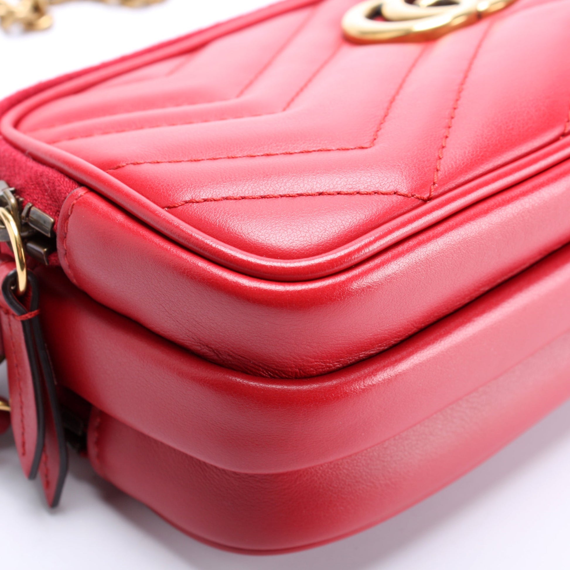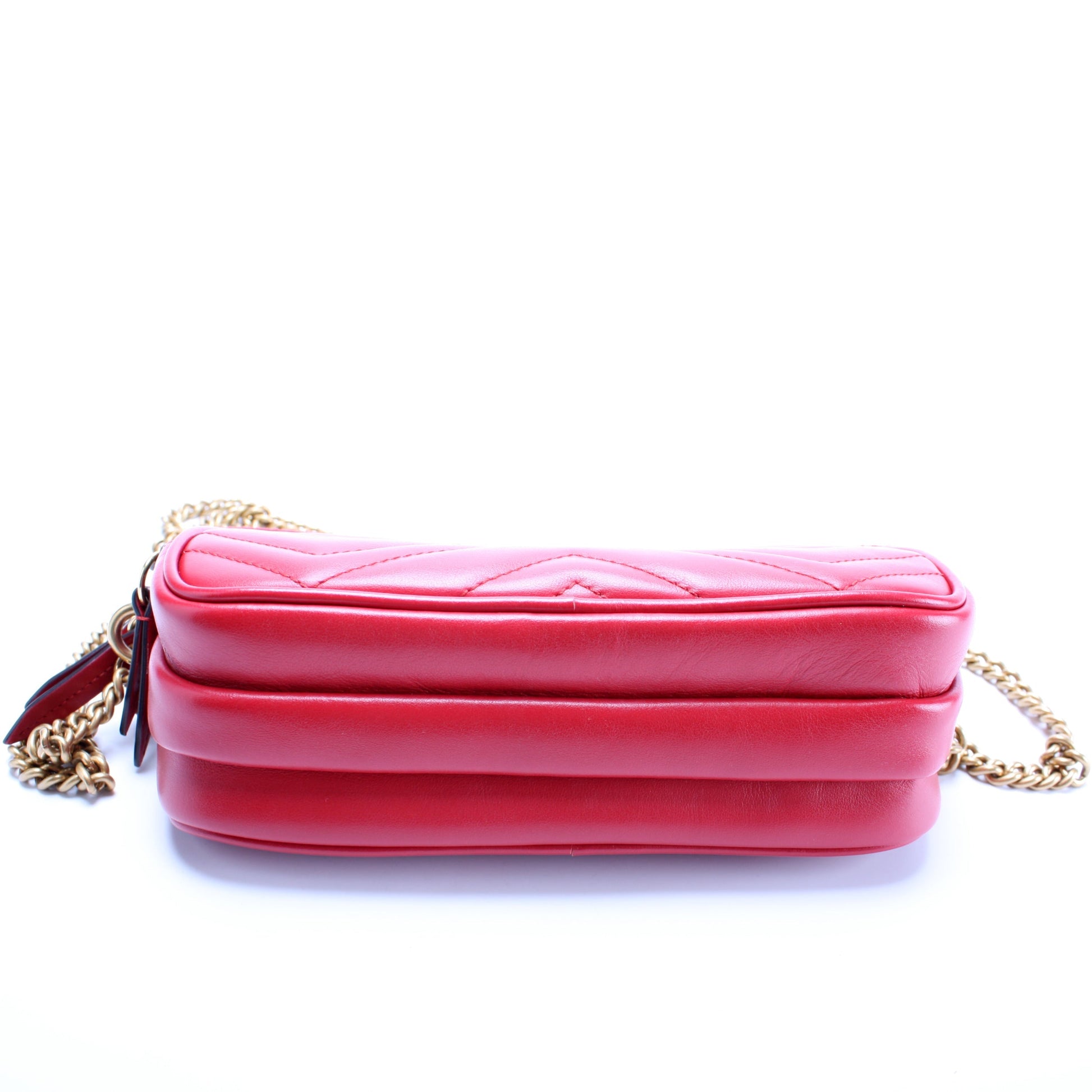 This Gucci GG Marmont Mini With Chainis eye catching bag. The exterior is in the classic Gucci Marmont leather.
