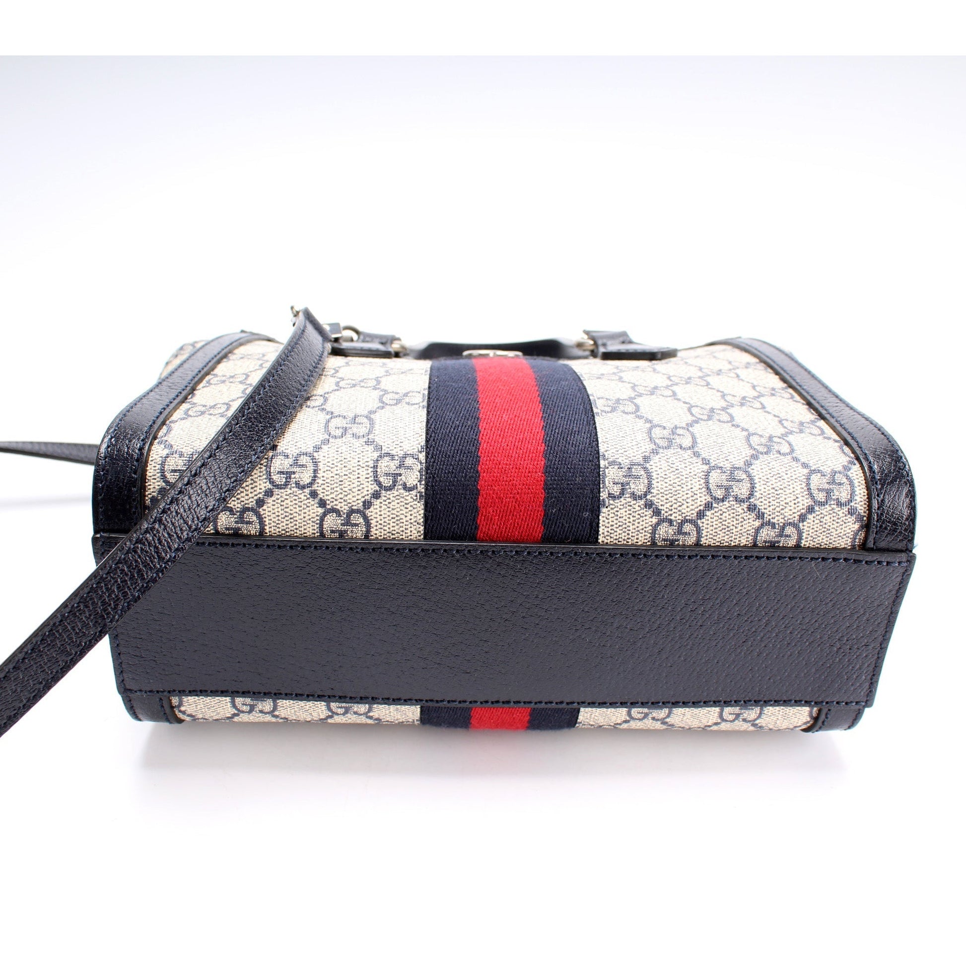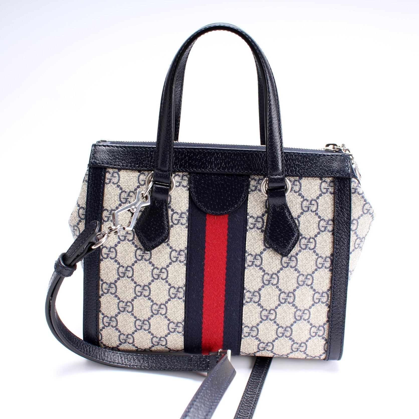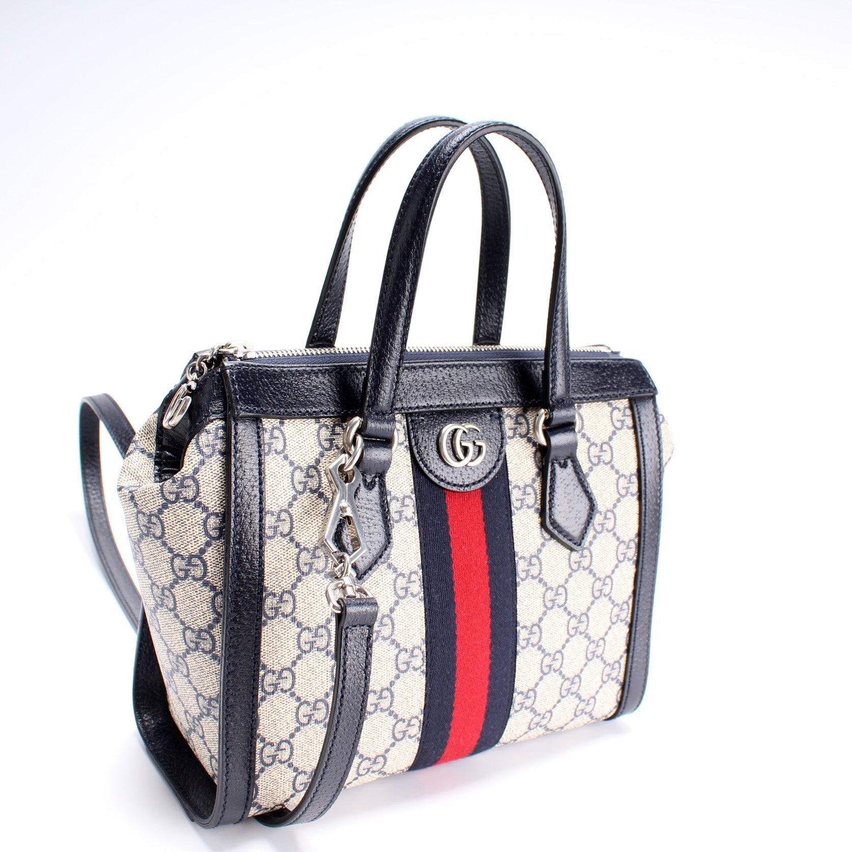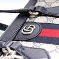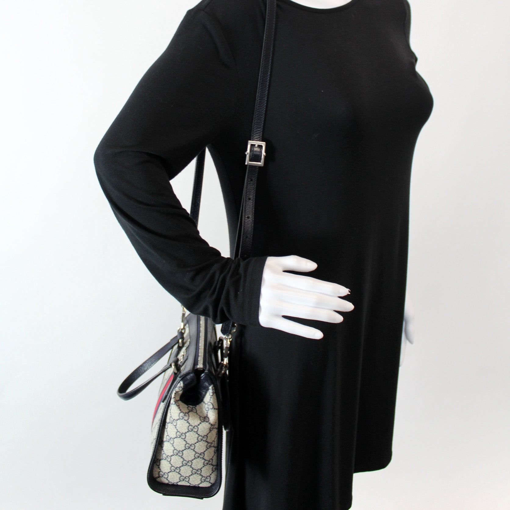 This Gucci Ophidia Small Toteis eye catching bag. The exterior is in the classic Gucci GG Supreme coated canvas.