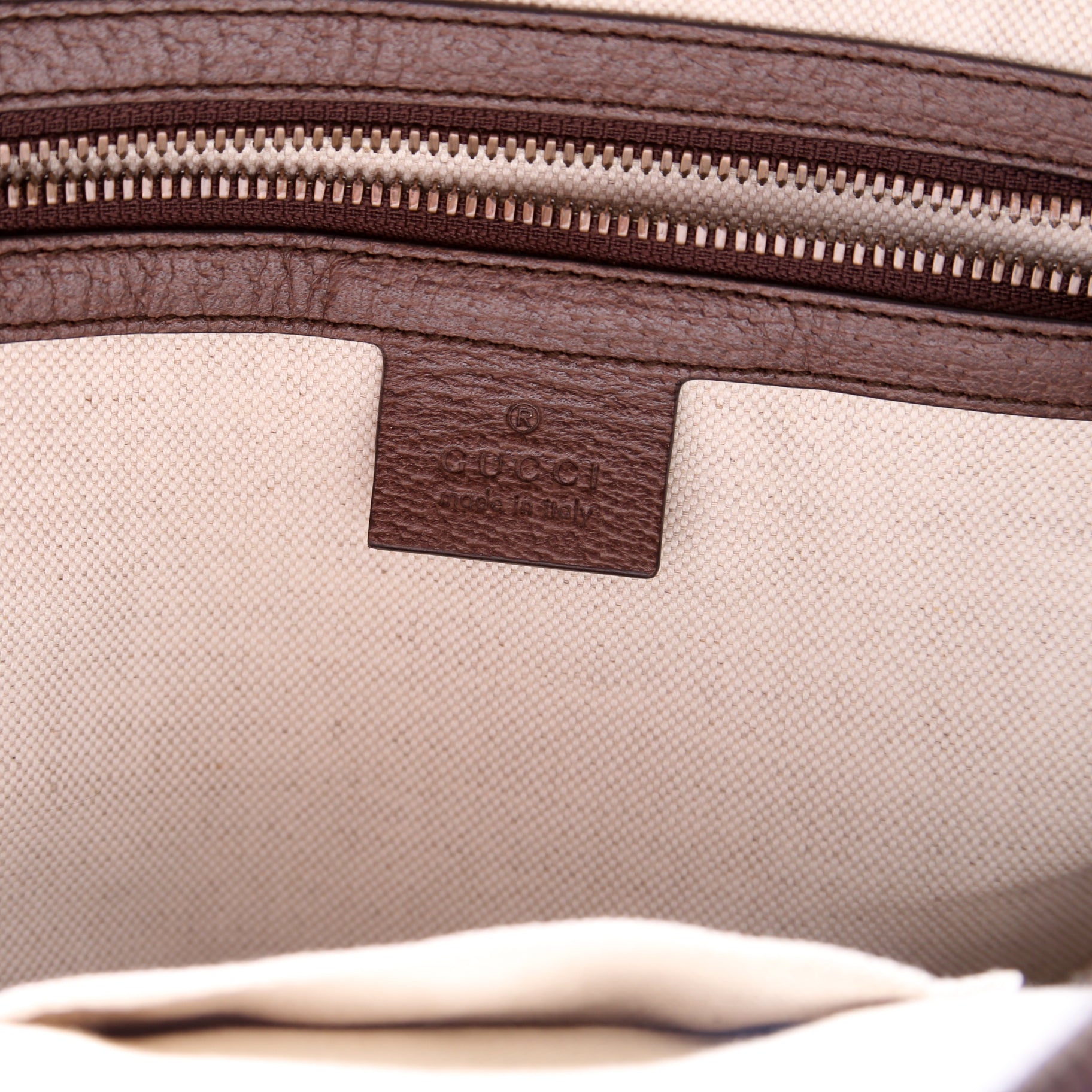 Exterior: The exterior coated canvas is free of any rips or cracks. The corners and leather trim show minor wear throughout. The exterior features one zip closure pocket.