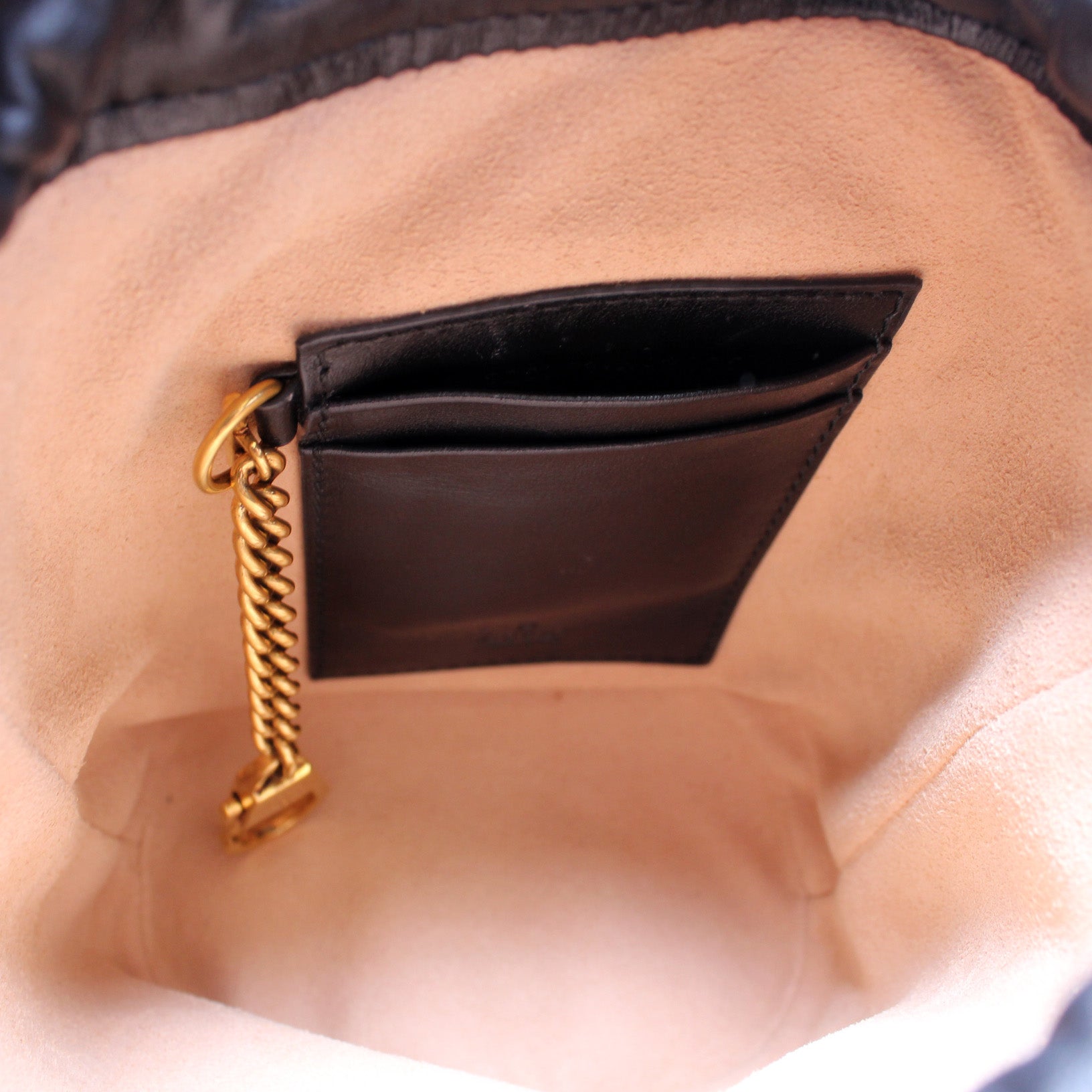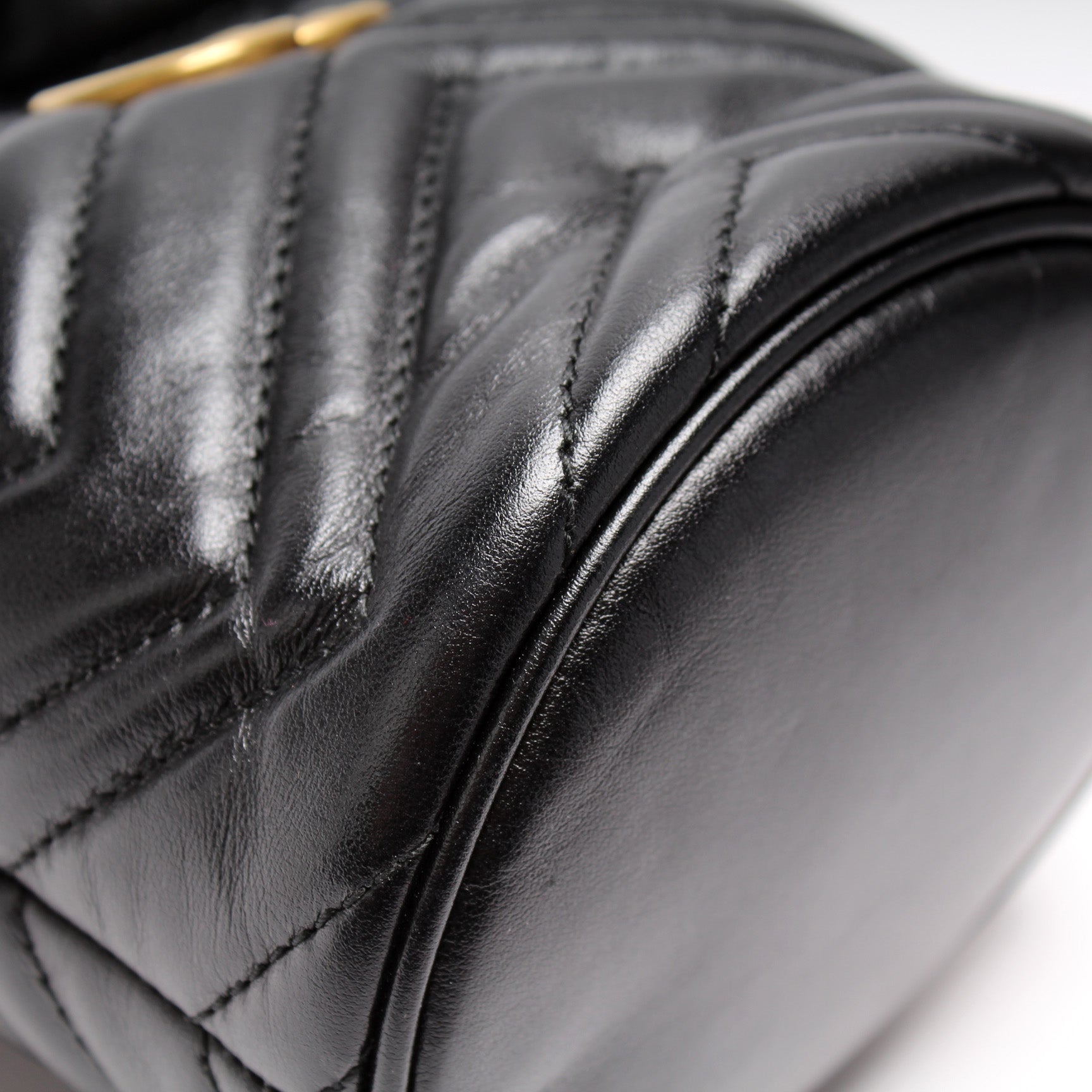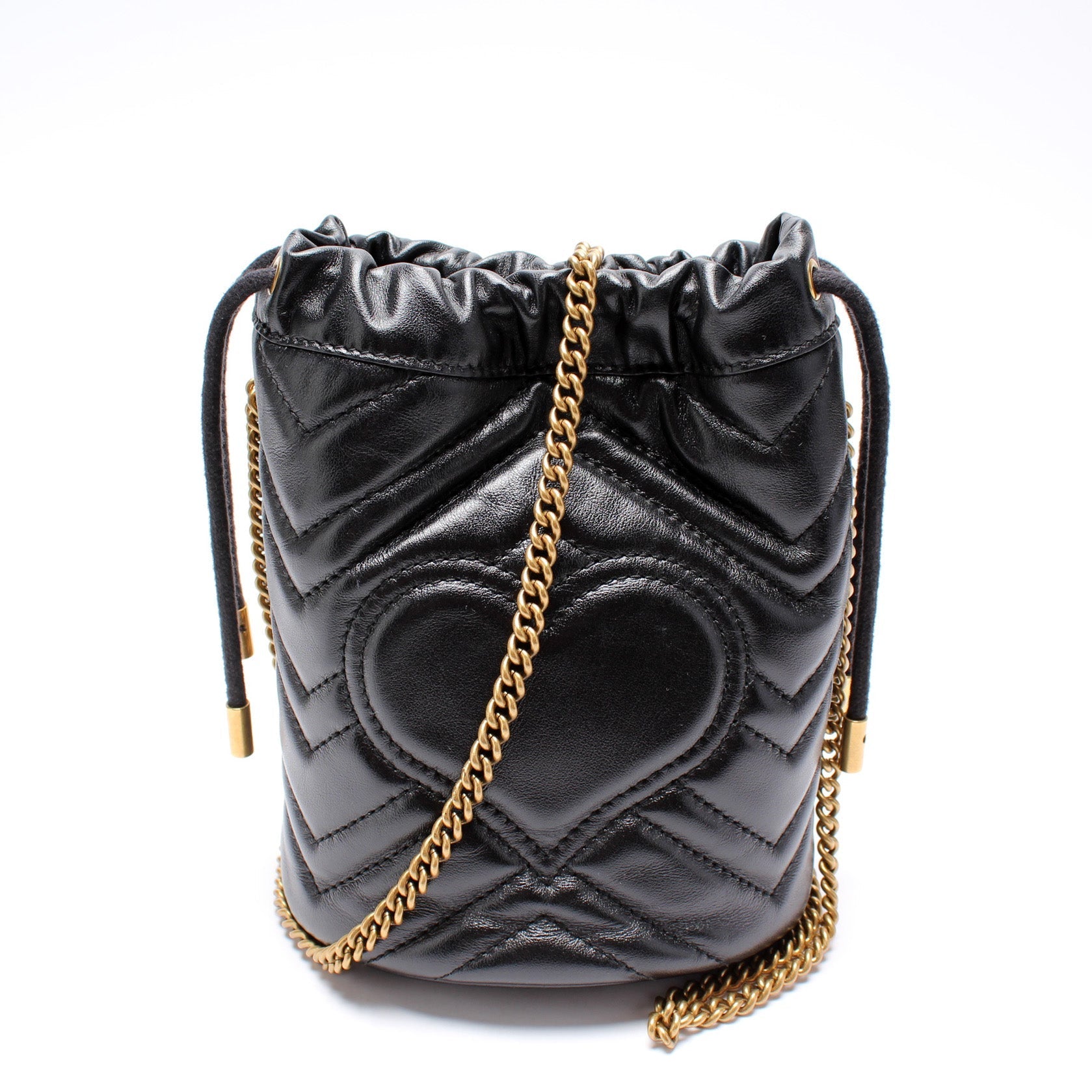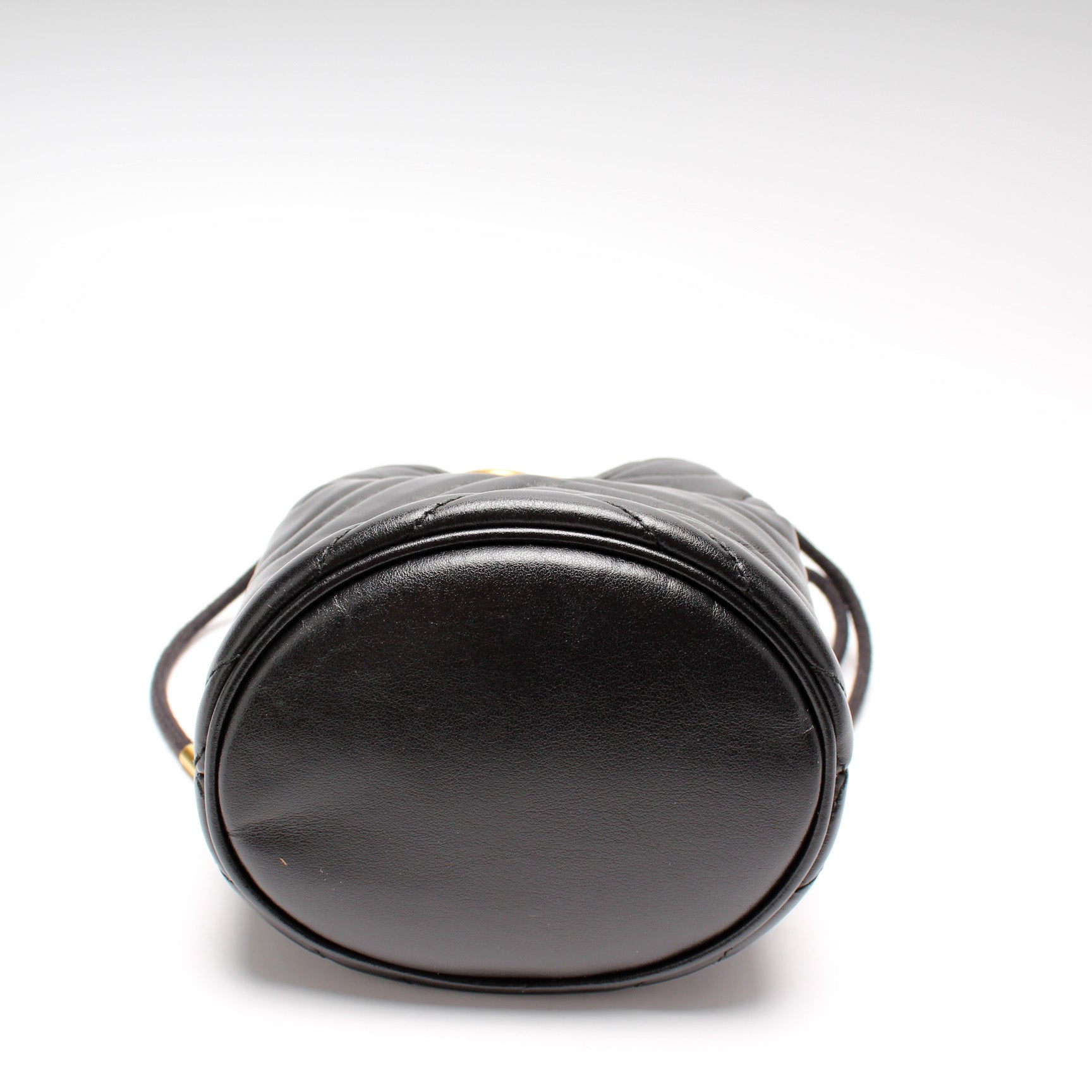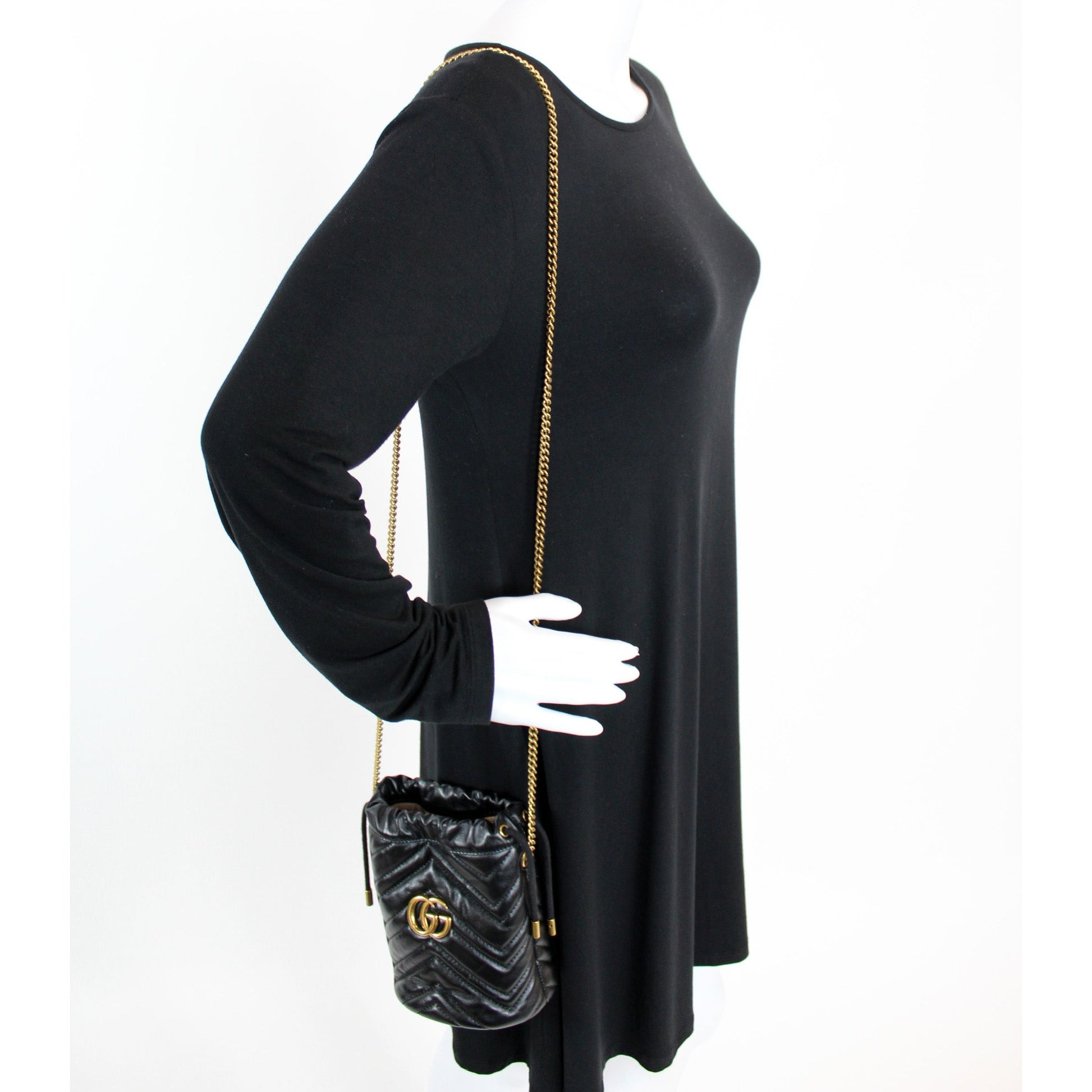 This Gucci 575163 Mini Bucketis eye catching bag. The exterior is in the classic Gucci Marmont leather.