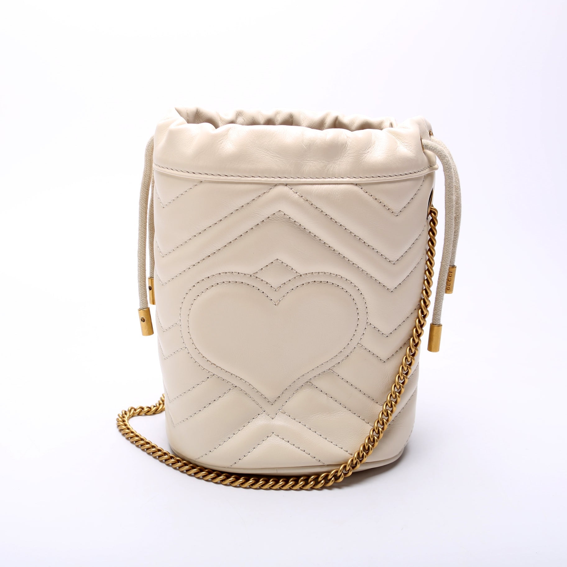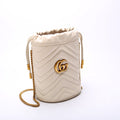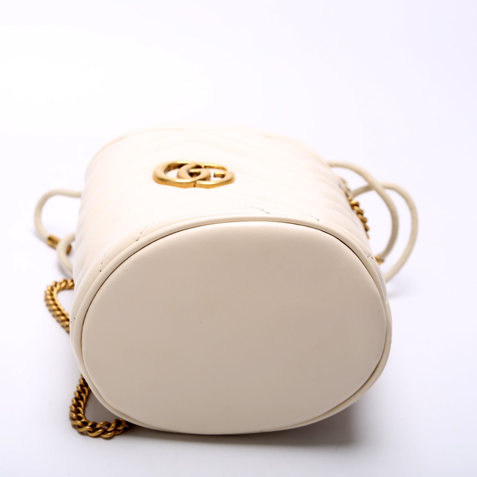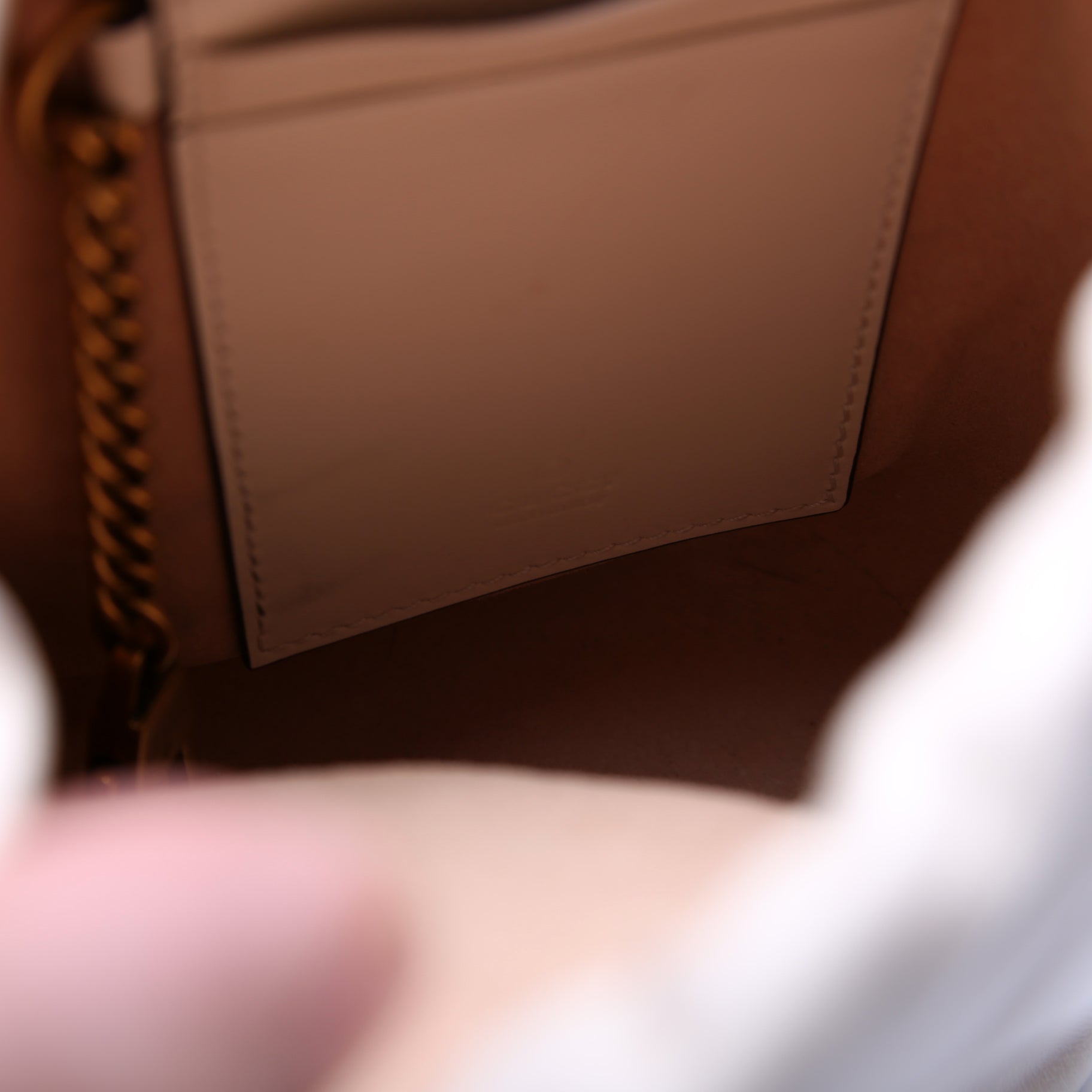 This Gucci Marmont Mini Bucketis eye catching bag. The exterior is in the classic Gucci Marmont leather.