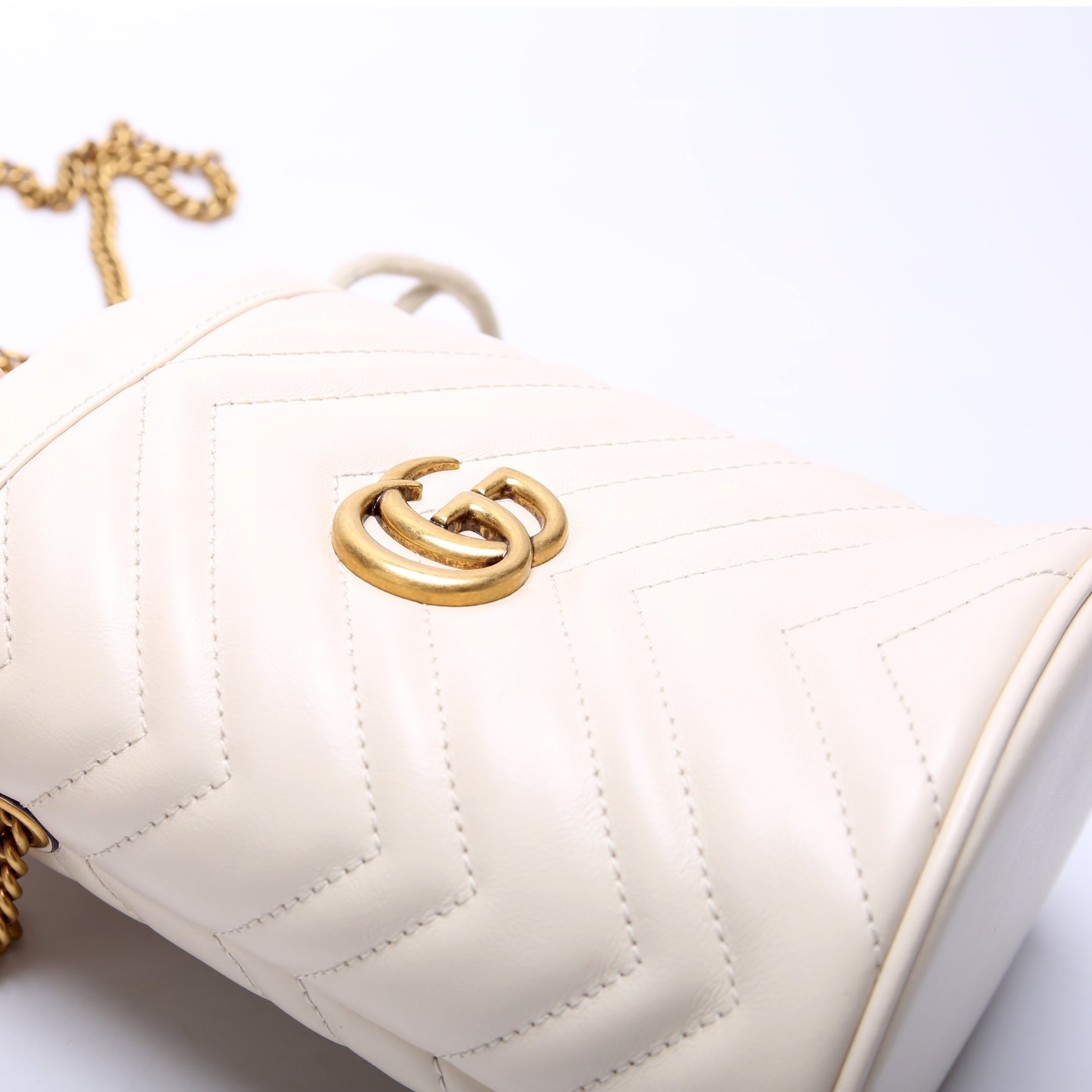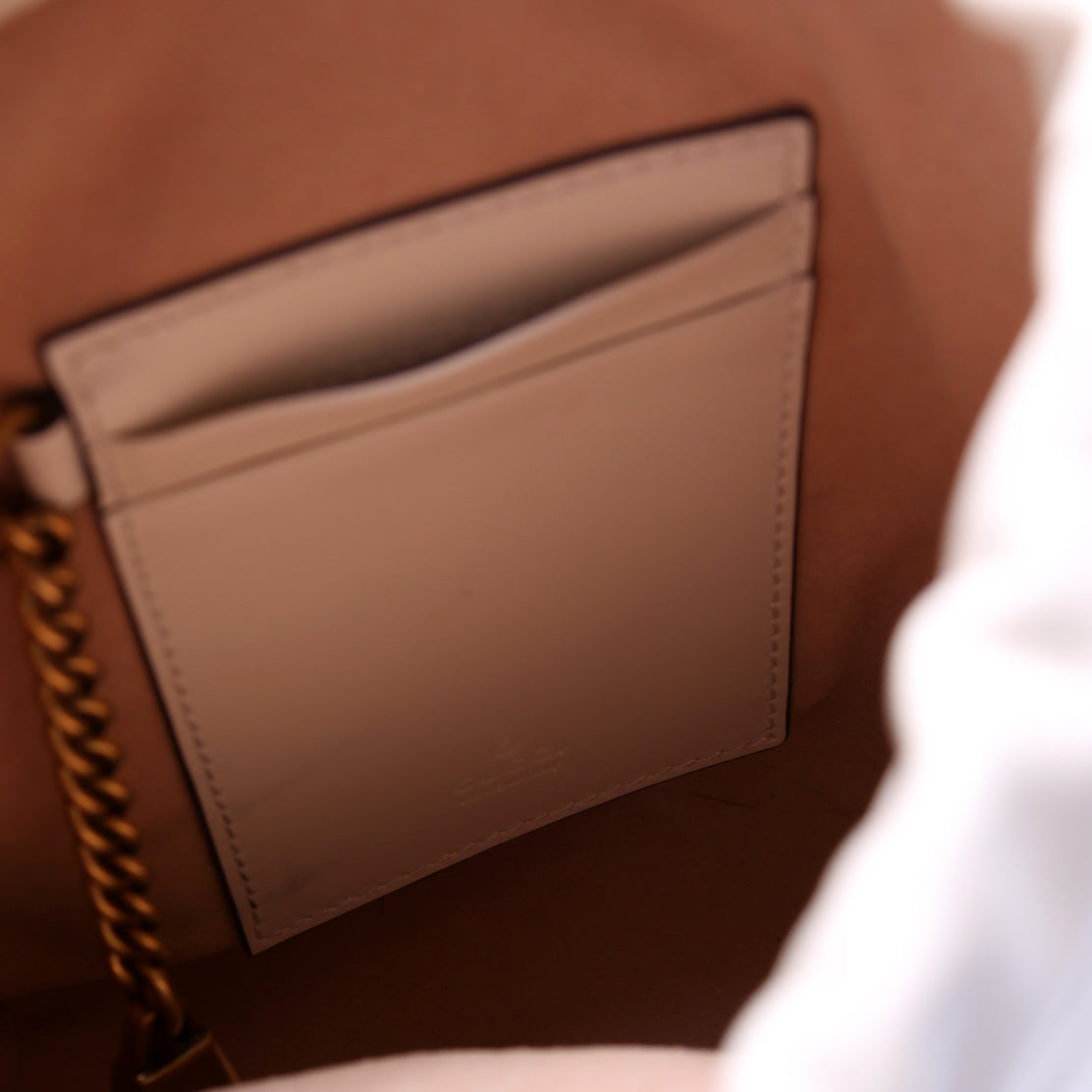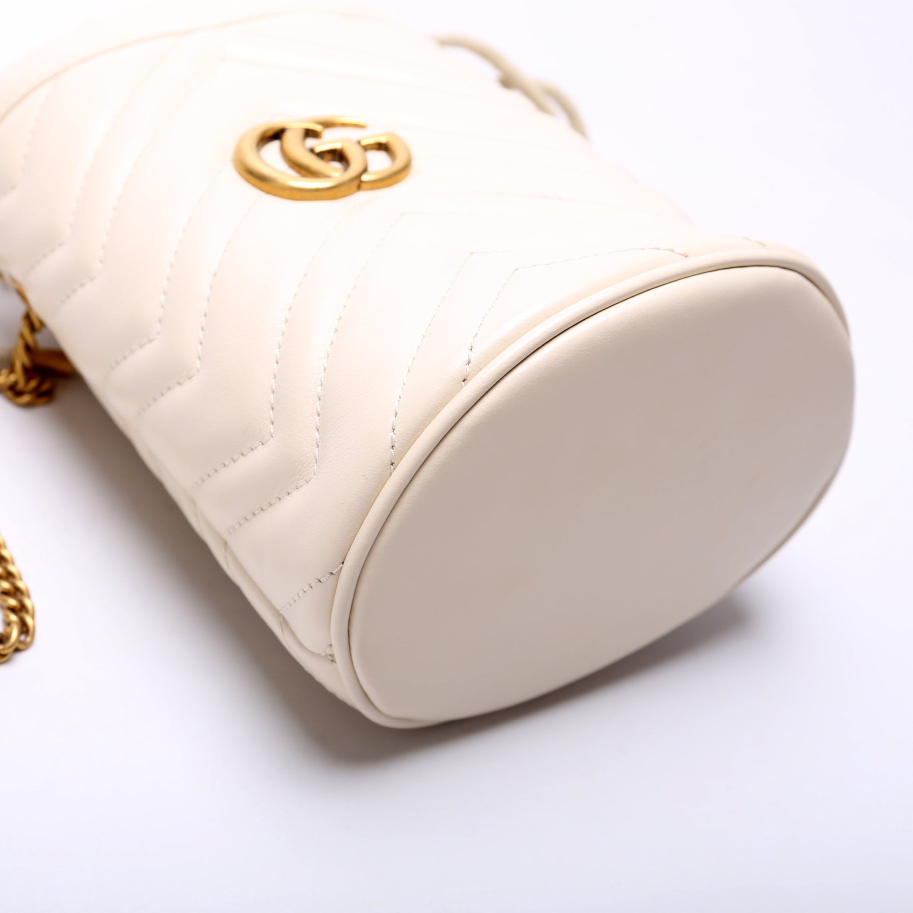 This Gucci Marmont Mini Bucketis eye catching bag. The exterior is in the classic Gucci Marmont leather.