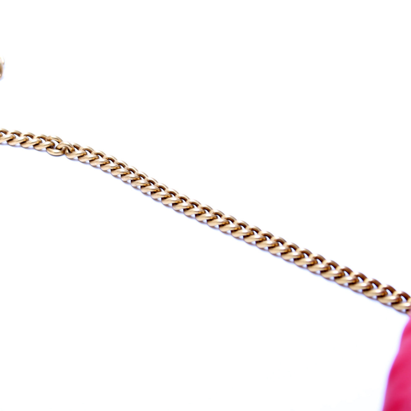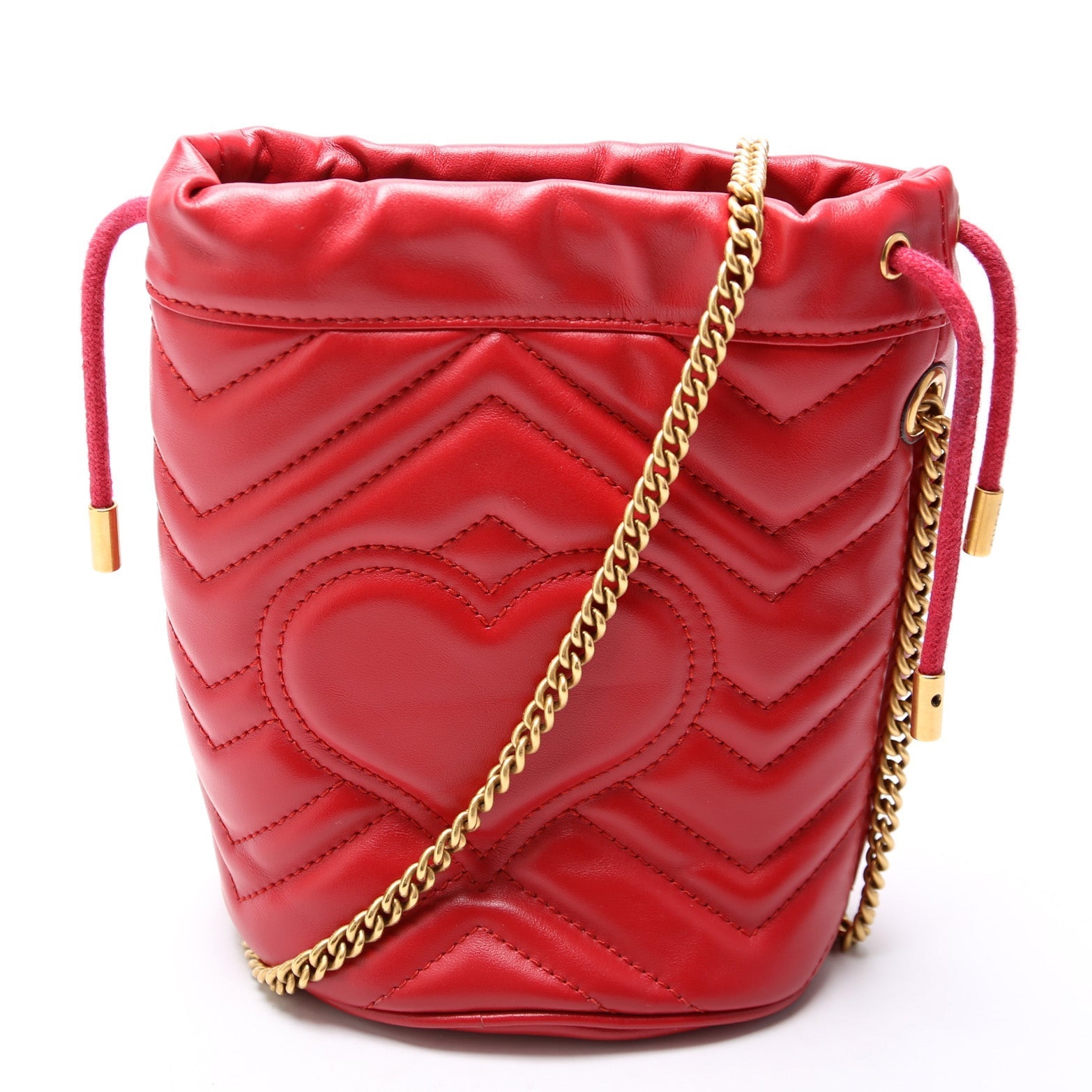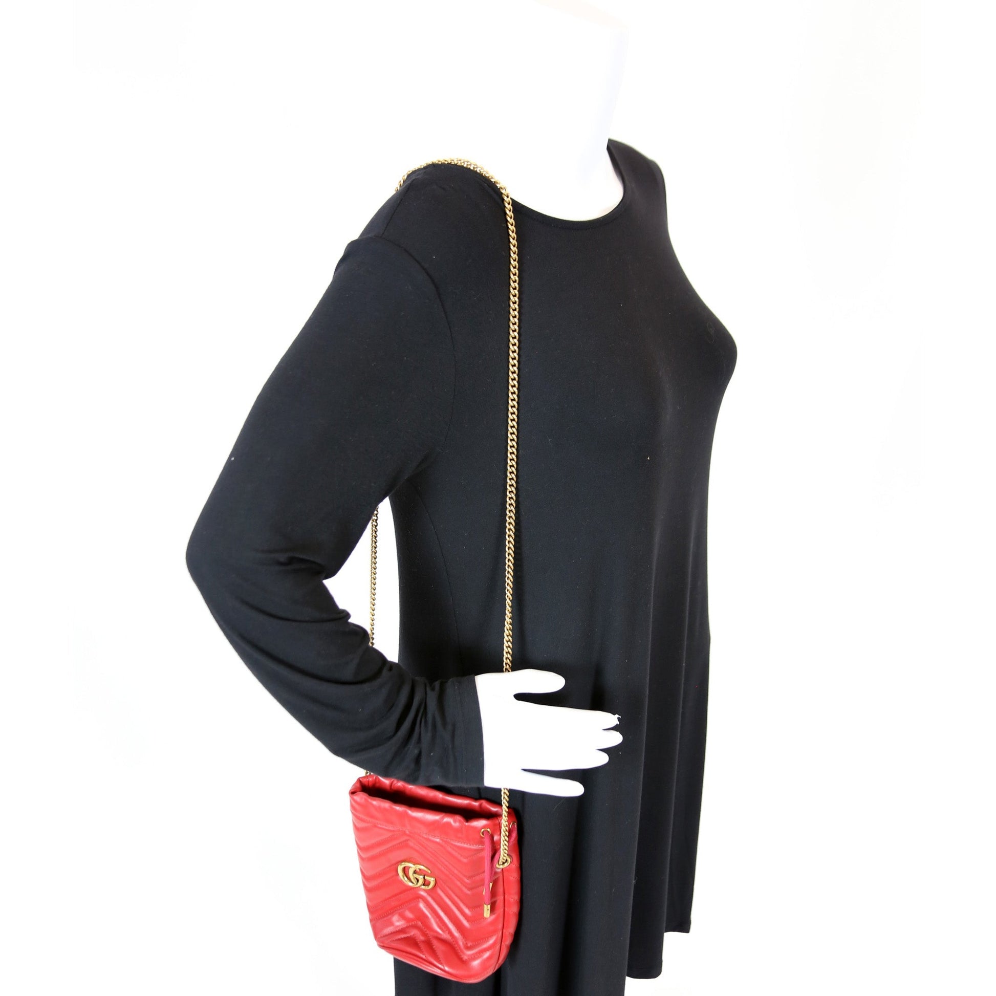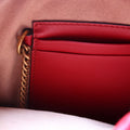 This Gucci Marmont Mini Bucketis eye catching bag. The exterior is in the classic Gucci Marmont leather.