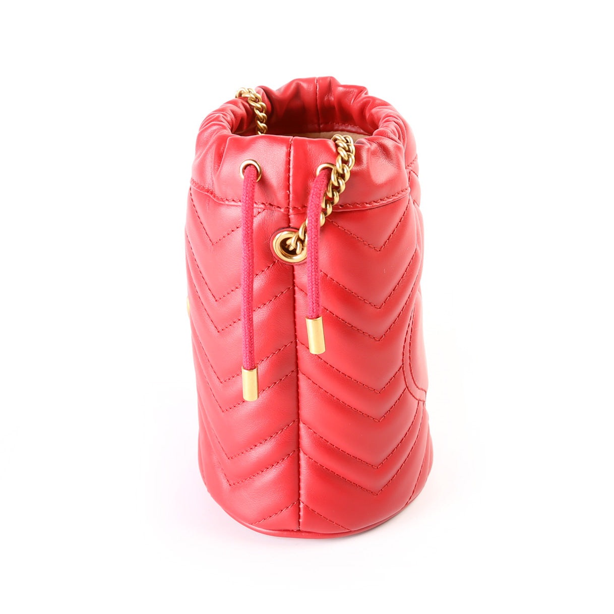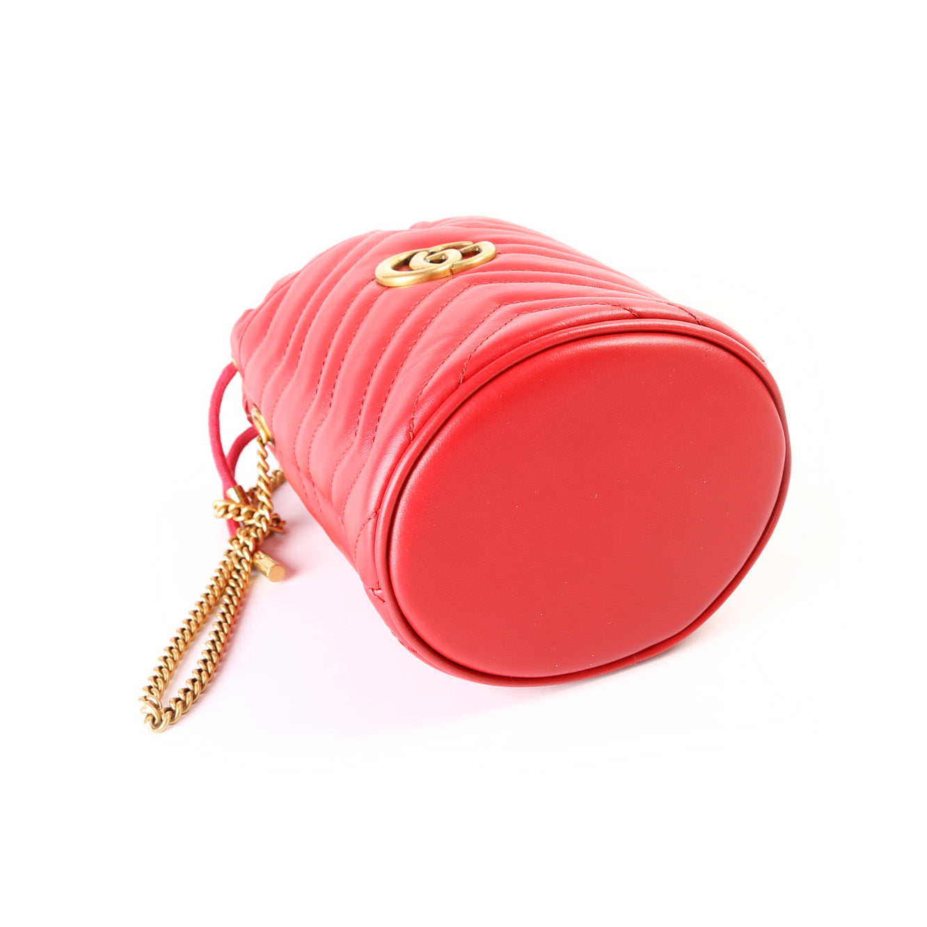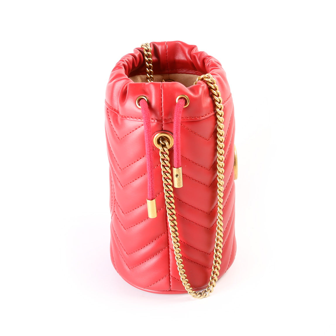 This Gucci Marmont Mini Bucketis eye catching bag. The exterior is in the classic Gucci Marmont leather.