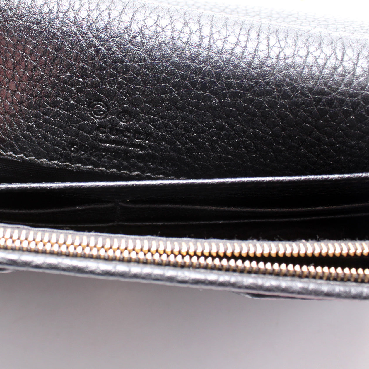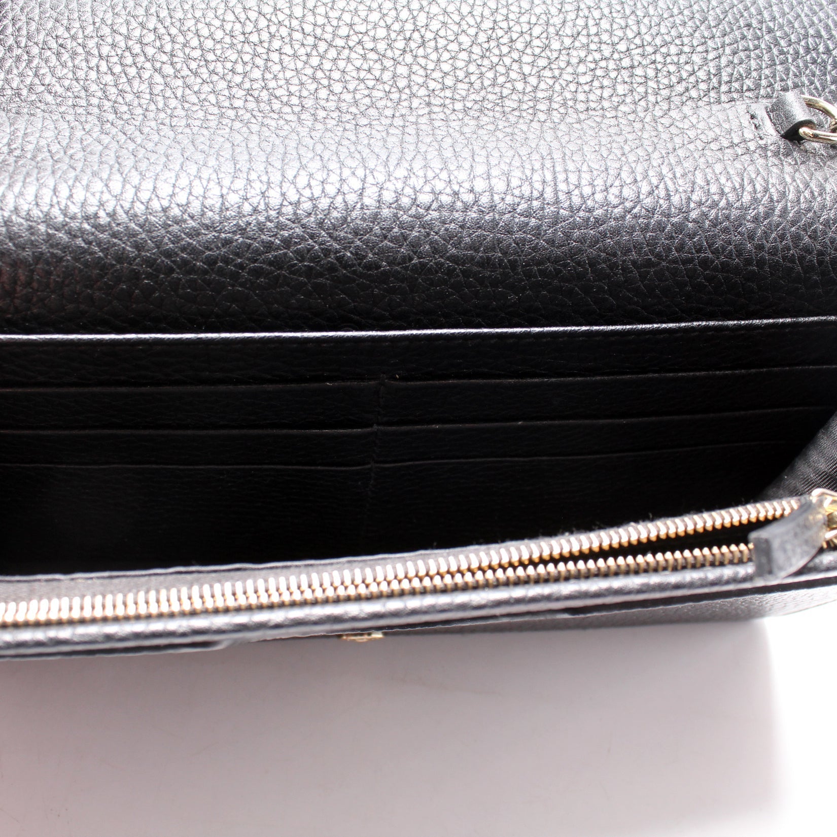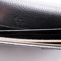 Interior: The interior shows light wear throughout. The interior features six card slots, two open pockets, and one zip closure pocket.