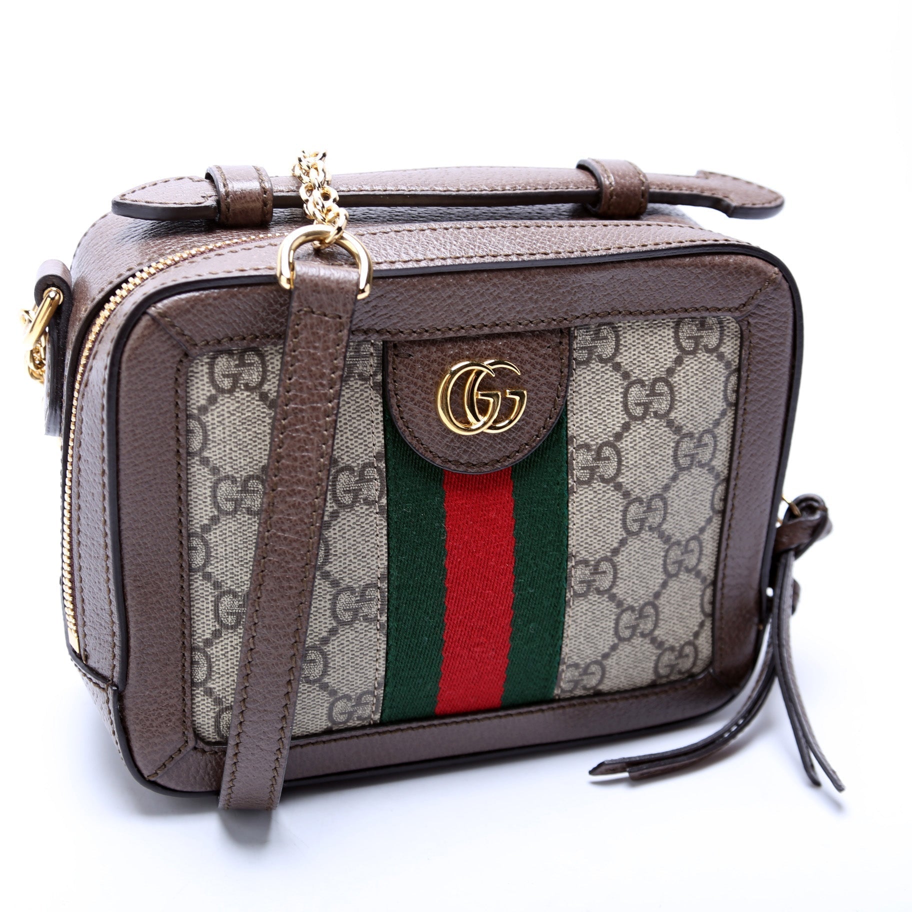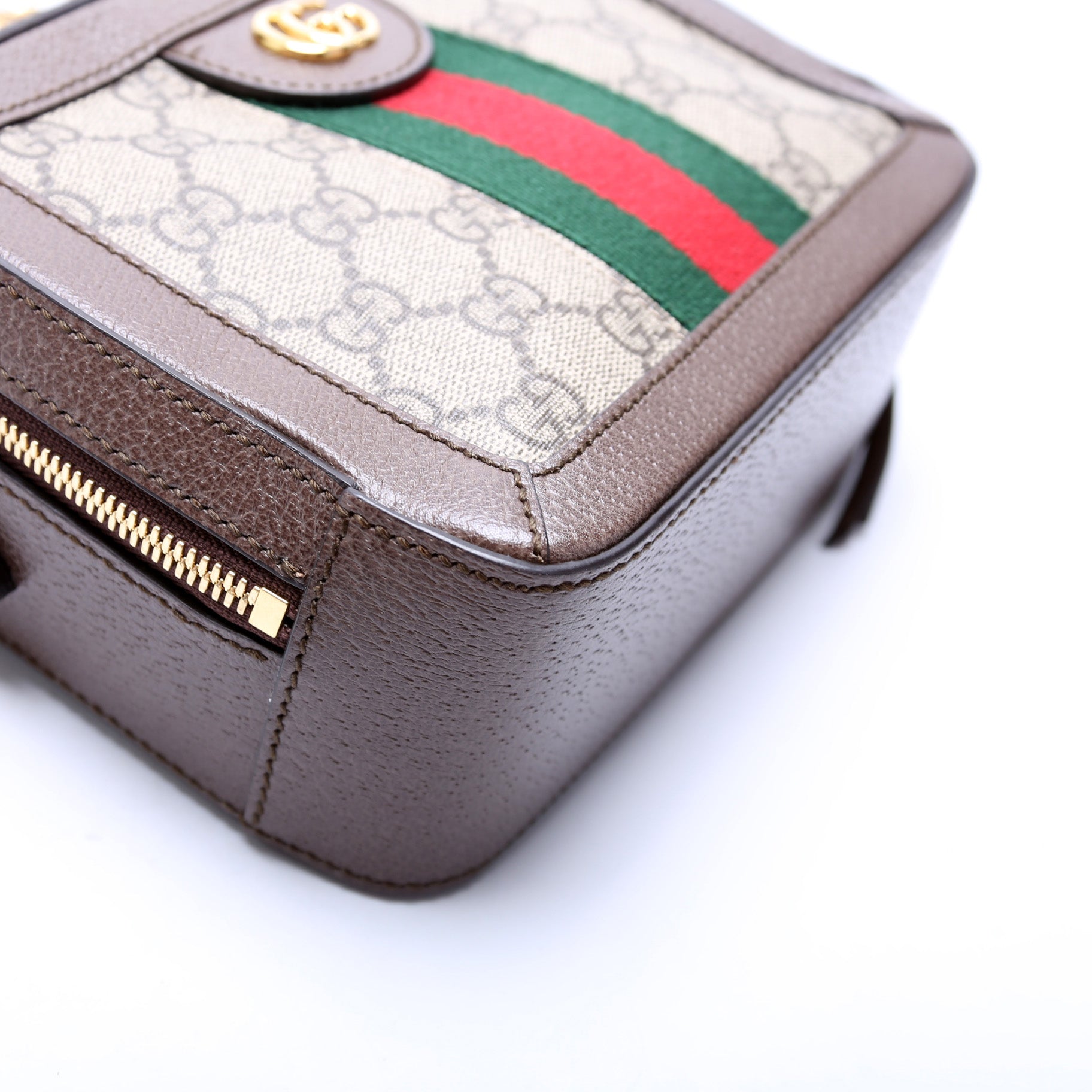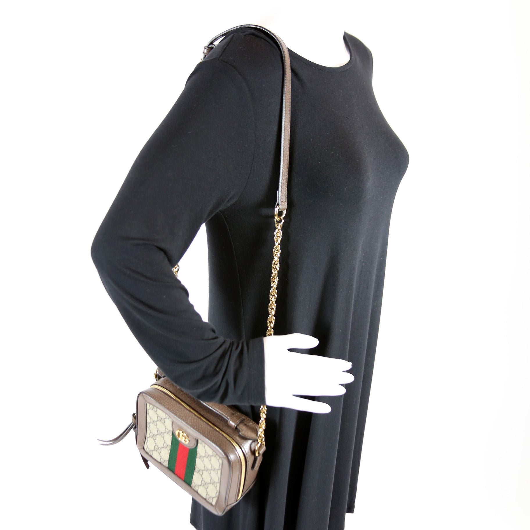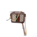 This Gucci Ophidia Mini Shoulder Bagis eye catching bag. The exterior is in the classic Gucci GG Supreme coated canvas.