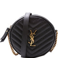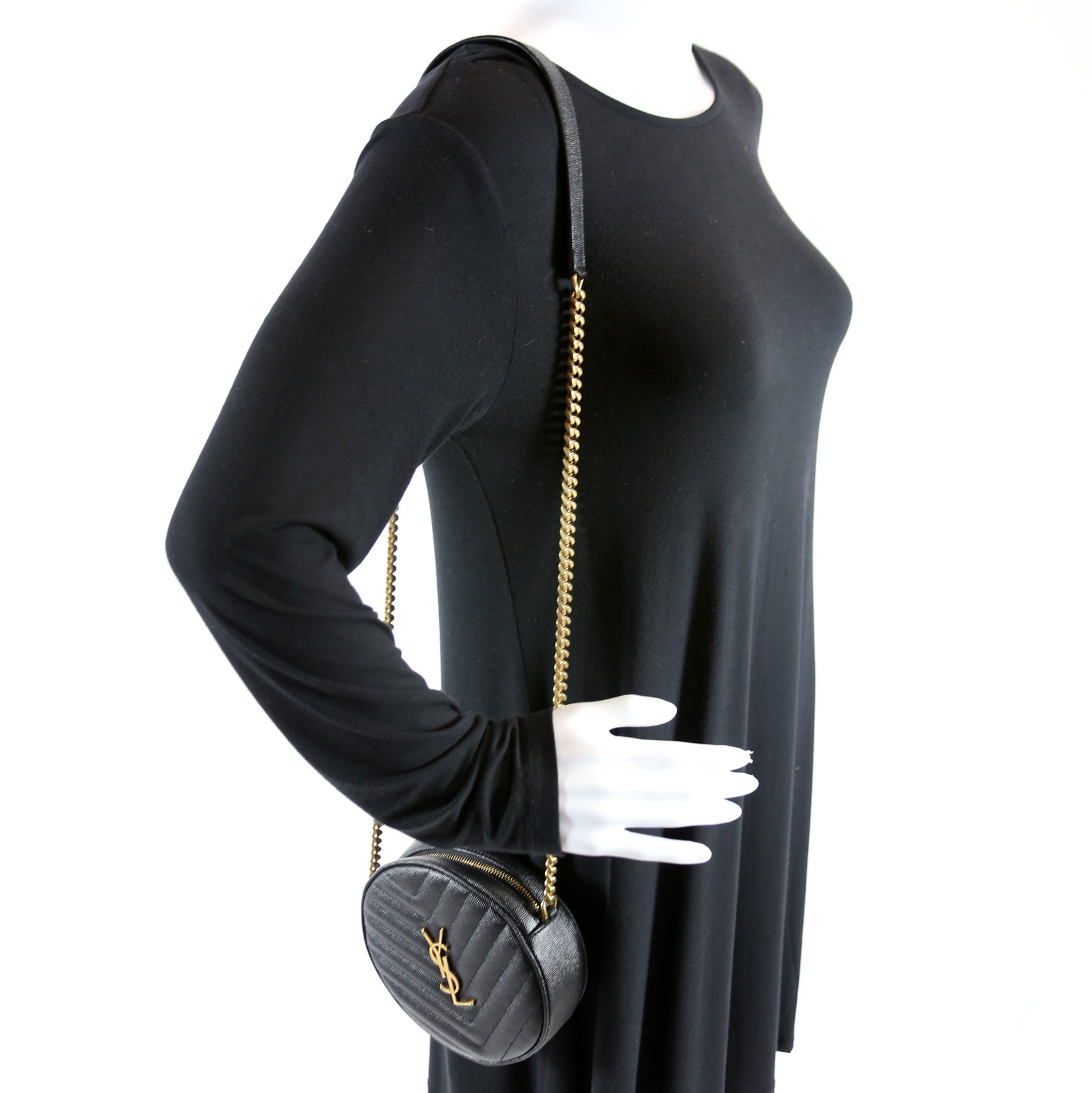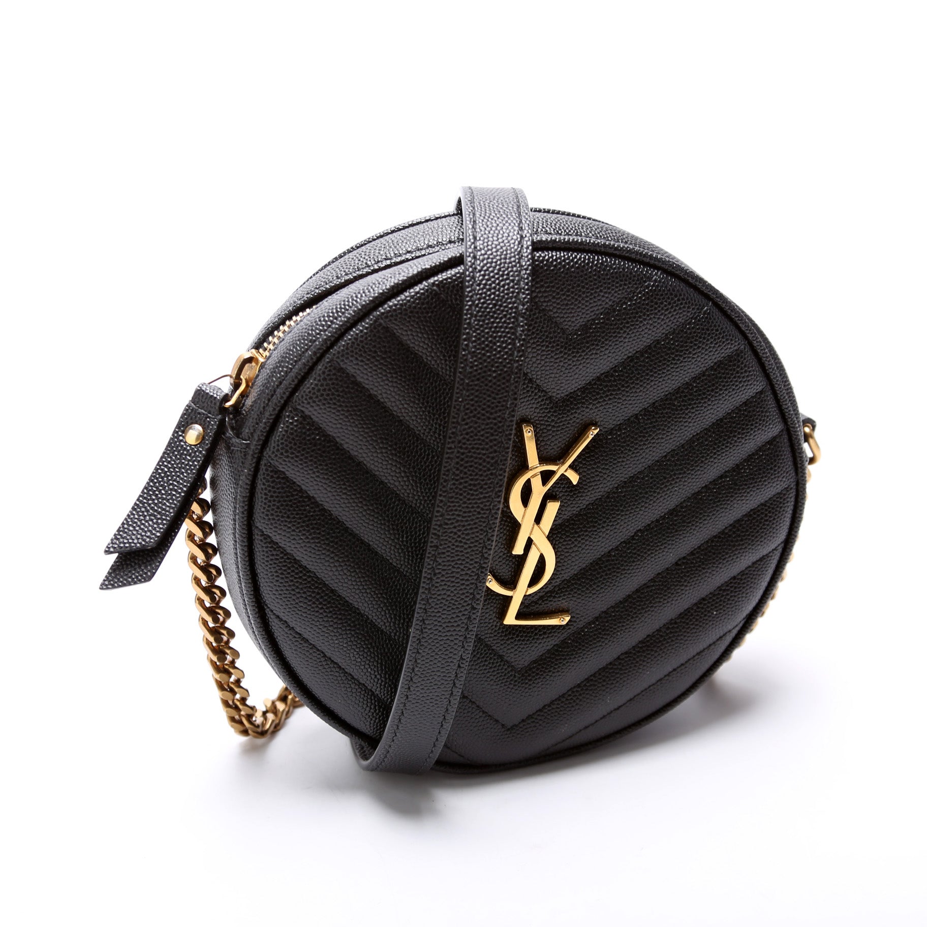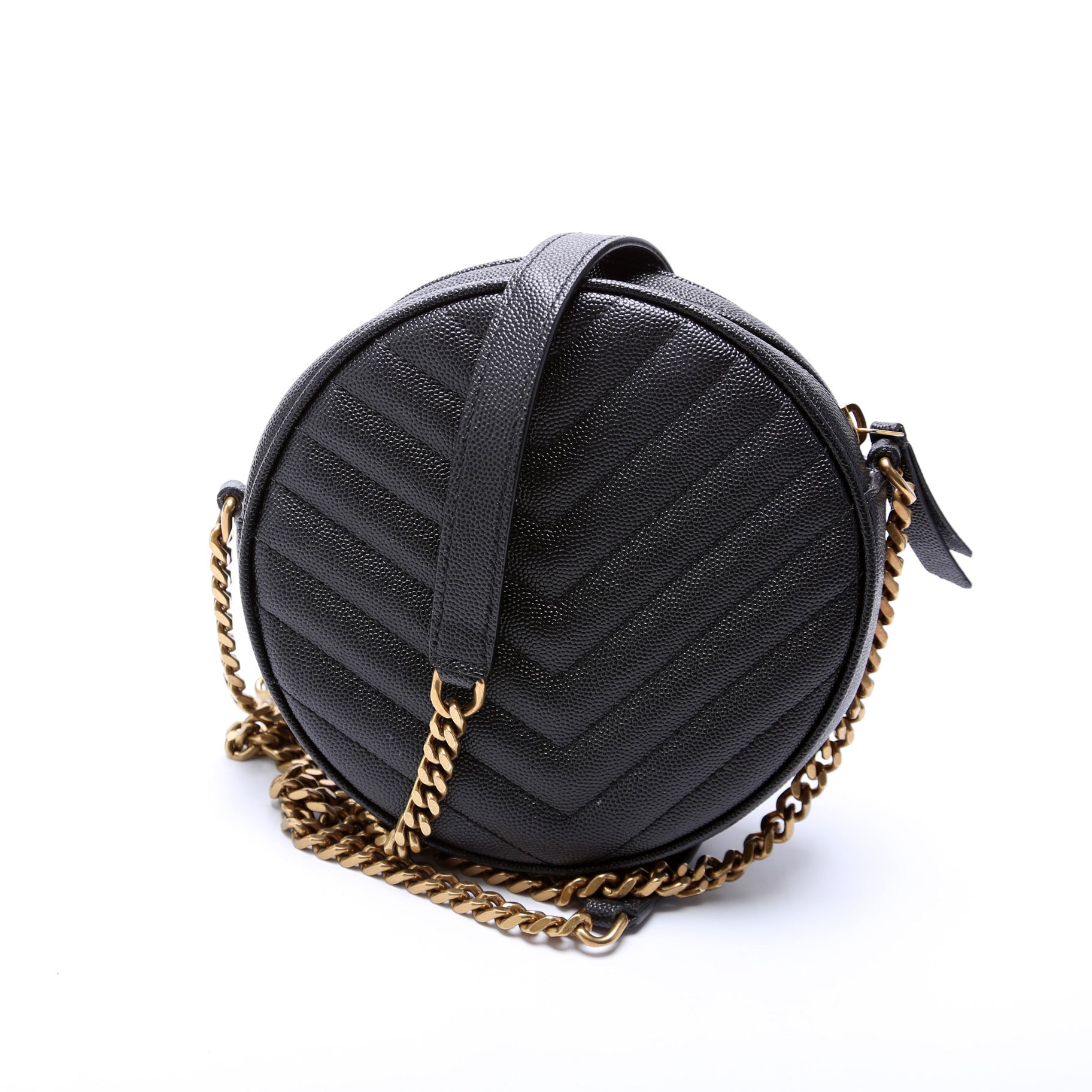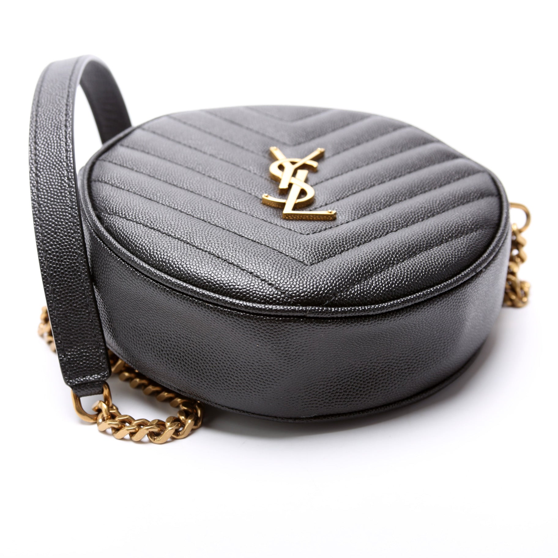 This Saint Laurent Round Camera Bagis eye catching bag. The exterior is in the classic Grain De Poudre leather.