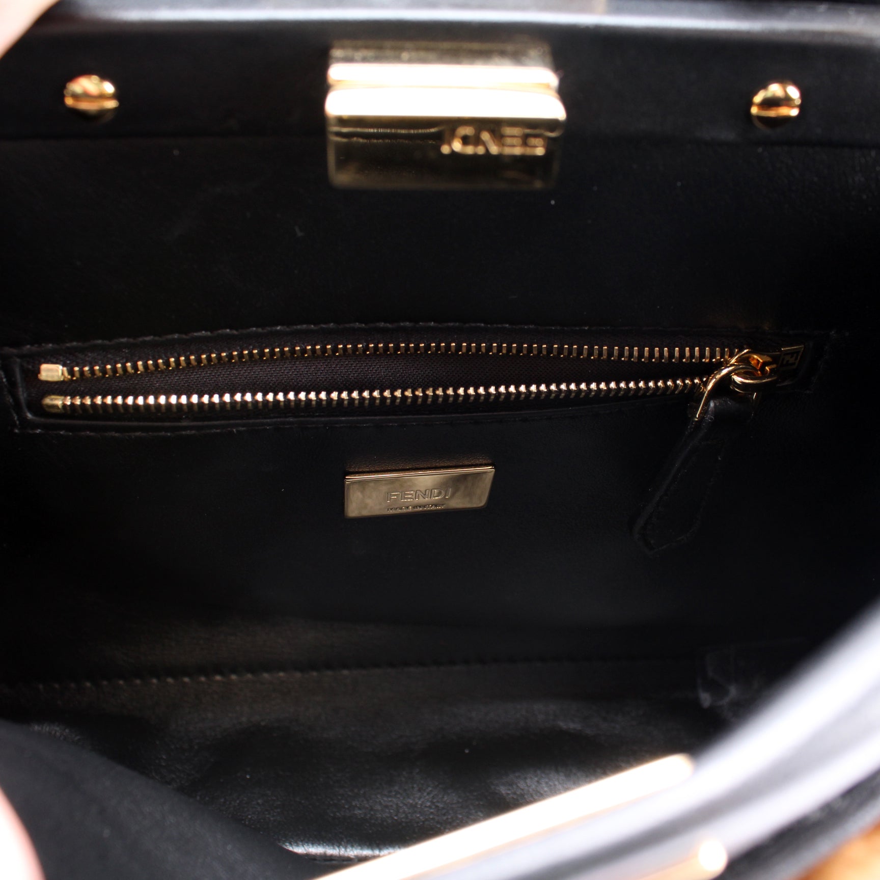 Interior: The interior is clean and free of rips or tears. The interior features two twist lock sections, one zip closure pocket, and one open pocket.