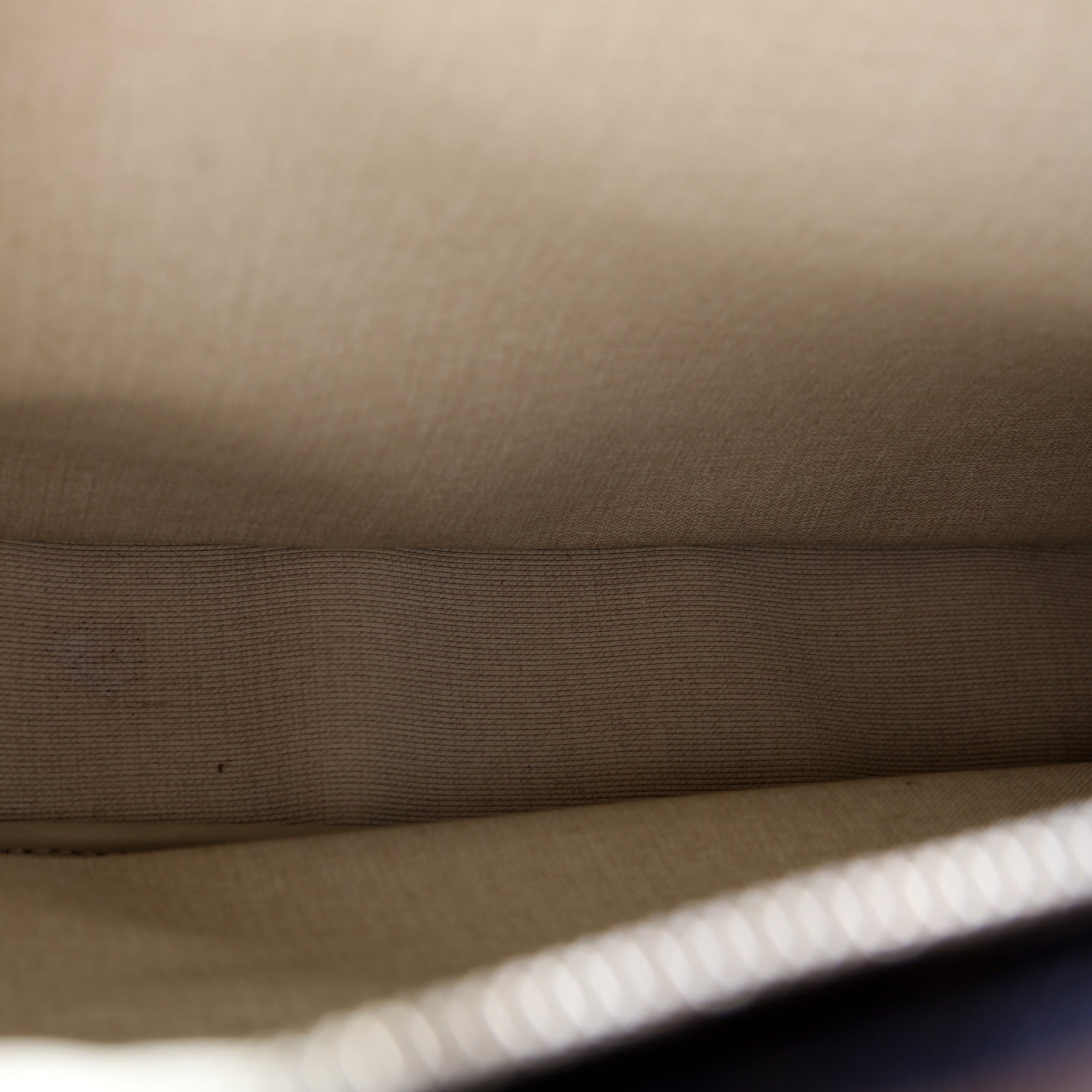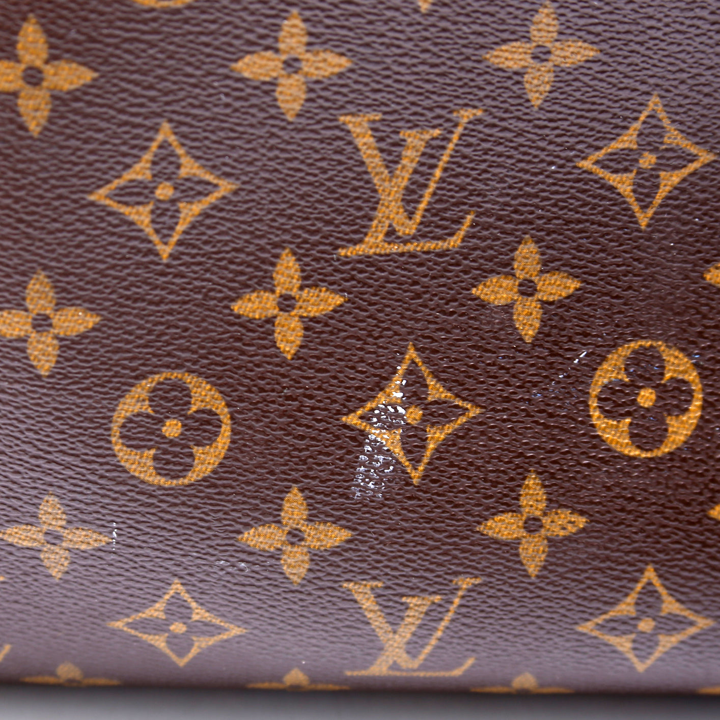 Exterior: The exterior coated canvas is free of any rips or cracks, there are large white scuffs throughout. The corners and leather trim show minor wear and discoloration. The exterior features one open pocket.
