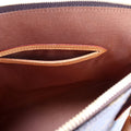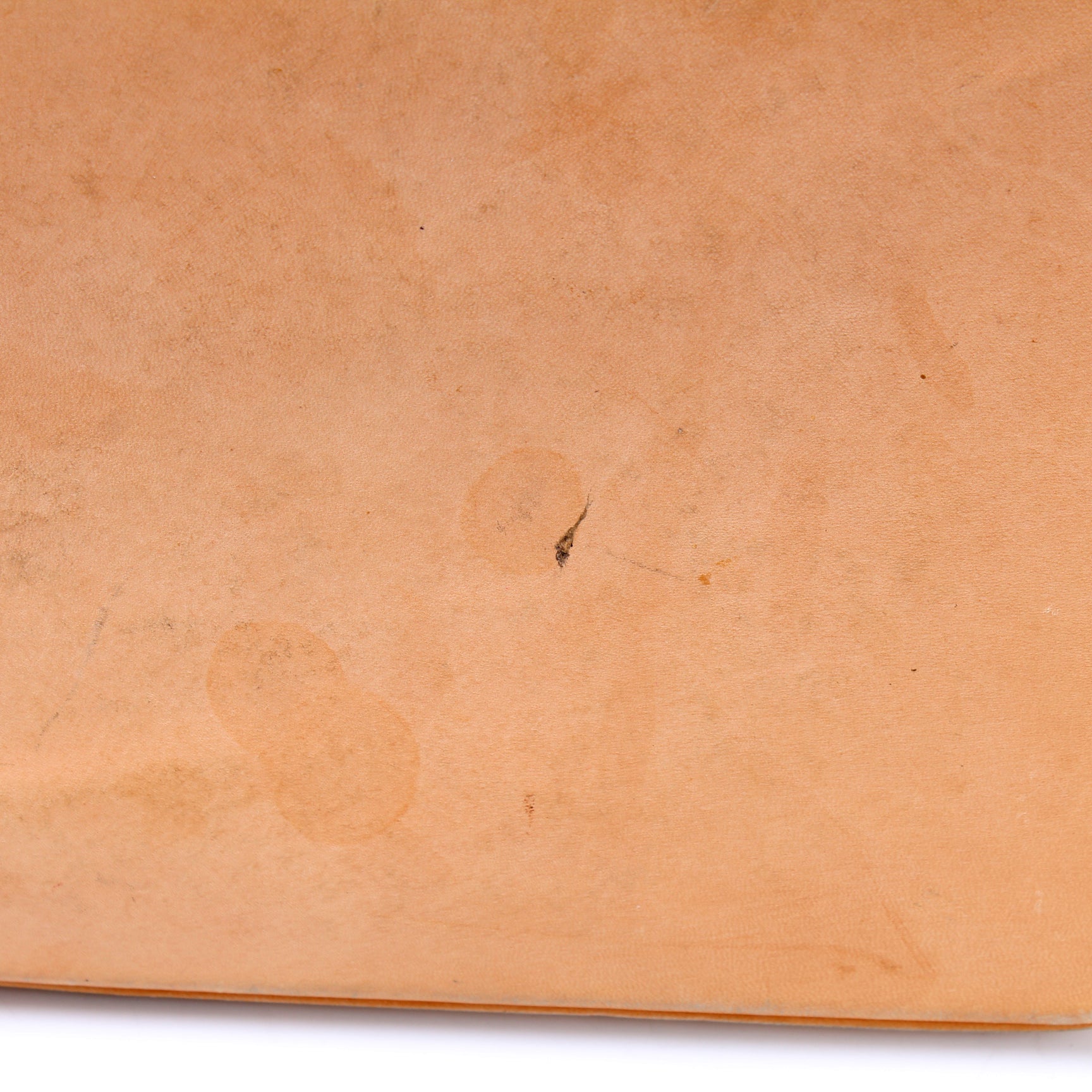 Exterior: The exterior canvas is free of any rips or cracks. The leather details, base, and corners show signs of wear and discoloration.