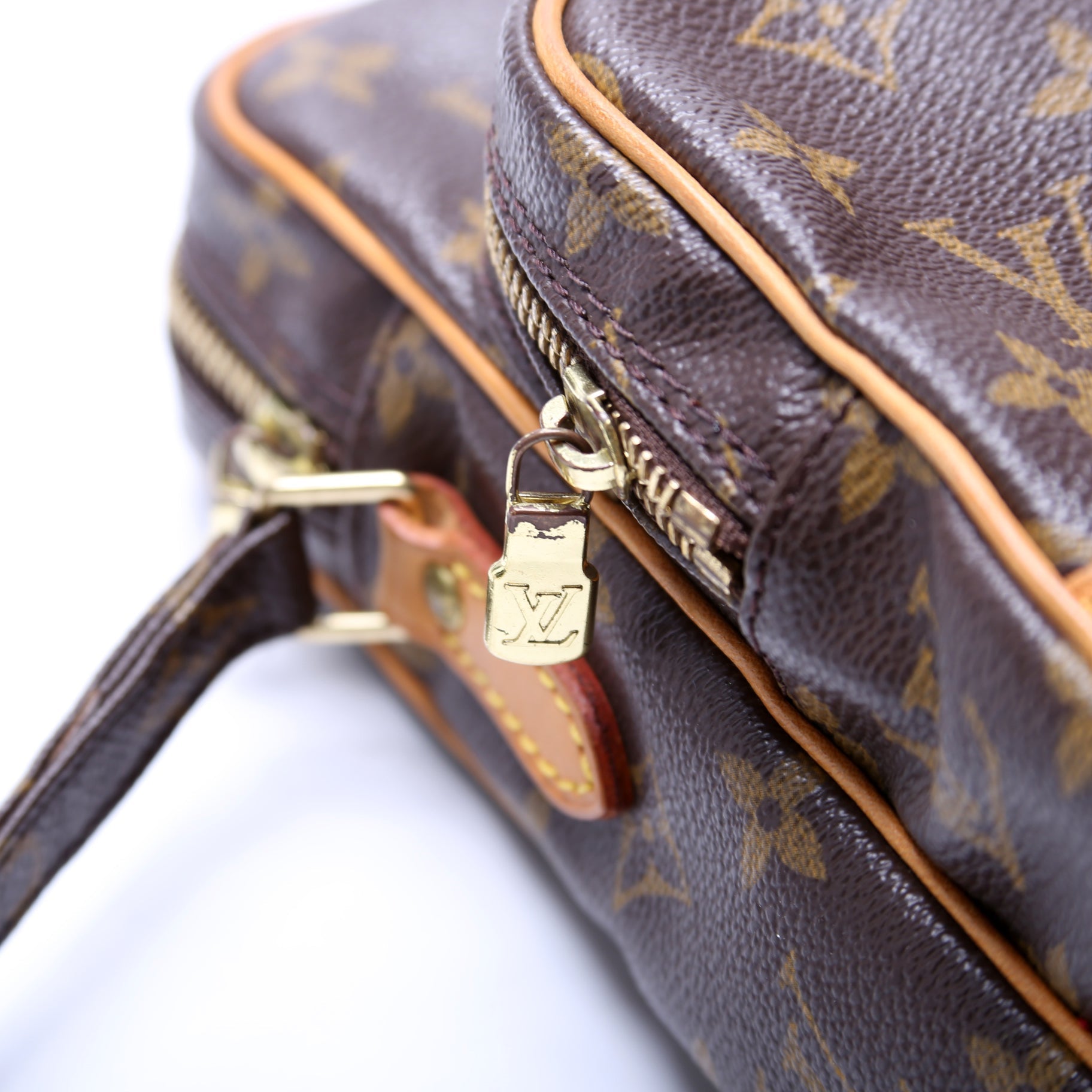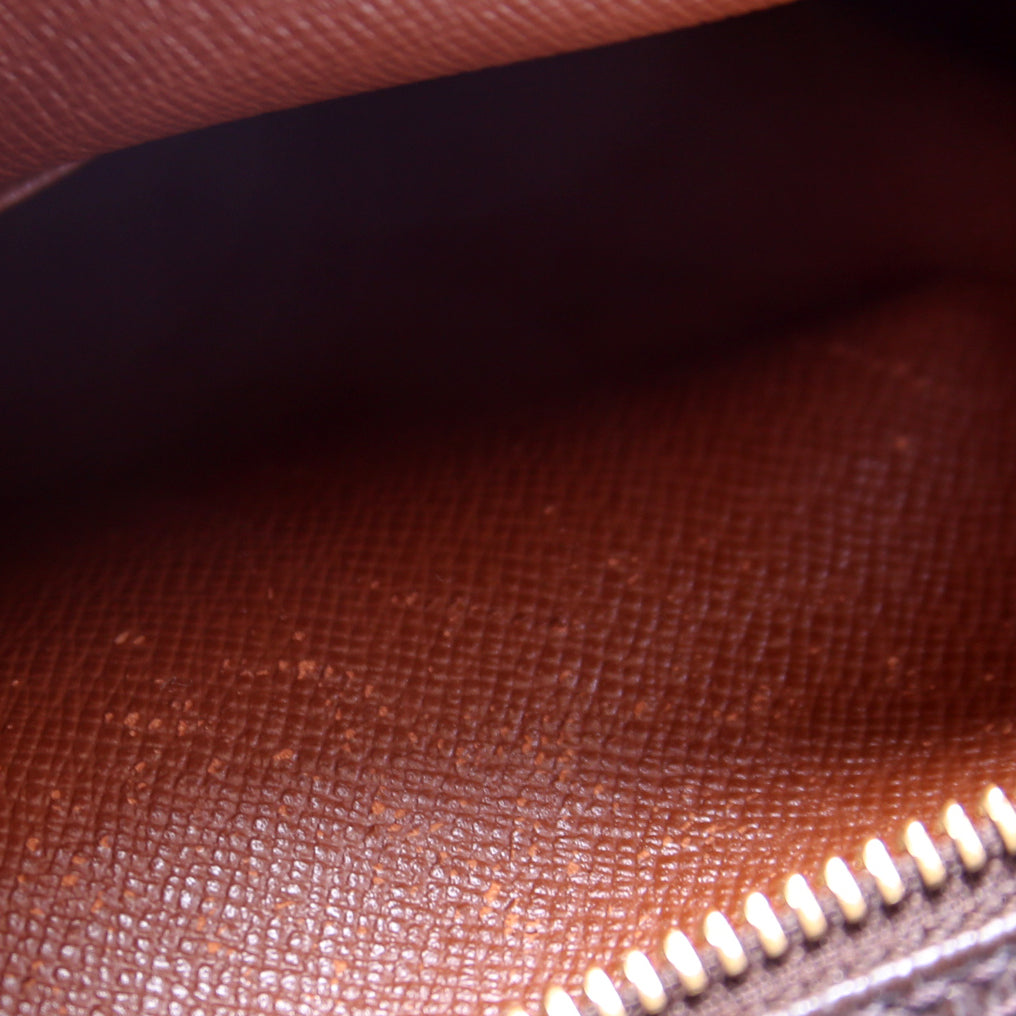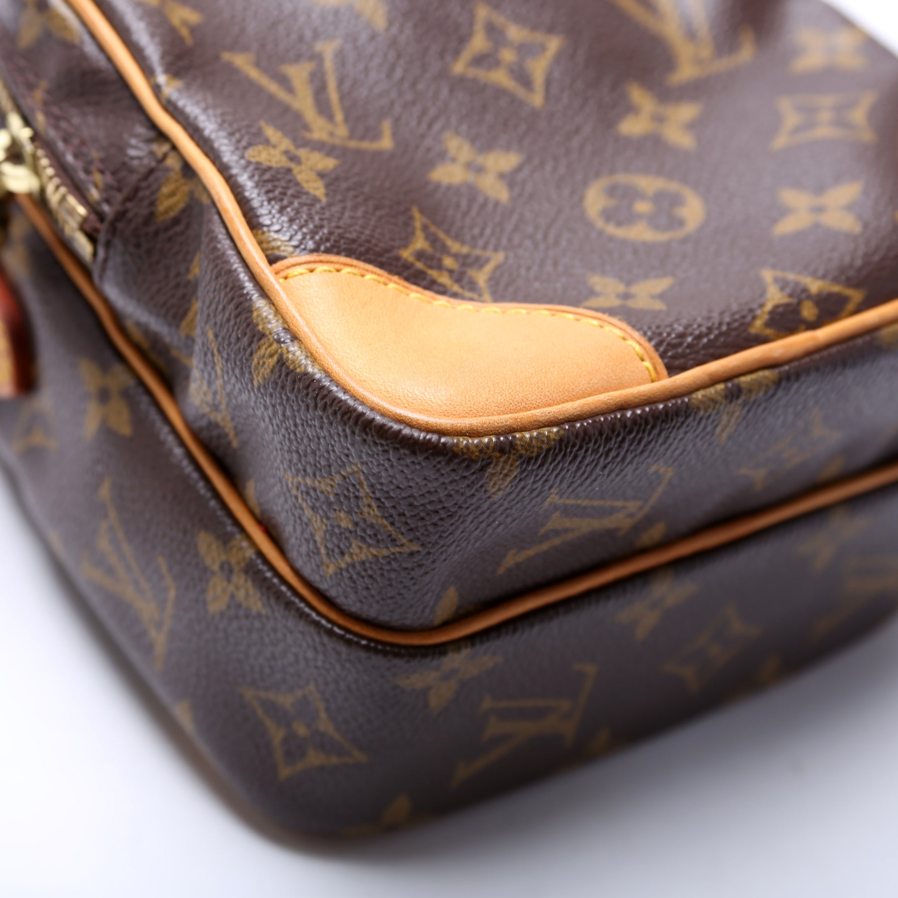 Exterior: The exterior coated canvas is free of any rips or cracks. The corners and leather details show minor signs of wear.