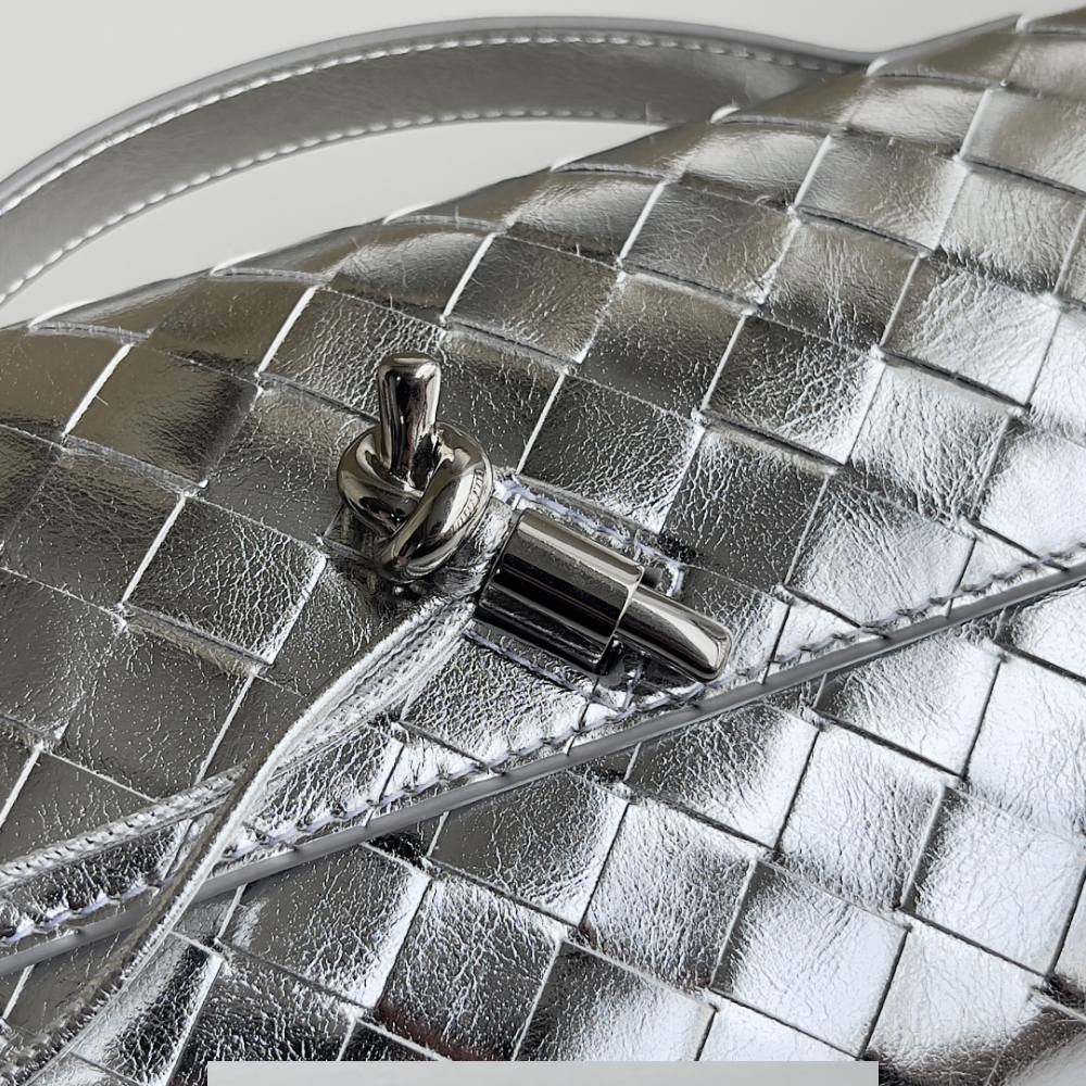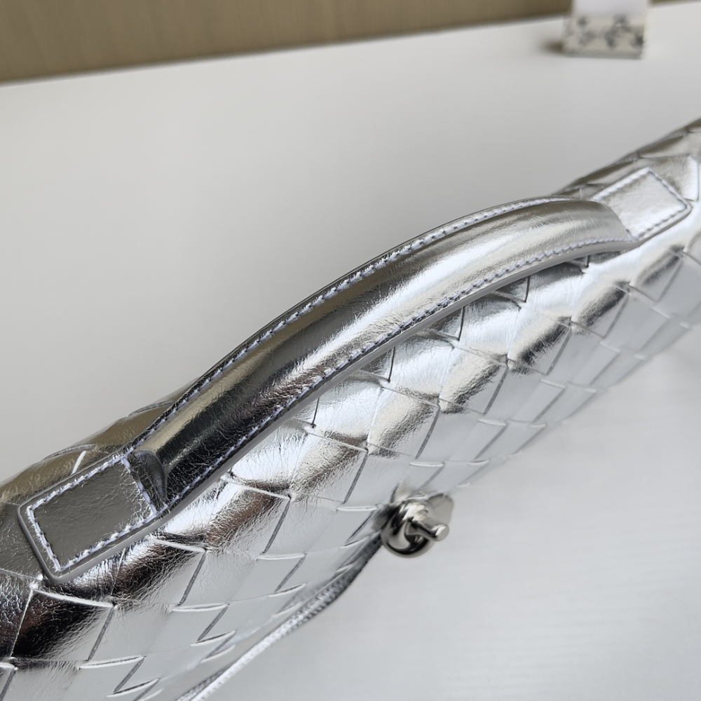 - Intrecciato foggy mirror leather top handle clutch with metallic knot closure