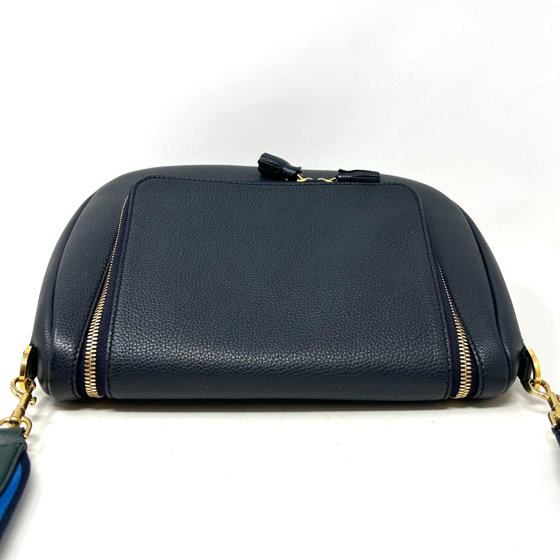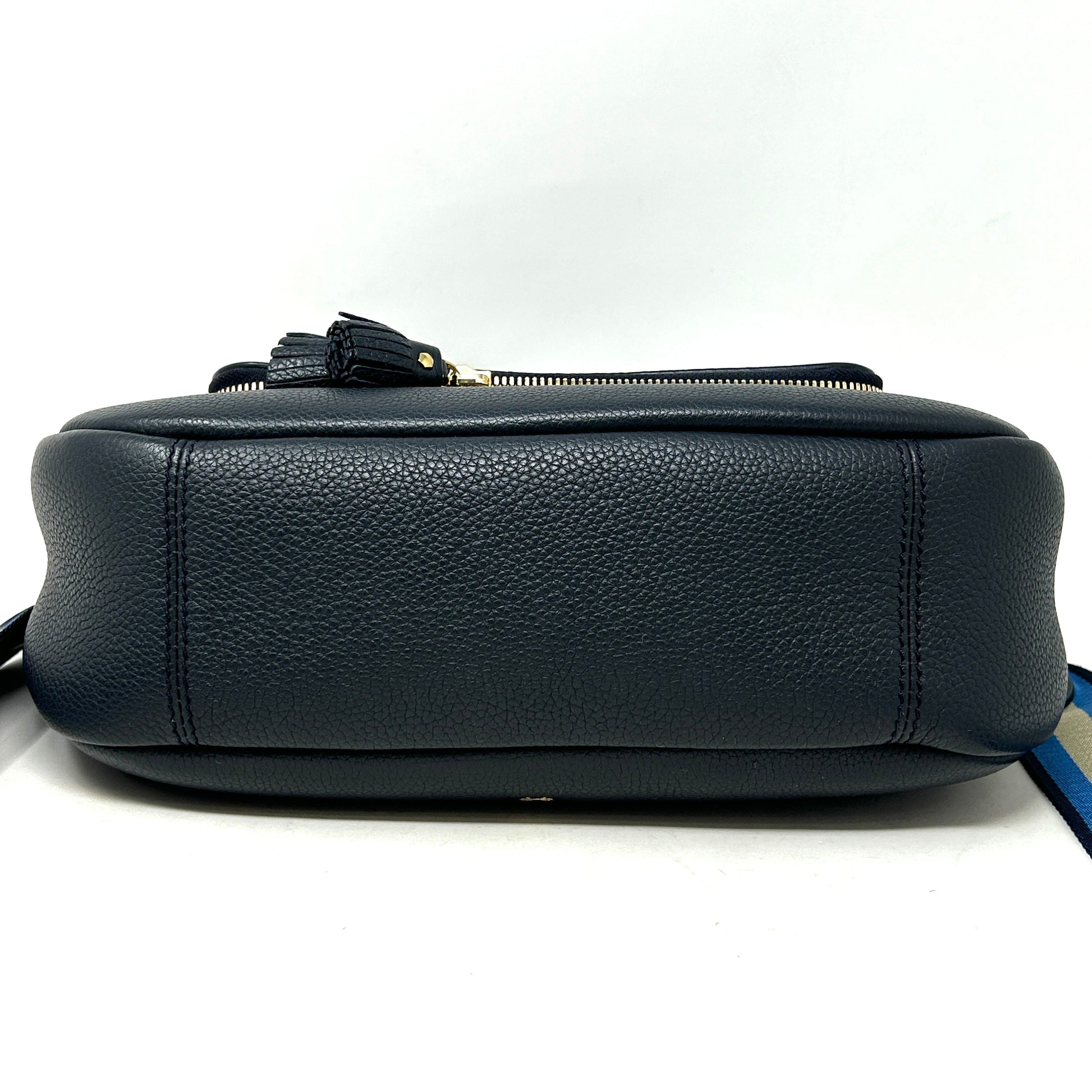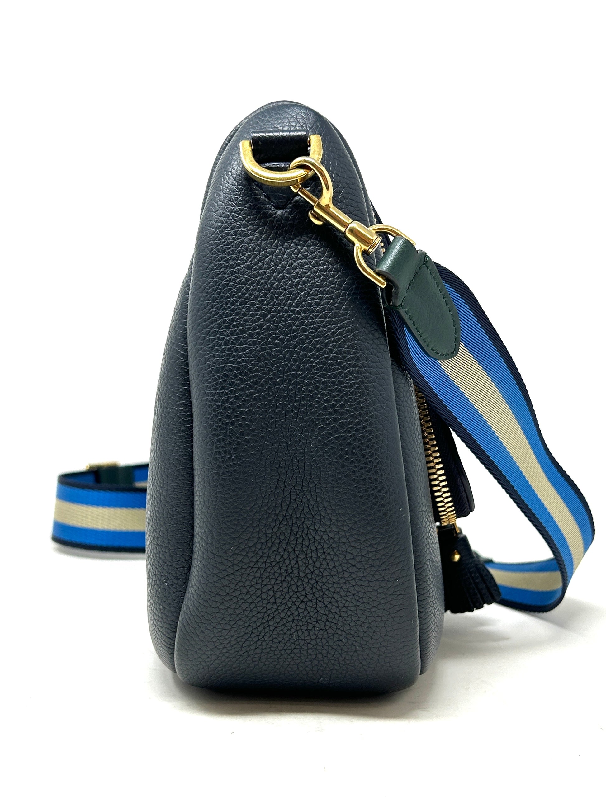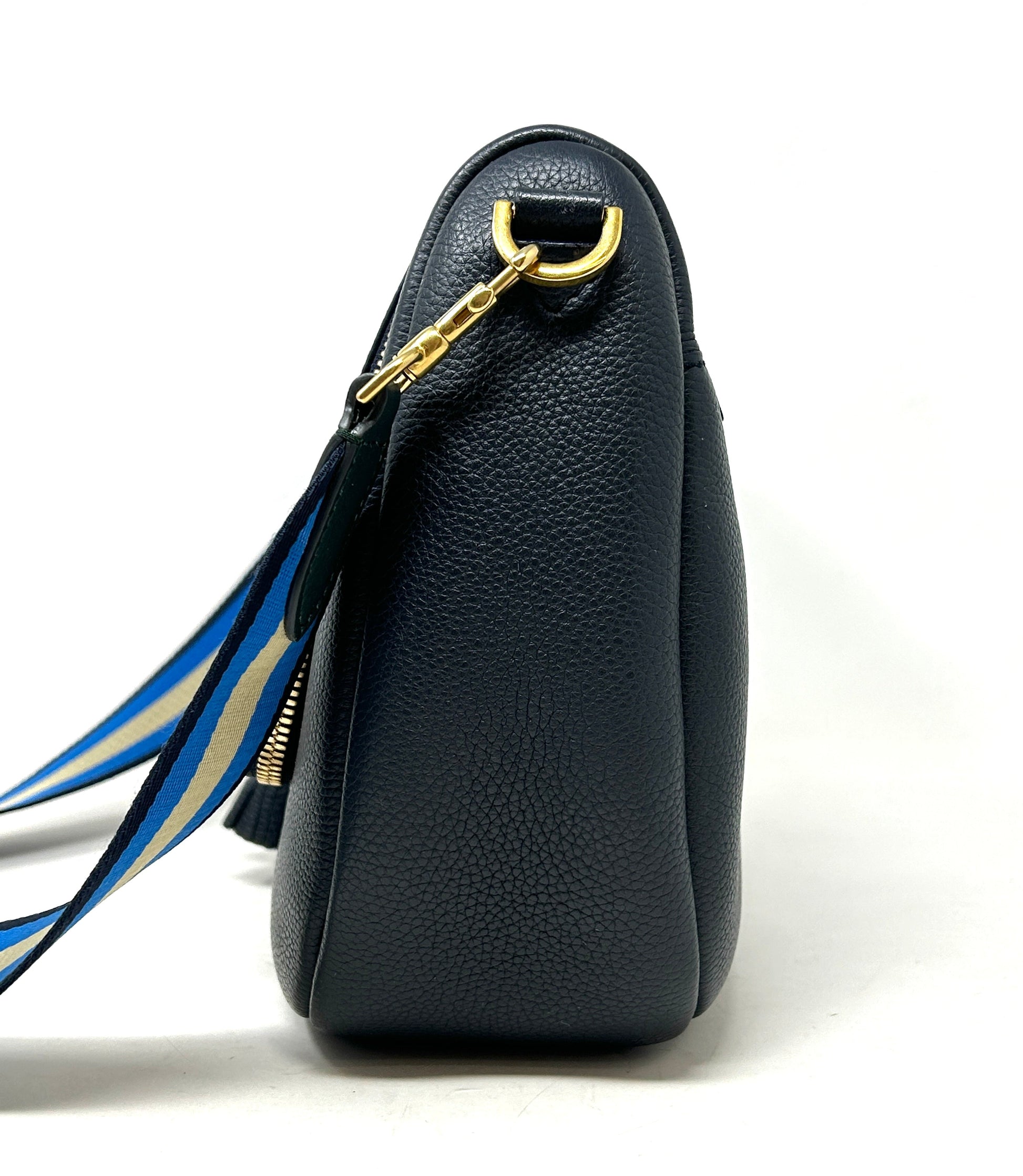 - Navy blue grained leather cross-body/shoulder bag featuring a satchel silhouette, fold over magnetic/two way zip closure, leather tassel pulls, gold tone hardware, detachable and adjustable blue and beige textile strap