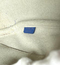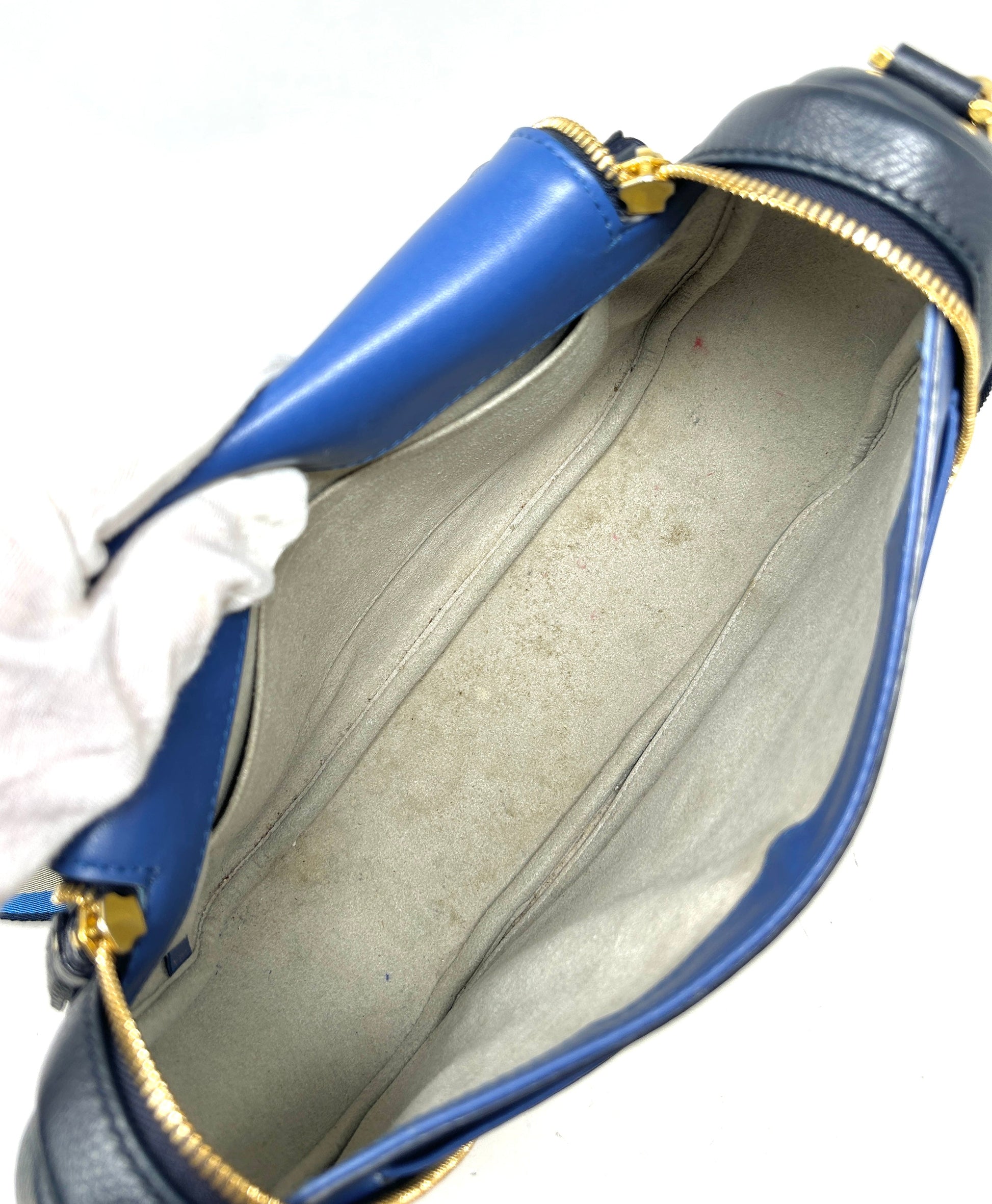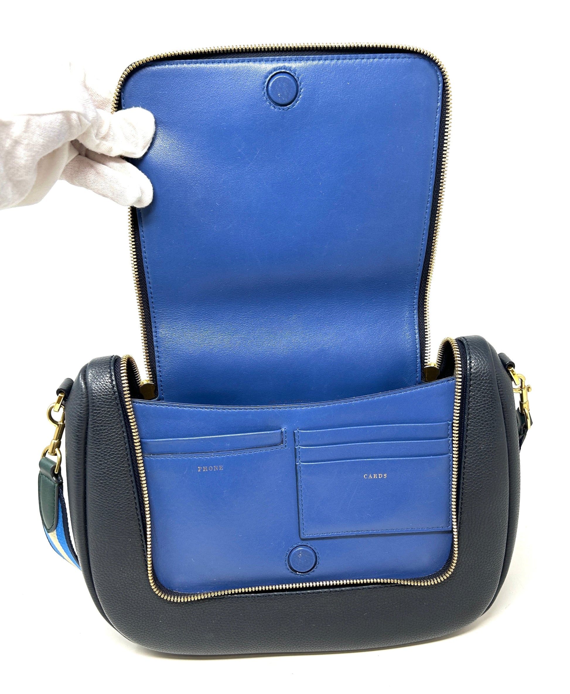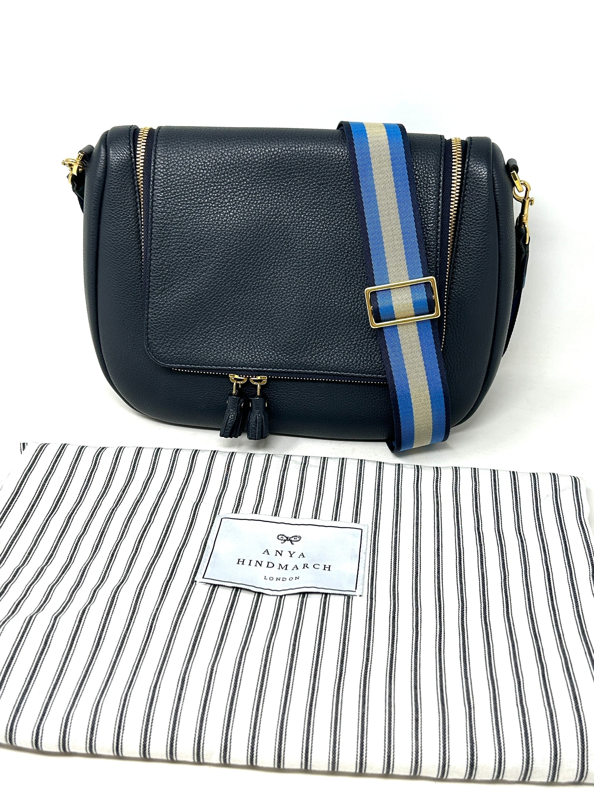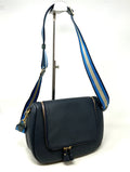 - Navy blue grained leather cross-body/shoulder bag featuring a satchel silhouette, fold over magnetic/two way zip closure, leather tassel pulls, gold tone hardware, detachable and adjustable blue and beige textile strap