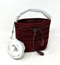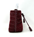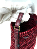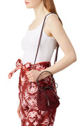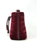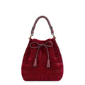 - Oxblood dark red woven velvet bucket bag featuring a drawstring closure with tassel detail, a top handle and a detachable cross-body/shoulder strap