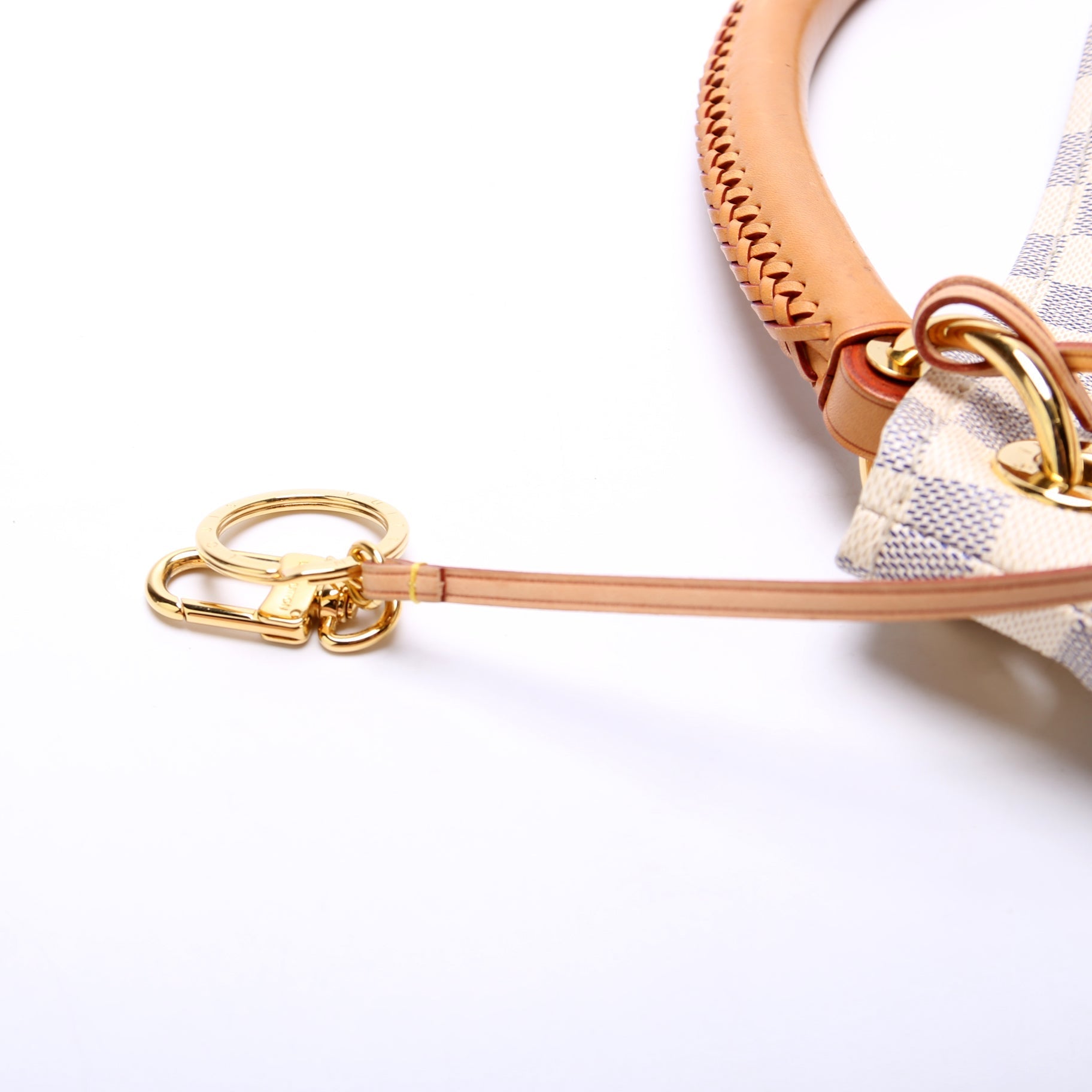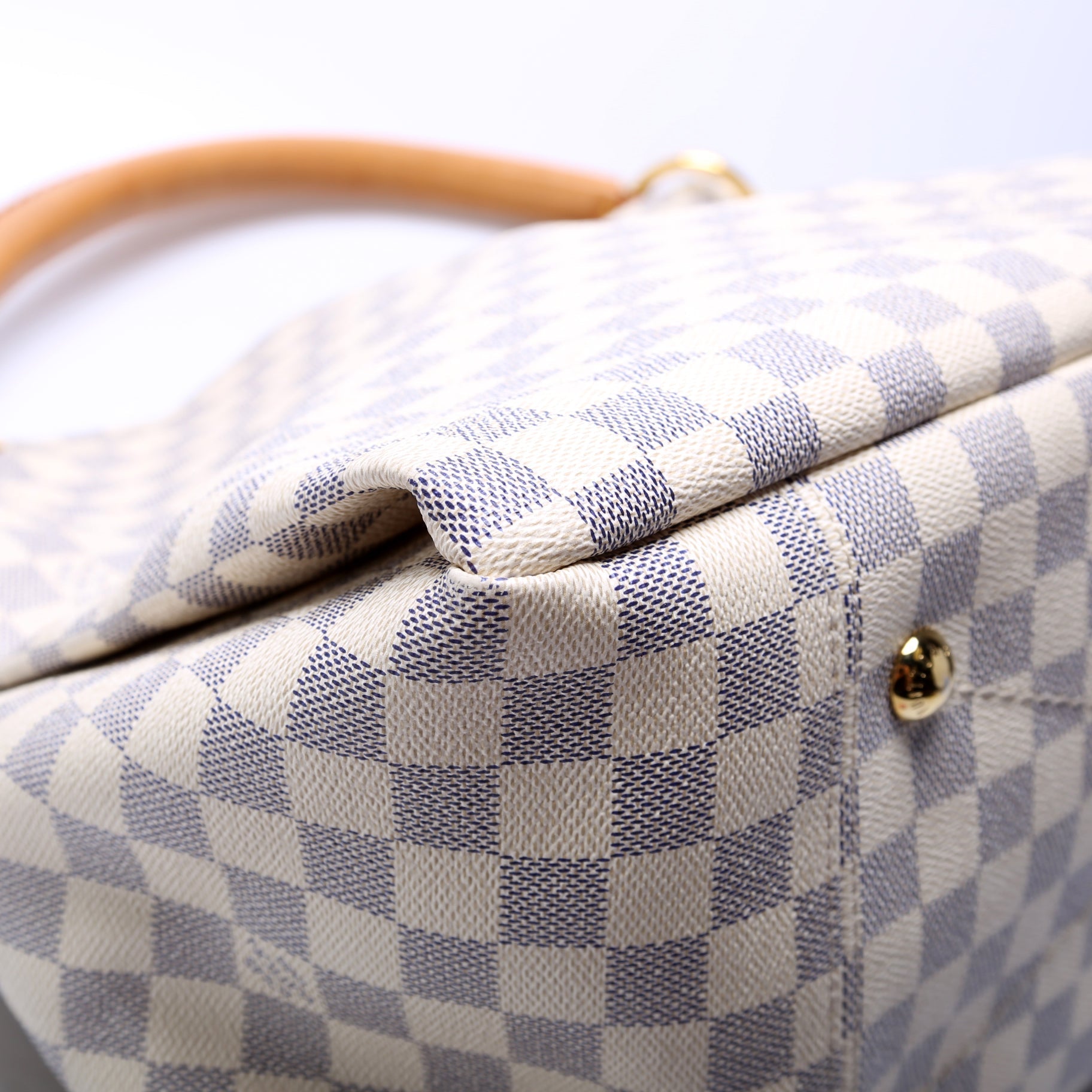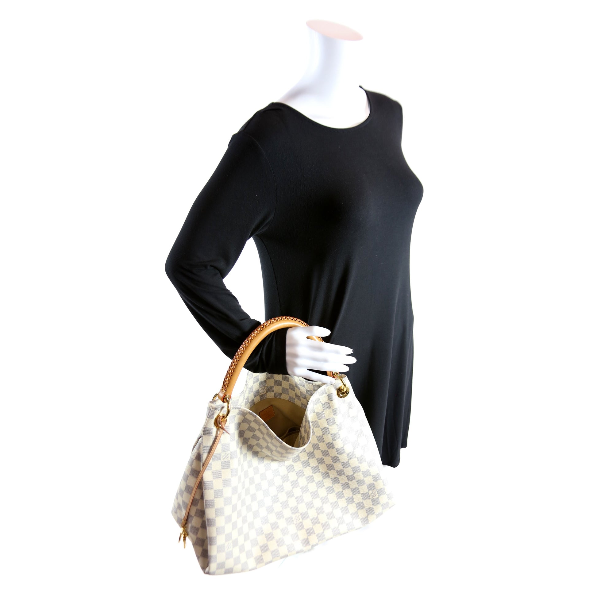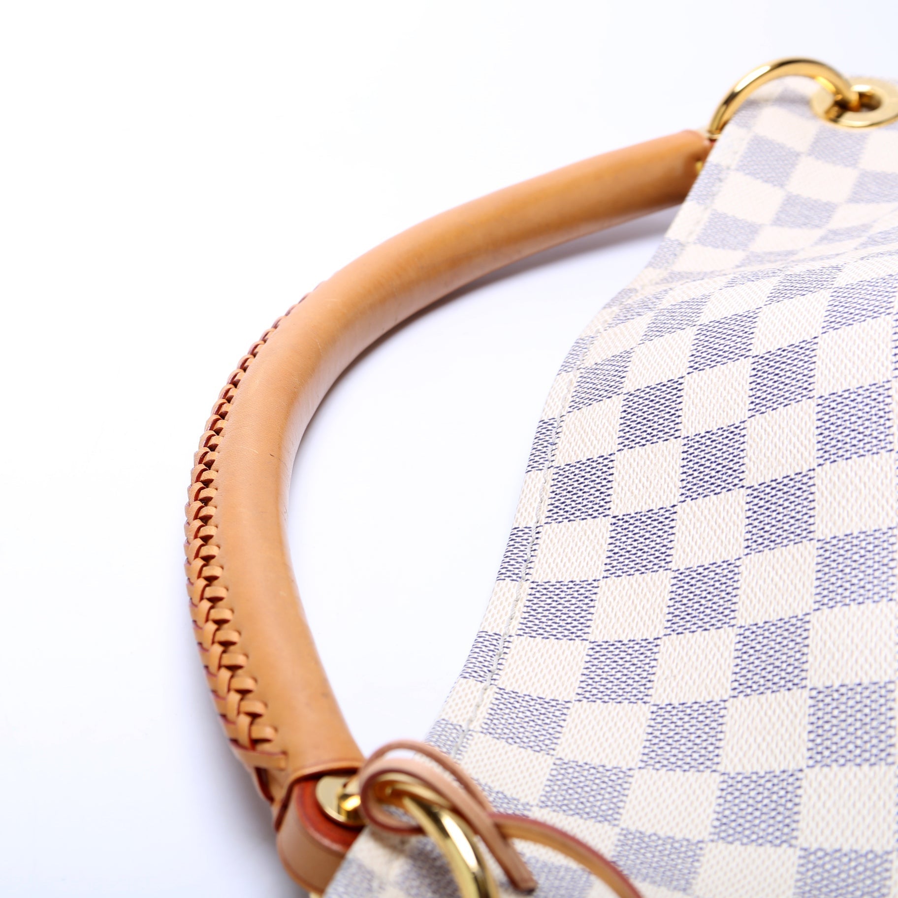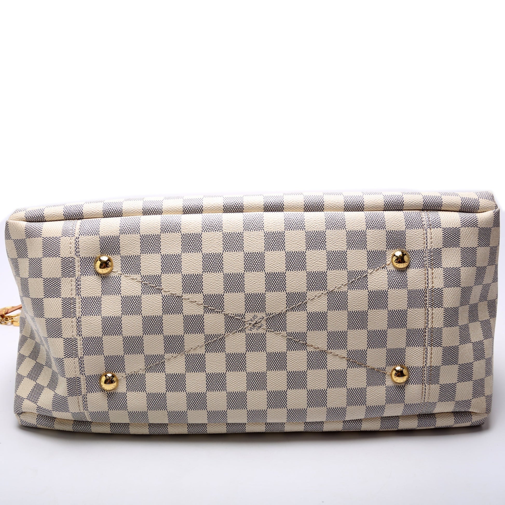 This Louis Vuitton Artsy MMis eye catching bag. The exterior is in the classic Louis Vuitton Damier Azur coated canvas.